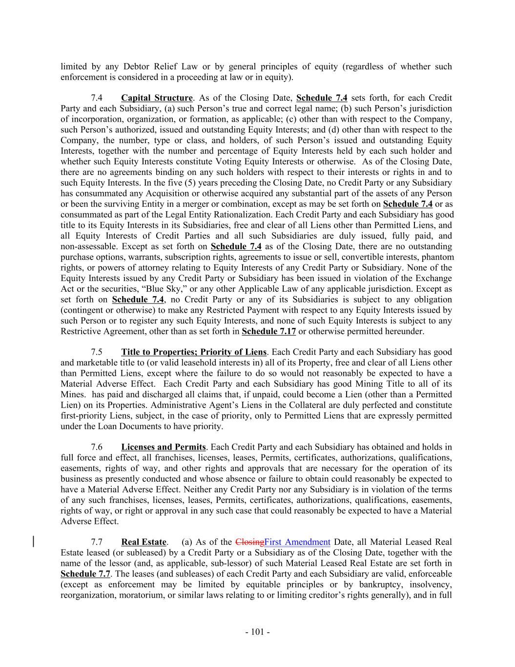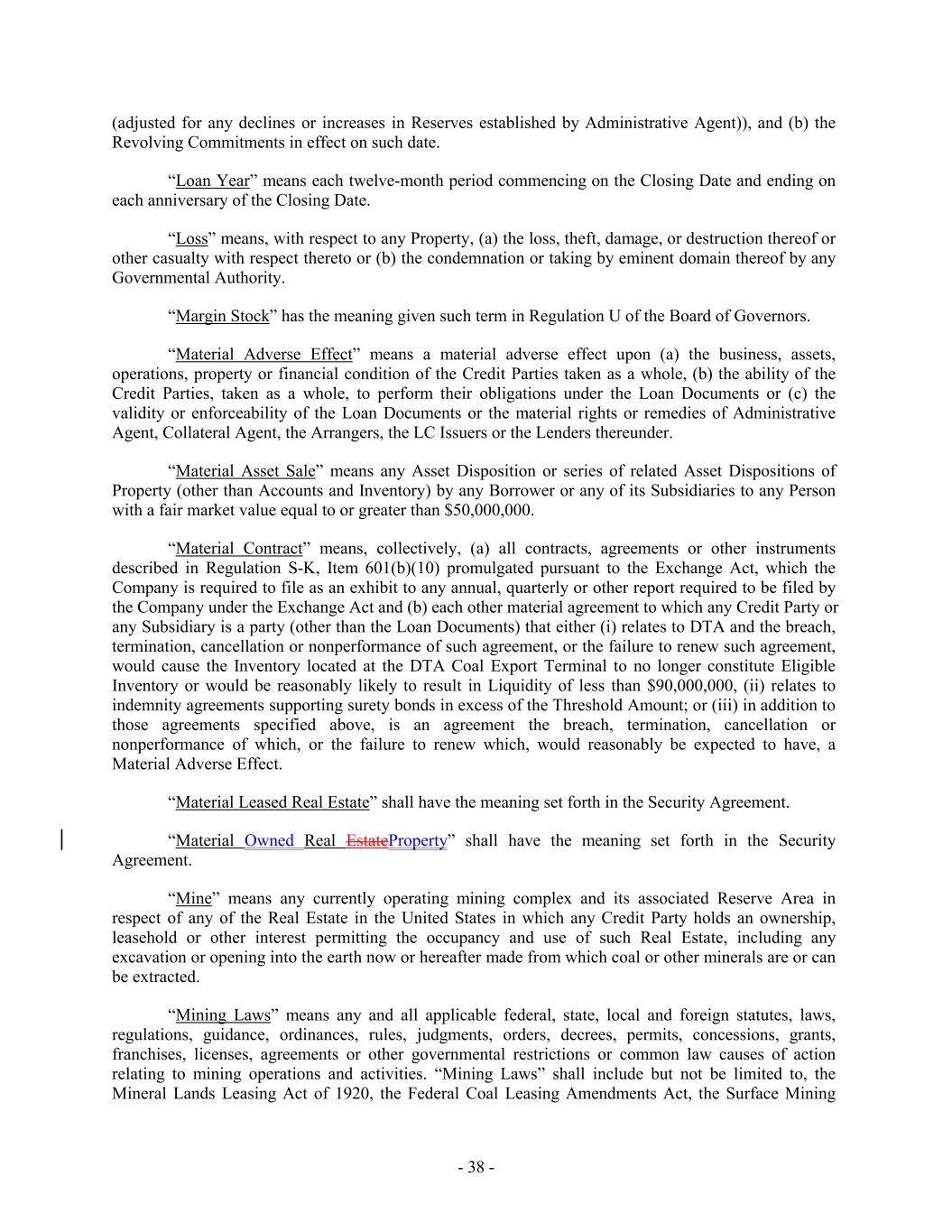 (adjusted for any declines or increases in Reserves established by Administrative Agent)), and (b) the Revolving Commitments in effect on such date. “Loan Year” means each twelve-month period commencing on the Closing Date and ending on each anniversary of the Closing Date. “Loss” means, with respect to any Property, (a) the loss, theft, damage, or destruction thereof or other casualty with respect thereto or (b) the condemnation or taking by eminent domain thereof by any Governmental Authority. “Margin Stock” has the meaning given such term in Regulation U of the Board of Governors. “Material Adverse Effect” means a material adverse effect upon (a) the business, assets, operations, property or financial condition of the Credit Parties taken as a whole, (b) the ability of the Credit Parties, taken as a whole, to perform their obligations under the Loan Documents or (c) the validity or enforceability of the Loan Documents or the material rights or remedies of Administrative Agent, Collateral Agent, the Arrangers, the LC Issuers or the Lenders thereunder. “Material Asset Sale” means any Asset Disposition or series of related Asset Dispositions of Property (other than Accounts and Inventory) by any Borrower or any of its Subsidiaries to any Person with a fair market value equal to or greater than $50,000,000. “Material Contract” means, collectively, (a) all contracts, agreements or other instruments described in Regulation S-K, Item 601(b)(10) promulgated pursuant to the Exchange Act, which the Company is required to file as an exhibit to any annual, quarterly or other report required to be filed by the Company under the Exchange Act and (b) each other material agreement to which any Credit Party or any Subsidiary is a party (other than the Loan Documents) that either (i) relates to DTA and the breach, termination, cancellation or nonperformance of such agreement, or the failure to renew such agreement, would cause the Inventory located at the DTA Coal Export Terminal to no longer constitute Eligible Inventory or would be reasonably likely to result in Liquidity of less than $90,000,000, (ii) relates to indemnity agreements supporting surety bonds in excess of the Threshold Amount; or (iii) in addition to those agreements specified above, is an agreement the breach, termination, cancellation or nonperformance of which, or the failure to renew which, would reasonably be expected to have, a Material Adverse Effect. “Material Leased Real Estate” shall have the meaning set forth in the Security Agreement. “Material Owned Real EstateProperty” shall have the meaning set forth in the Security Agreement. “Mine” means any currently operating mining complex and its associated Reserve Area in respect of any of the Real Estate in the United States in which any Credit Party holds an ownership, leasehold or other interest permitting the occupancy and use of such Real Estate, including any excavation or opening into the earth now or hereafter made from which coal or other minerals are or can be extracted. “Mining Laws” means any and all applicable federal, state, local and foreign statutes, laws, regulations, guidance, ordinances, rules, judgments, orders, decrees, permits, concessions, grants, franchises, licenses, agreements or other governmental restrictions or common law causes of action relating to mining operations and activities. “Mining Laws” shall include but not be limited to, the Mineral Lands Leasing Act of 1920, the Federal Coal Leasing Amendments Act, the Surface Mining - 38 -