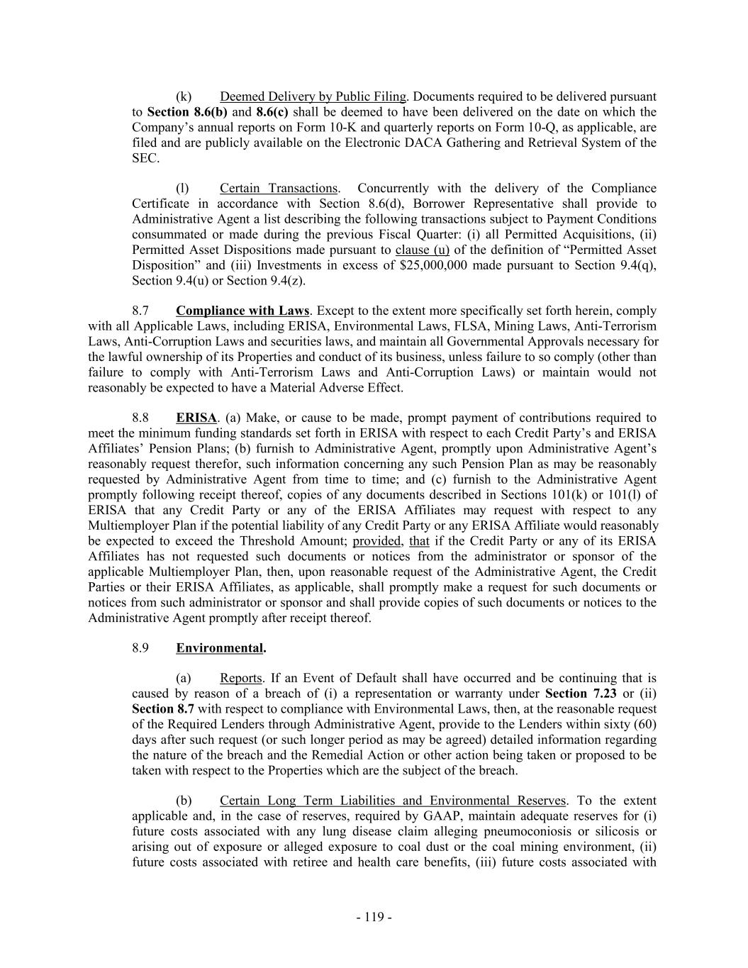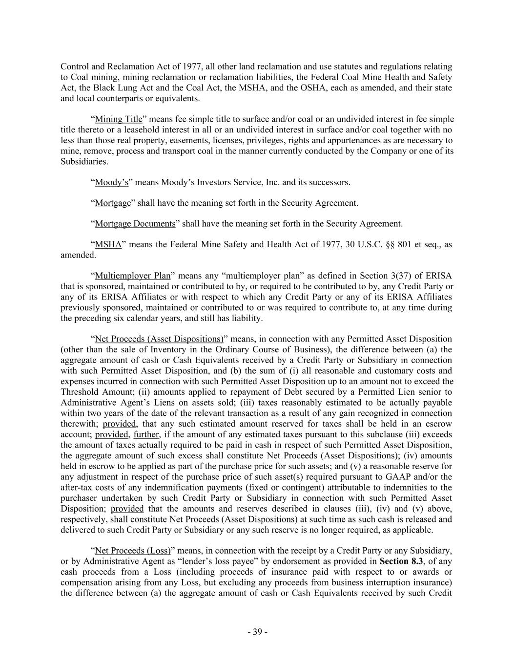 Control and Reclamation Act of 1977, all other land reclamation and use statutes and regulations relating to Coal mining, mining reclamation or reclamation liabilities, the Federal Coal Mine Health and Safety Act, the Black Lung Act and the Coal Act, the MSHA, and the OSHA, each as amended, and their state and local counterparts or equivalents. “Mining Title” means fee simple title to surface and/or coal or an undivided interest in fee simple title thereto or a leasehold interest in all or an undivided interest in surface and/or coal together with no less than those real property, easements, licenses, privileges, rights and appurtenances as are necessary to mine, remove, process and transport coal in the manner currently conducted by the Company or one of its Subsidiaries. “Moody’s” means Moody’s Investors Service, Inc. and its successors. “Mortgage” shall have the meaning set forth in the Security Agreement. “Mortgage Documents” shall have the meaning set forth in the Security Agreement. “MSHA” means the Federal Mine Safety and Health Act of 1977, 30 U.S.C. §§ 801 et seq., as amended. “Multiemployer Plan” means any “multiemployer plan” as defined in Section 3(37) of ERISA that is sponsored, maintained or contributed to by, or required to be contributed to by, any Credit Party or any of its ERISA Affiliates or with respect to which any Credit Party or any of its ERISA Affiliates previously sponsored, maintained or contributed to or was required to contribute to, at any time during the preceding six calendar years, and still has liability. “Net Proceeds (Asset Dispositions)” means, in connection with any Permitted Asset Disposition (other than the sale of Inventory in the Ordinary Course of Business), the difference between (a) the aggregate amount of cash or Cash Equivalents received by a Credit Party or Subsidiary in connection with such Permitted Asset Disposition, and (b) the sum of (i) all reasonable and customary costs and expenses incurred in connection with such Permitted Asset Disposition up to an amount not to exceed the Threshold Amount; (ii) amounts applied to repayment of Debt secured by a Permitted Lien senior to Administrative Agent’s Liens on assets sold; (iii) taxes reasonably estimated to be actually payable within two years of the date of the relevant transaction as a result of any gain recognized in connection therewith; provided, that any such estimated amount reserved for taxes shall be held in an escrow account; provided, further, if the amount of any estimated taxes pursuant to this subclause (iii) exceeds the amount of taxes actually required to be paid in cash in respect of such Permitted Asset Disposition, the aggregate amount of such excess shall constitute Net Proceeds (Asset Dispositions); (iv) amounts held in escrow to be applied as part of the purchase price for such assets; and (v) a reasonable reserve for any adjustment in respect of the purchase price of such asset(s) required pursuant to GAAP and/or the after-tax costs of any indemnification payments (fixed or contingent) attributable to indemnities to the purchaser undertaken by such Credit Party or Subsidiary in connection with such Permitted Asset Disposition; provided that the amounts and reserves described in clauses (iii), (iv) and (v) above, respectively, shall constitute Net Proceeds (Asset Dispositions) at such time as such cash is released and delivered to such Credit Party or Subsidiary or any such reserve is no longer required, as applicable. “Net Proceeds (Loss)” means, in connection with the receipt by a Credit Party or any Subsidiary, or by Administrative Agent as “lender’s loss payee” by endorsement as provided in Section 8.3, of any cash proceeds from a Loss (including proceeds of insurance paid with respect to or awards or compensation arising from any Loss, but excluding any proceeds from business interruption insurance) the difference between (a) the aggregate amount of cash or Cash Equivalents received by such Credit - 39 -
