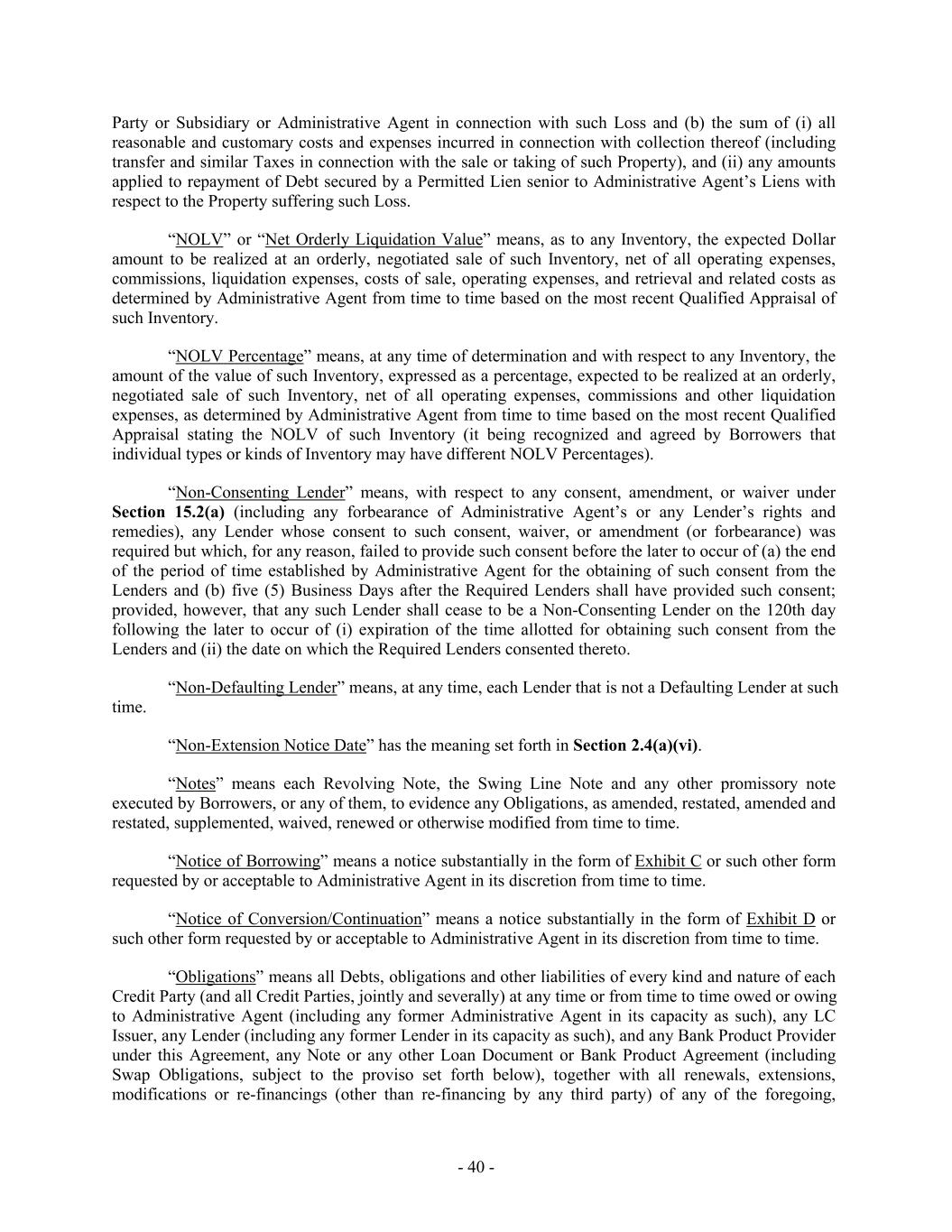 Party or Subsidiary or Administrative Agent in connection with such Loss and (b) the sum of (i) all reasonable and customary costs and expenses incurred in connection with collection thereof (including transfer and similar Taxes in connection with the sale or taking of such Property), and (ii) any amounts applied to repayment of Debt secured by a Permitted Lien senior to Administrative Agent’s Liens with respect to the Property suffering such Loss. “NOLV” or “Net Orderly Liquidation Value” means, as to any Inventory, the expected Dollar amount to be realized at an orderly, negotiated sale of such Inventory, net of all operating expenses, commissions, liquidation expenses, costs of sale, operating expenses, and retrieval and related costs as determined by Administrative Agent from time to time based on the most recent Qualified Appraisal of such Inventory. “NOLV Percentage” means, at any time of determination and with respect to any Inventory, the amount of the value of such Inventory, expressed as a percentage, expected to be realized at an orderly, negotiated sale of such Inventory, net of all operating expenses, commissions and other liquidation expenses, as determined by Administrative Agent from time to time based on the most recent Qualified Appraisal stating the NOLV of such Inventory (it being recognized and agreed by Borrowers that individual types or kinds of Inventory may have different NOLV Percentages). “Non-Consenting Lender” means, with respect to any consent, amendment, or waiver under Section 15.2(a) (including any forbearance of Administrative Agent’s or any Lender’s rights and remedies), any Lender whose consent to such consent, waiver, or amendment (or forbearance) was required but which, for any reason, failed to provide such consent before the later to occur of (a) the end of the period of time established by Administrative Agent for the obtaining of such consent from the Lenders and (b) five (5) Business Days after the Required Lenders shall have provided such consent; provided, however, that any such Lender shall cease to be a Non-Consenting Lender on the 120th day following the later to occur of (i) expiration of the time allotted for obtaining such consent from the Lenders and (ii) the date on which the Required Lenders consented thereto. “Non-Defaulting Lender” means, at any time, each Lender that is not a Defaulting Lender at such time. “Non-Extension Notice Date” has the meaning set forth in Section 2.4(a)(vi). “Notes” means each Revolving Note, the Swing Line Note and any other promissory note executed by Borrowers, or any of them, to evidence any Obligations, as amended, restated, amended and restated, supplemented, waived, renewed or otherwise modified from time to time. “Notice of Borrowing” means a notice substantially in the form of Exhibit C or such other form requested by or acceptable to Administrative Agent in its discretion from time to time. “Notice of Conversion/Continuation” means a notice substantially in the form of Exhibit D or such other form requested by or acceptable to Administrative Agent in its discretion from time to time. “Obligations” means all Debts, obligations and other liabilities of every kind and nature of each Credit Party (and all Credit Parties, jointly and severally) at any time or from time to time owed or owing to Administrative Agent (including any former Administrative Agent in its capacity as such), any LC Issuer, any Lender (including any former Lender in its capacity as such), and any Bank Product Provider under this Agreement, any Note or any other Loan Document or Bank Product Agreement (including Swap Obligations, subject to the proviso set forth below), together with all renewals, extensions, modifications or re-financings (other than re-financing by any third party) of any of the foregoing, - 40 -