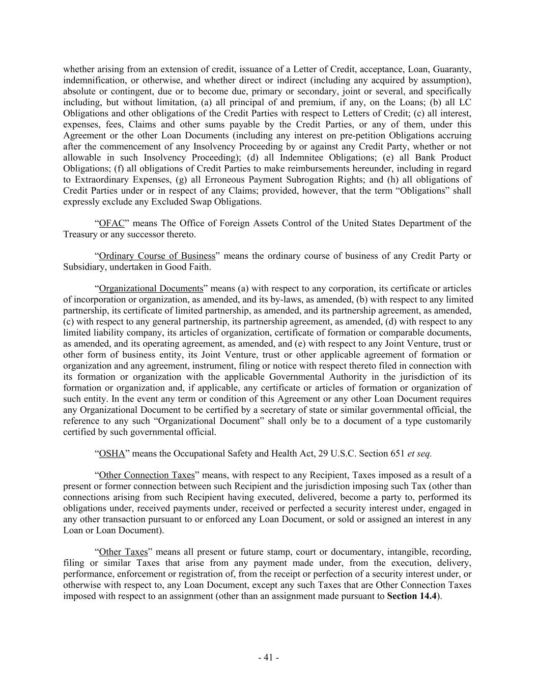 whether arising from an extension of credit, issuance of a Letter of Credit, acceptance, Loan, Guaranty, indemnification, or otherwise, and whether direct or indirect (including any acquired by assumption), absolute or contingent, due or to become due, primary or secondary, joint or several, and specifically including, but without limitation, (a) all principal of and premium, if any, on the Loans; (b) all LC Obligations and other obligations of the Credit Parties with respect to Letters of Credit; (c) all interest, expenses, fees, Claims and other sums payable by the Credit Parties, or any of them, under this Agreement or the other Loan Documents (including any interest on pre-petition Obligations accruing after the commencement of any Insolvency Proceeding by or against any Credit Party, whether or not allowable in such Insolvency Proceeding); (d) all Indemnitee Obligations; (e) all Bank Product Obligations; (f) all obligations of Credit Parties to make reimbursements hereunder, including in regard to Extraordinary Expenses, (g) all Erroneous Payment Subrogation Rights; and (h) all obligations of Credit Parties under or in respect of any Claims; provided, however, that the term “Obligations” shall expressly exclude any Excluded Swap Obligations. “OFAC” means The Office of Foreign Assets Control of the United States Department of the Treasury or any successor thereto. “Ordinary Course of Business” means the ordinary course of business of any Credit Party or Subsidiary, undertaken in Good Faith. “Organizational Documents” means (a) with respect to any corporation, its certificate or articles of incorporation or organization, as amended, and its by-laws, as amended, (b) with respect to any limited partnership, its certificate of limited partnership, as amended, and its partnership agreement, as amended, (c) with respect to any general partnership, its partnership agreement, as amended, (d) with respect to any limited liability company, its articles of organization, certificate of formation or comparable documents, as amended, and its operating agreement, as amended, and (e) with respect to any Joint Venture, trust or other form of business entity, its Joint Venture, trust or other applicable agreement of formation or organization and any agreement, instrument, filing or notice with respect thereto filed in connection with its formation or organization with the applicable Governmental Authority in the jurisdiction of its formation or organization and, if applicable, any certificate or articles of formation or organization of such entity. In the event any term or condition of this Agreement or any other Loan Document requires any Organizational Document to be certified by a secretary of state or similar governmental official, the reference to any such “Organizational Document” shall only be to a document of a type customarily certified by such governmental official. “OSHA” means the Occupational Safety and Health Act, 29 U.S.C. Section 651 et seq. “Other Connection Taxes” means, with respect to any Recipient, Taxes imposed as a result of a present or former connection between such Recipient and the jurisdiction imposing such Tax (other than connections arising from such Recipient having executed, delivered, become a party to, performed its obligations under, received payments under, received or perfected a security interest under, engaged in any other transaction pursuant to or enforced any Loan Document, or sold or assigned an interest in any Loan or Loan Document). “Other Taxes” means all present or future stamp, court or documentary, intangible, recording, filing or similar Taxes that arise from any payment made under, from the execution, delivery, performance, enforcement or registration of, from the receipt or perfection of a security interest under, or otherwise with respect to, any Loan Document, except any such Taxes that are Other Connection Taxes imposed with respect to an assignment (other than an assignment made pursuant to Section 14.4). - 41 -
