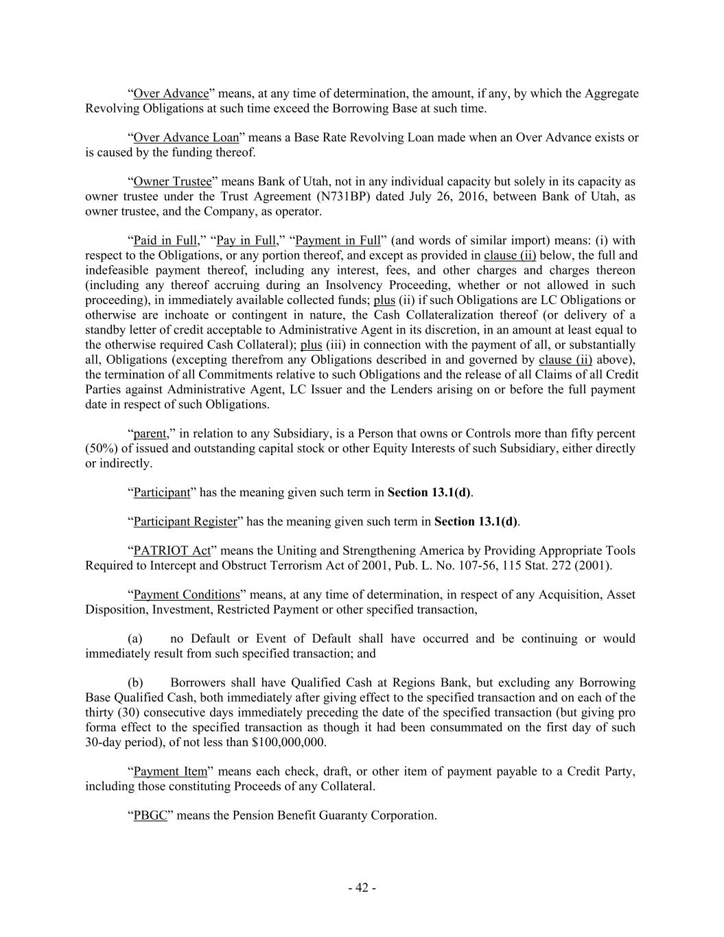 “Over Advance” means, at any time of determination, the amount, if any, by which the Aggregate Revolving Obligations at such time exceed the Borrowing Base at such time. “Over Advance Loan” means a Base Rate Revolving Loan made when an Over Advance exists or is caused by the funding thereof. “Owner Trustee” means Bank of Utah, not in any individual capacity but solely in its capacity as owner trustee under the Trust Agreement (N731BP) dated July 26, 2016, between Bank of Utah, as owner trustee, and the Company, as operator. “Paid in Full,” “Pay in Full,” “Payment in Full” (and words of similar import) means: (i) with respect to the Obligations, or any portion thereof, and except as provided in clause (ii) below, the full and indefeasible payment thereof, including any interest, fees, and other charges and charges thereon (including any thereof accruing during an Insolvency Proceeding, whether or not allowed in such proceeding), in immediately available collected funds; plus (ii) if such Obligations are LC Obligations or otherwise are inchoate or contingent in nature, the Cash Collateralization thereof (or delivery of a standby letter of credit acceptable to Administrative Agent in its discretion, in an amount at least equal to the otherwise required Cash Collateral); plus (iii) in connection with the payment of all, or substantially all, Obligations (excepting therefrom any Obligations described in and governed by clause (ii) above), the termination of all Commitments relative to such Obligations and the release of all Claims of all Credit Parties against Administrative Agent, LC Issuer and the Lenders arising on or before the full payment date in respect of such Obligations. “parent,” in relation to any Subsidiary, is a Person that owns or Controls more than fifty percent (50%) of issued and outstanding capital stock or other Equity Interests of such Subsidiary, either directly or indirectly. “Participant” has the meaning given such term in Section 13.1(d). “Participant Register” has the meaning given such term in Section 13.1(d). “PATRIOT Act” means the Uniting and Strengthening America by Providing Appropriate Tools Required to Intercept and Obstruct Terrorism Act of 2001, Pub. L. No. 107-56, 115 Stat. 272 (2001). “Payment Conditions” means, at any time of determination, in respect of any Acquisition, Asset Disposition, Investment, Restricted Payment or other specified transaction, (a) no Default or Event of Default shall have occurred and be continuing or would immediately result from such specified transaction; and (b) Borrowers shall have Qualified Cash at Regions Bank, but excluding any Borrowing Base Qualified Cash, both immediately after giving effect to the specified transaction and on each of the thirty (30) consecutive days immediately preceding the date of the specified transaction (but giving pro forma effect to the specified transaction as though it had been consummated on the first day of such 30-day period), of not less than $100,000,000. “Payment Item” means each check, draft, or other item of payment payable to a Credit Party, including those constituting Proceeds of any Collateral. “PBGC” means the Pension Benefit Guaranty Corporation. - 42 -