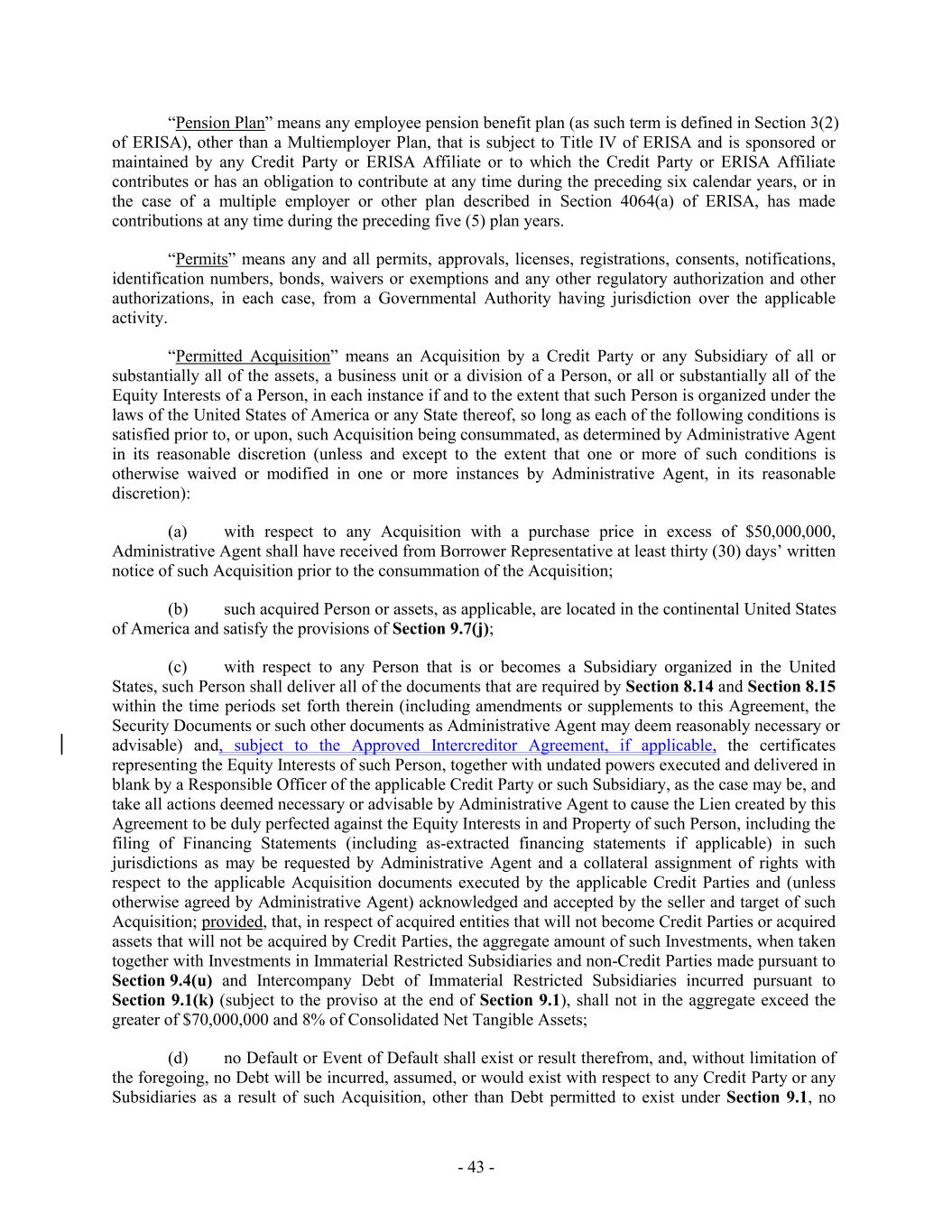 “Pension Plan” means any employee pension benefit plan (as such term is defined in Section 3(2) of ERISA), other than a Multiemployer Plan, that is subject to Title IV of ERISA and is sponsored or maintained by any Credit Party or ERISA Affiliate or to which the Credit Party or ERISA Affiliate contributes or has an obligation to contribute at any time during the preceding six calendar years, or in the case of a multiple employer or other plan described in Section 4064(a) of ERISA, has made contributions at any time during the preceding five (5) plan years. “Permits” means any and all permits, approvals, licenses, registrations, consents, notifications, identification numbers, bonds, waivers or exemptions and any other regulatory authorization and other authorizations, in each case, from a Governmental Authority having jurisdiction over the applicable activity. “Permitted Acquisition” means an Acquisition by a Credit Party or any Subsidiary of all or substantially all of the assets, a business unit or a division of a Person, or all or substantially all of the Equity Interests of a Person, in each instance if and to the extent that such Person is organized under the laws of the United States of America or any State thereof, so long as each of the following conditions is satisfied prior to, or upon, such Acquisition being consummated, as determined by Administrative Agent in its reasonable discretion (unless and except to the extent that one or more of such conditions is otherwise waived or modified in one or more instances by Administrative Agent, in its reasonable discretion): (a) with respect to any Acquisition with a purchase price in excess of $50,000,000, Administrative Agent shall have received from Borrower Representative at least thirty (30) days’ written notice of such Acquisition prior to the consummation of the Acquisition; (b) such acquired Person or assets, as applicable, are located in the continental United States of America and satisfy the provisions of Section 9.7(j); (c) with respect to any Person that is or becomes a Subsidiary organized in the United States, such Person shall deliver all of the documents that are required by Section 8.14 and Section 8.15 within the time periods set forth therein (including amendments or supplements to this Agreement, the Security Documents or such other documents as Administrative Agent may deem reasonably necessary or advisable) and, subject to the Approved Intercreditor Agreement, if applicable, the certificates representing the Equity Interests of such Person, together with undated powers executed and delivered in blank by a Responsible Officer of the applicable Credit Party or such Subsidiary, as the case may be, and take all actions deemed necessary or advisable by Administrative Agent to cause the Lien created by this Agreement to be duly perfected against the Equity Interests in and Property of such Person, including the filing of Financing Statements (including as-extracted financing statements if applicable) in such jurisdictions as may be requested by Administrative Agent and a collateral assignment of rights with respect to the applicable Acquisition documents executed by the applicable Credit Parties and (unless otherwise agreed by Administrative Agent) acknowledged and accepted by the seller and target of such Acquisition; provided, that, in respect of acquired entities that will not become Credit Parties or acquired assets that will not be acquired by Credit Parties, the aggregate amount of such Investments, when taken together with Investments in Immaterial Restricted Subsidiaries and non-Credit Parties made pursuant to Section 9.4(u) and Intercompany Debt of Immaterial Restricted Subsidiaries incurred pursuant to Section 9.1(k) (subject to the proviso at the end of Section 9.1), shall not in the aggregate exceed the greater of $70,000,000 and 8% of Consolidated Net Tangible Assets; (d) no Default or Event of Default shall exist or result therefrom, and, without limitation of the foregoing, no Debt will be incurred, assumed, or would exist with respect to any Credit Party or any Subsidiaries as a result of such Acquisition, other than Debt permitted to exist under Section 9.1, no - 43 -