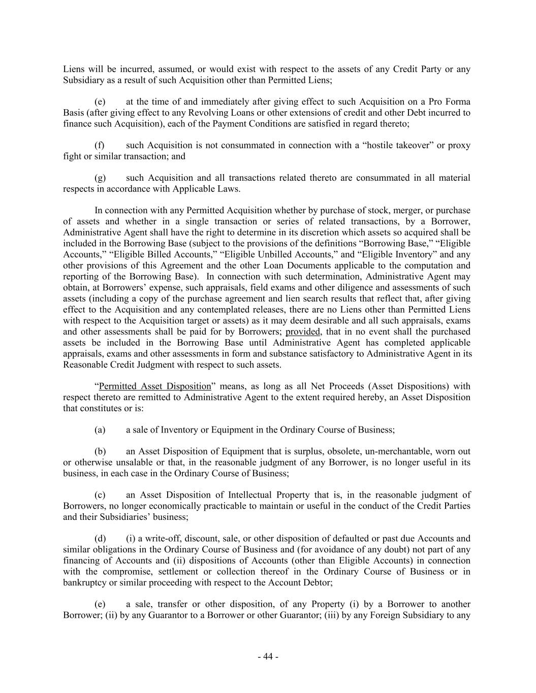 Liens will be incurred, assumed, or would exist with respect to the assets of any Credit Party or any Subsidiary as a result of such Acquisition other than Permitted Liens; (e) at the time of and immediately after giving effect to such Acquisition on a Pro Forma Basis (after giving effect to any Revolving Loans or other extensions of credit and other Debt incurred to finance such Acquisition), each of the Payment Conditions are satisfied in regard thereto; (f) such Acquisition is not consummated in connection with a “hostile takeover” or proxy fight or similar transaction; and (g) such Acquisition and all transactions related thereto are consummated in all material respects in accordance with Applicable Laws. In connection with any Permitted Acquisition whether by purchase of stock, merger, or purchase of assets and whether in a single transaction or series of related transactions, by a Borrower, Administrative Agent shall have the right to determine in its discretion which assets so acquired shall be included in the Borrowing Base (subject to the provisions of the definitions “Borrowing Base,” “Eligible Accounts,” “Eligible Billed Accounts,” “Eligible Unbilled Accounts,” and “Eligible Inventory” and any other provisions of this Agreement and the other Loan Documents applicable to the computation and reporting of the Borrowing Base). In connection with such determination, Administrative Agent may obtain, at Borrowers’ expense, such appraisals, field exams and other diligence and assessments of such assets (including a copy of the purchase agreement and lien search results that reflect that, after giving effect to the Acquisition and any contemplated releases, there are no Liens other than Permitted Liens with respect to the Acquisition target or assets) as it may deem desirable and all such appraisals, exams and other assessments shall be paid for by Borrowers; provided, that in no event shall the purchased assets be included in the Borrowing Base until Administrative Agent has completed applicable appraisals, exams and other assessments in form and substance satisfactory to Administrative Agent in its Reasonable Credit Judgment with respect to such assets. “Permitted Asset Disposition” means, as long as all Net Proceeds (Asset Dispositions) with respect thereto are remitted to Administrative Agent to the extent required hereby, an Asset Disposition that constitutes or is: (a) a sale of Inventory or Equipment in the Ordinary Course of Business; (b) an Asset Disposition of Equipment that is surplus, obsolete, un-merchantable, worn out or otherwise unsalable or that, in the reasonable judgment of any Borrower, is no longer useful in its business, in each case in the Ordinary Course of Business; (c) an Asset Disposition of Intellectual Property that is, in the reasonable judgment of Borrowers, no longer economically practicable to maintain or useful in the conduct of the Credit Parties and their Subsidiaries’ business; (d) (i) a write-off, discount, sale, or other disposition of defaulted or past due Accounts and similar obligations in the Ordinary Course of Business and (for avoidance of any doubt) not part of any financing of Accounts and (ii) dispositions of Accounts (other than Eligible Accounts) in connection with the compromise, settlement or collection thereof in the Ordinary Course of Business or in bankruptcy or similar proceeding with respect to the Account Debtor; (e) a sale, transfer or other disposition, of any Property (i) by a Borrower to another Borrower; (ii) by any Guarantor to a Borrower or other Guarantor; (iii) by any Foreign Subsidiary to any - 44 -