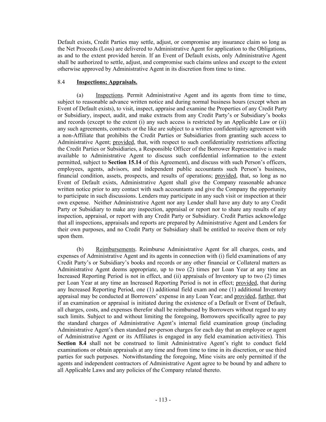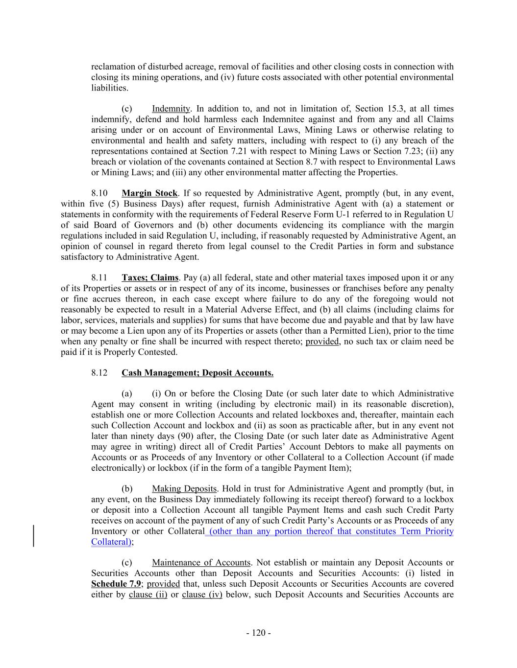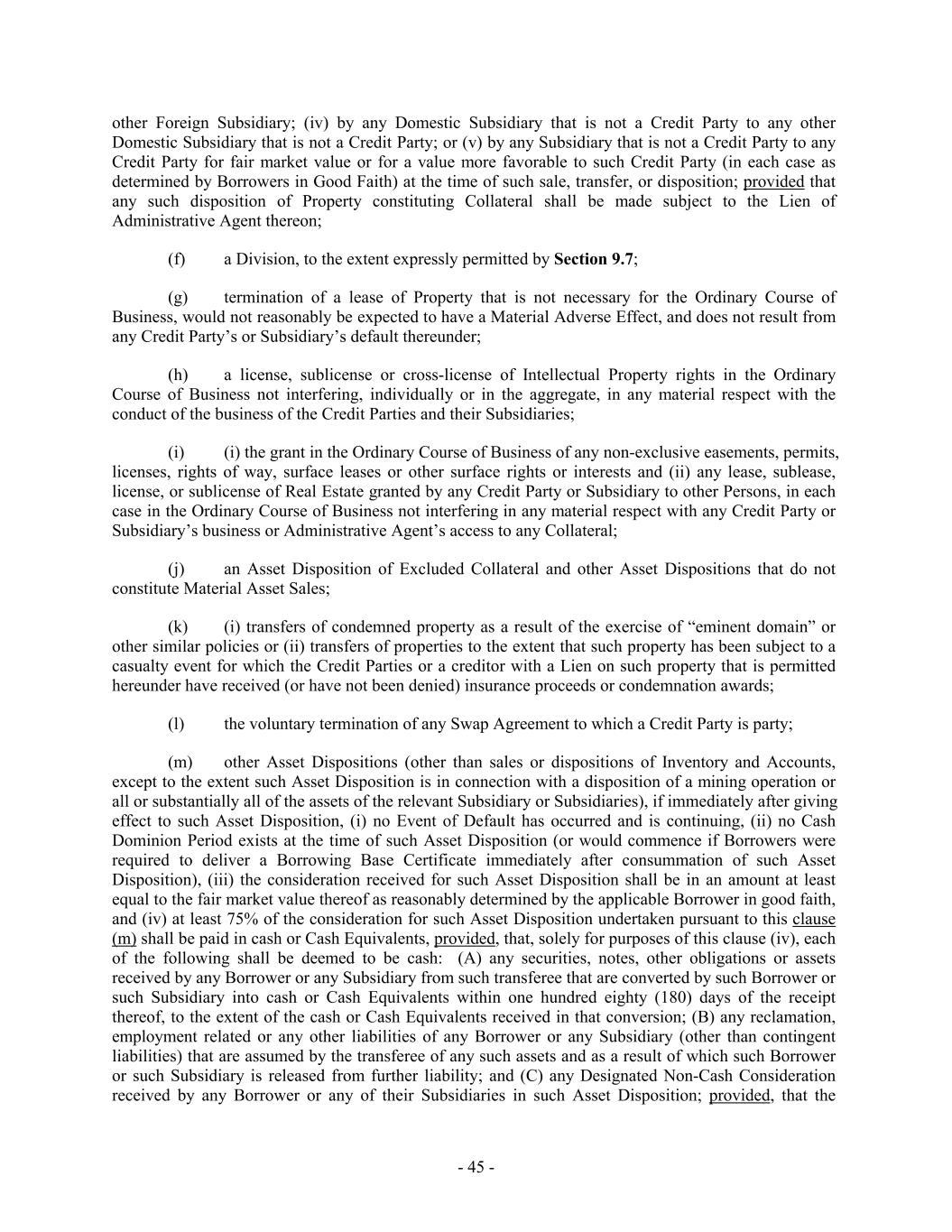 other Foreign Subsidiary; (iv) by any Domestic Subsidiary that is not a Credit Party to any other Domestic Subsidiary that is not a Credit Party; or (v) by any Subsidiary that is not a Credit Party to any Credit Party for fair market value or for a value more favorable to such Credit Party (in each case as determined by Borrowers in Good Faith) at the time of such sale, transfer, or disposition; provided that any such disposition of Property constituting Collateral shall be made subject to the Lien of Administrative Agent thereon; (f) a Division, to the extent expressly permitted by Section 9.7; (g) termination of a lease of Property that is not necessary for the Ordinary Course of Business, would not reasonably be expected to have a Material Adverse Effect, and does not result from any Credit Party’s or Subsidiary’s default thereunder; (h) a license, sublicense or cross-license of Intellectual Property rights in the Ordinary Course of Business not interfering, individually or in the aggregate, in any material respect with the conduct of the business of the Credit Parties and their Subsidiaries; (i) (i) the grant in the Ordinary Course of Business of any non-exclusive easements, permits, licenses, rights of way, surface leases or other surface rights or interests and (ii) any lease, sublease, license, or sublicense of Real Estate granted by any Credit Party or Subsidiary to other Persons, in each case in the Ordinary Course of Business not interfering in any material respect with any Credit Party or Subsidiary’s business or Administrative Agent’s access to any Collateral; (j) an Asset Disposition of Excluded Collateral and other Asset Dispositions that do not constitute Material Asset Sales; (k) (i) transfers of condemned property as a result of the exercise of “eminent domain” or other similar policies or (ii) transfers of properties to the extent that such property has been subject to a casualty event for which the Credit Parties or a creditor with a Lien on such property that is permitted hereunder have received (or have not been denied) insurance proceeds or condemnation awards; (l) the voluntary termination of any Swap Agreement to which a Credit Party is party; (m) other Asset Dispositions (other than sales or dispositions of Inventory and Accounts, except to the extent such Asset Disposition is in connection with a disposition of a mining operation or all or substantially all of the assets of the relevant Subsidiary or Subsidiaries), if immediately after giving effect to such Asset Disposition, (i) no Event of Default has occurred and is continuing, (ii) no Cash Dominion Period exists at the time of such Asset Disposition (or would commence if Borrowers were required to deliver a Borrowing Base Certificate immediately after consummation of such Asset Disposition), (iii) the consideration received for such Asset Disposition shall be in an amount at least equal to the fair market value thereof as reasonably determined by the applicable Borrower in good faith, and (iv) at least 75% of the consideration for such Asset Disposition undertaken pursuant to this clause (m) shall be paid in cash or Cash Equivalents, provided, that, solely for purposes of this clause (iv), each of the following shall be deemed to be cash: (A) any securities, notes, other obligations or assets received by any Borrower or any Subsidiary from such transferee that are converted by such Borrower or such Subsidiary into cash or Cash Equivalents within one hundred eighty (180) days of the receipt thereof, to the extent of the cash or Cash Equivalents received in that conversion; (B) any reclamation, employment related or any other liabilities of any Borrower or any Subsidiary (other than contingent liabilities) that are assumed by the transferee of any such assets and as a result of which such Borrower or such Subsidiary is released from further liability; and (C) any Designated Non-Cash Consideration received by any Borrower or any of their Subsidiaries in such Asset Disposition; provided, that the - 45 -