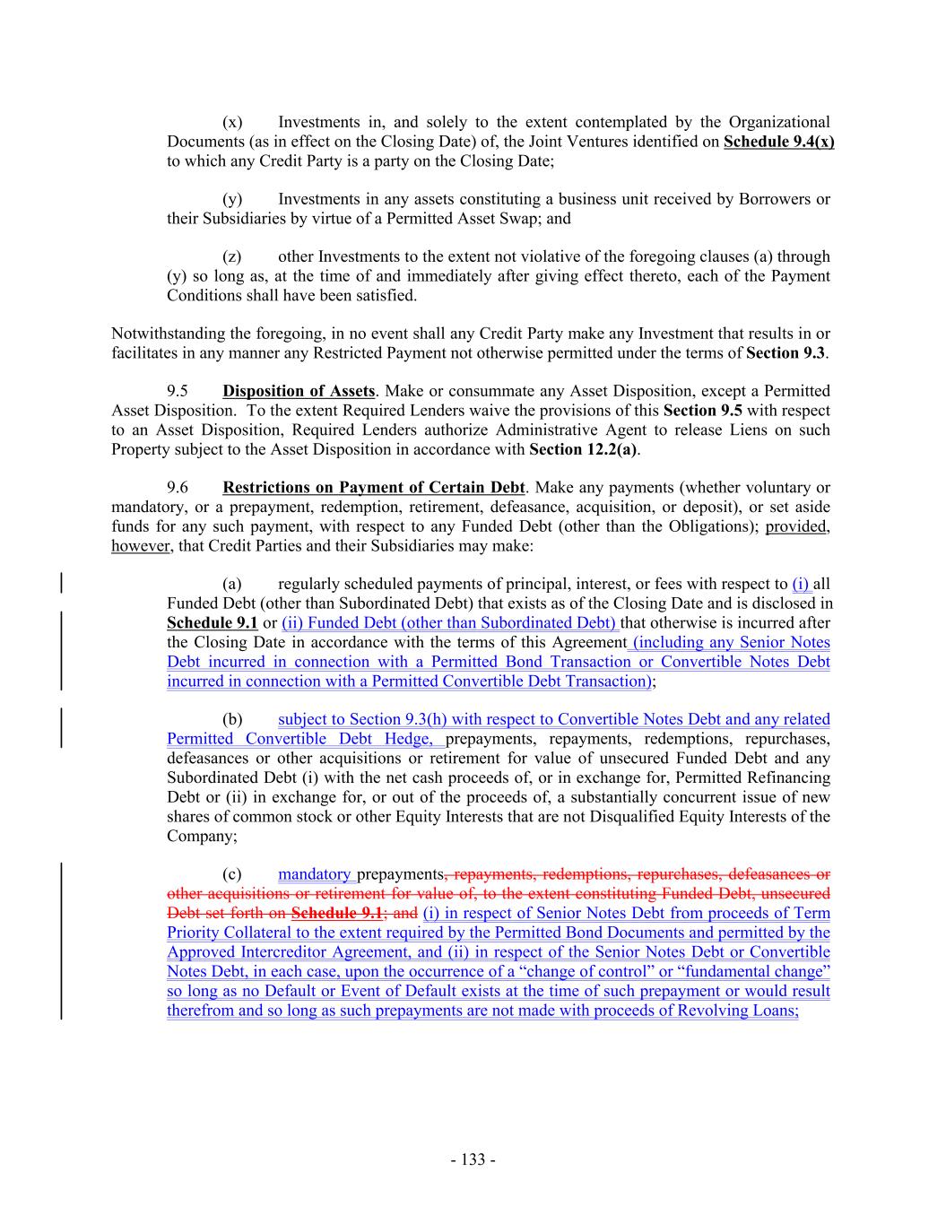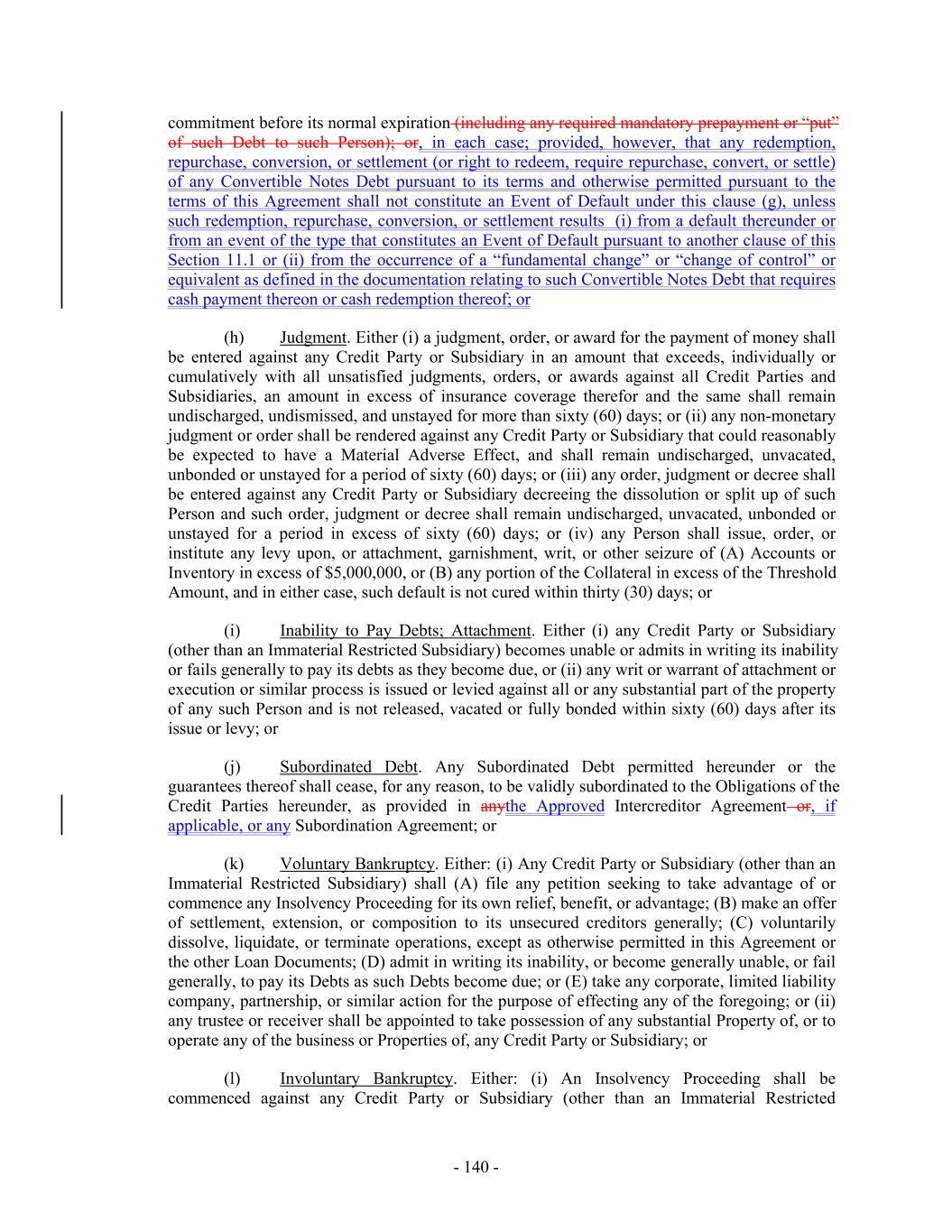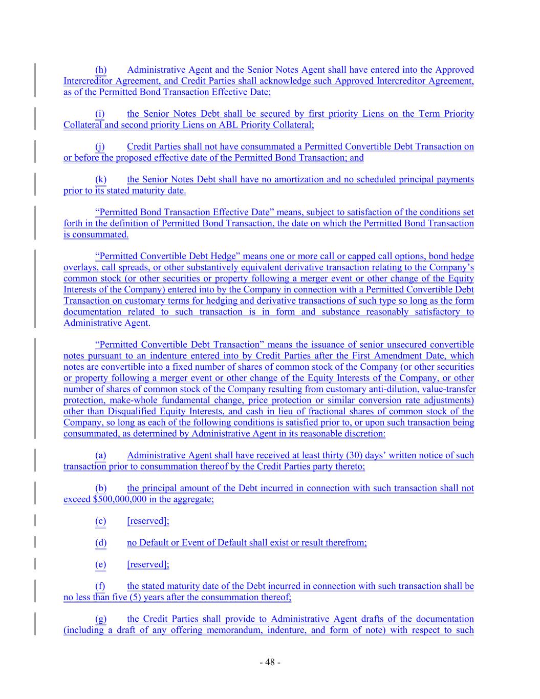(h) Administrative Agent and the Senior Notes Agent shall have entered into the Approved Intercreditor Agreement, and Credit Parties shall acknowledge such Approved Intercreditor Agreement, as of the Permitted Bond Transaction Effective Date; (i) the Senior Notes Debt shall be secured by first priority Liens on the Term Priority Collateral and second priority Liens on ABL Priority Collateral; (j) Credit Parties shall not have consummated a Permitted Convertible Debt Transaction on or before the proposed effective date of the Permitted Bond Transaction; and (k) the Senior Notes Debt shall have no amortization and no scheduled principal payments prior to its stated maturity date. “Permitted Bond Transaction Effective Date” means, subject to satisfaction of the conditions set forth in the definition of Permitted Bond Transaction, the date on which the Permitted Bond Transaction is consummated. “Permitted Convertible Debt Hedge” means one or more call or capped call options, bond hedge overlays, call spreads, or other substantively equivalent derivative transaction relating to the Company’s common stock (or other securities or property following a merger event or other change of the Equity Interests of the Company) entered into by the Company in connection with a Permitted Convertible Debt Transaction on customary terms for hedging and derivative transactions of such type so long as the form documentation related to such transaction is in form and substance reasonably satisfactory to Administrative Agent. “Permitted Convertible Debt Transaction” means the issuance of senior unsecured convertible notes pursuant to an indenture entered into by Credit Parties after the First Amendment Date, which notes are convertible into a fixed number of shares of common stock of the Company (or other securities or property following a merger event or other change of the Equity Interests of the Company, or other number of shares of common stock of the Company resulting from customary anti-dilution, value-transfer protection, make-whole fundamental change, price protection or similar conversion rate adjustments) other than Disqualified Equity Interests, and cash in lieu of fractional shares of common stock of the Company, so long as each of the following conditions is satisfied prior to, or upon such transaction being consummated, as determined by Administrative Agent in its reasonable discretion: (a) Administrative Agent shall have received at least thirty (30) days’ written notice of such transaction prior to consummation thereof by the Credit Parties party thereto; (b) the principal amount of the Debt incurred in connection with such transaction shall not exceed $500,000,000 in the aggregate; (c) [reserved]; (d) no Default or Event of Default shall exist or result therefrom; (e) [reserved]; (f) the stated maturity date of the Debt incurred in connection with such transaction shall be no less than five (5) years after the consummation thereof; (g) the Credit Parties shall provide to Administrative Agent drafts of the documentation (including a draft of any offering memorandum, indenture, and form of note) with respect to such - 48 -