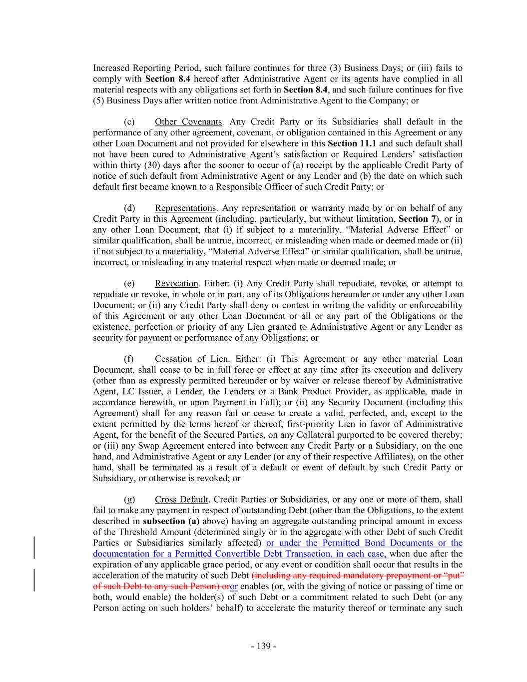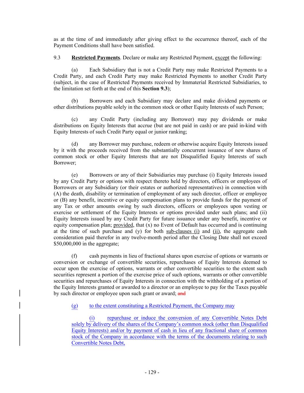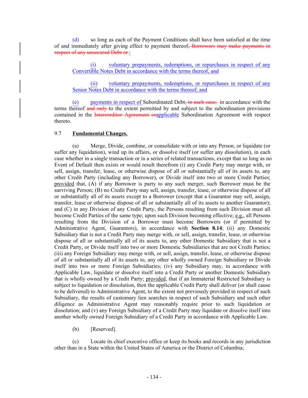 (h) Administrative Agent and the Senior Notes Agent shall have entered into the Approved Intercreditor Agreement, and Credit Parties shall acknowledge such Approved Intercreditor Agreement, as of the Permitted Bond Transaction Effective Date; (i) the Senior Notes Debt shall be secured by first priority Liens on the Term Priority Collateral and second priority Liens on ABL Priority Collateral; (j) Credit Parties shall not have consummated a Permitted Convertible Debt Transaction on or before the proposed effective date of the Permitted Bond Transaction; and (k) the Senior Notes Debt shall have no amortization and no scheduled principal payments prior to its stated maturity date. “Permitted Bond Transaction Effective Date” means, subject to satisfaction of the conditions set forth in the definition of Permitted Bond Transaction, the date on which the Permitted Bond Transaction is consummated. “Permitted Convertible Debt Hedge” means one or more call or capped call options, bond hedge overlays, call spreads, or other substantively equivalent derivative transaction relating to the Company’s common stock (or other securities or property following a merger event or other change of the Equity Interests of the Company) entered into by the Company in connection with a Permitted Convertible Debt Transaction on customary terms for hedging and derivative transactions of such type so long as the form documentation related to such transaction is in form and substance reasonably satisfactory to Administrative Agent. “Permitted Convertible Debt Transaction” means the issuance of senior unsecured convertible notes pursuant to an indenture entered into by Credit Parties after the First Amendment Date, which notes are convertible into a fixed number of shares of common stock of the Company (or other securities or property following a merger event or other change of the Equity Interests of the Company, or other number of shares of common stock of the Company resulting from customary anti-dilution, value-transfer protection, make-whole fundamental change, price protection or similar conversion rate adjustments) other than Disqualified Equity Interests, and cash in lieu of fractional shares of common stock of the Company, so long as each of the following conditions is satisfied prior to, or upon such transaction being consummated, as determined by Administrative Agent in its reasonable discretion: (a) Administrative Agent shall have received at least thirty (30) days’ written notice of such transaction prior to consummation thereof by the Credit Parties party thereto; (b) the principal amount of the Debt incurred in connection with such transaction shall not exceed $500,000,000 in the aggregate; (c) [reserved]; (d) no Default or Event of Default shall exist or result therefrom; (e) [reserved]; (f) the stated maturity date of the Debt incurred in connection with such transaction shall be no less than five (5) years after the consummation thereof; (g) the Credit Parties shall provide to Administrative Agent drafts of the documentation (including a draft of any offering memorandum, indenture, and form of note) with respect to such - 48 -