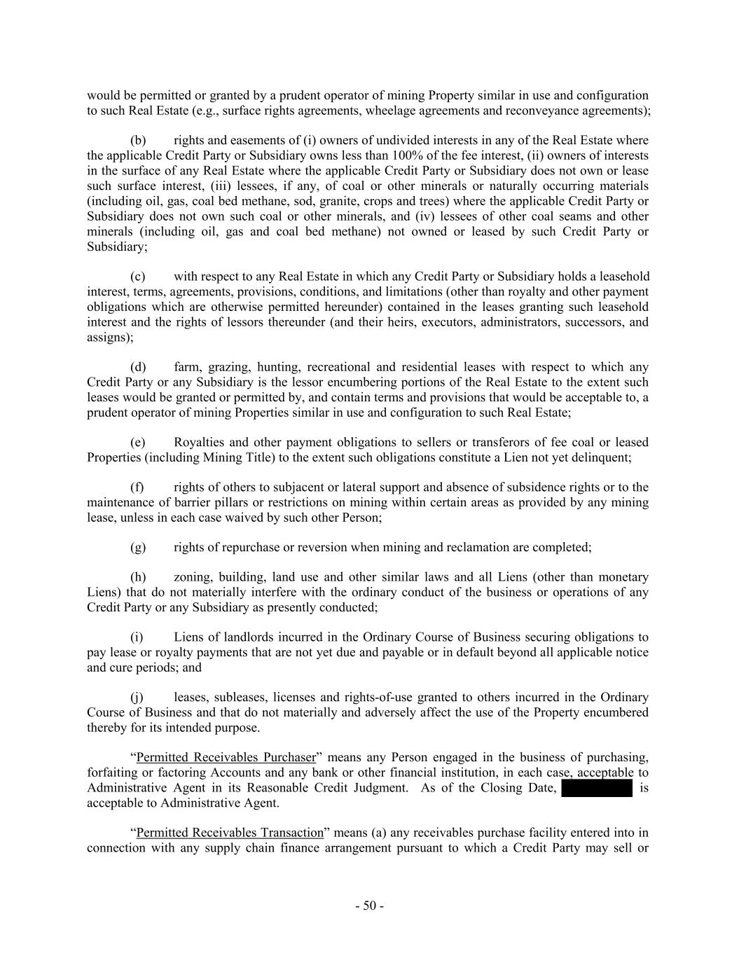 would be permitted or granted by a prudent operator of mining Property similar in use and configuration to such Real Estate (e.g., surface rights agreements, wheelage agreements and reconveyance agreements); (b) rights and easements of (i) owners of undivided interests in any of the Real Estate where the applicable Credit Party or Subsidiary owns less than 100% of the fee interest, (ii) owners of interests in the surface of any Real Estate where the applicable Credit Party or Subsidiary does not own or lease such surface interest, (iii) lessees, if any, of coal or other minerals or naturally occurring materials (including oil, gas, coal bed methane, sod, granite, crops and trees) where the applicable Credit Party or Subsidiary does not own such coal or other minerals, and (iv) lessees of other coal seams and other minerals (including oil, gas and coal bed methane) not owned or leased by such Credit Party or Subsidiary; (c) with respect to any Real Estate in which any Credit Party or Subsidiary holds a leasehold interest, terms, agreements, provisions, conditions, and limitations (other than royalty and other payment obligations which are otherwise permitted hereunder) contained in the leases granting such leasehold interest and the rights of lessors thereunder (and their heirs, executors, administrators, successors, and assigns); (d) farm, grazing, hunting, recreational and residential leases with respect to which any Credit Party or any Subsidiary is the lessor encumbering portions of the Real Estate to the extent such leases would be granted or permitted by, and contain terms and provisions that would be acceptable to, a prudent operator of mining Properties similar in use and configuration to such Real Estate; (e) Royalties and other payment obligations to sellers or transferors of fee coal or leased Properties (including Mining Title) to the extent such obligations constitute a Lien not yet delinquent; (f) rights of others to subjacent or lateral support and absence of subsidence rights or to the maintenance of barrier pillars or restrictions on mining within certain areas as provided by any mining lease, unless in each case waived by such other Person; (g) rights of repurchase or reversion when mining and reclamation are completed; (h) zoning, building, land use and other similar laws and all Liens (other than monetary Liens) that do not materially interfere with the ordinary conduct of the business or operations of any Credit Party or any Subsidiary as presently conducted; (i) Liens of landlords incurred in the Ordinary Course of Business securing obligations to pay lease or royalty payments that are not yet due and payable or in default beyond all applicable notice and cure periods; and (j) leases, subleases, licenses and rights-of-use granted to others incurred in the Ordinary Course of Business and that do not materially and adversely affect the use of the Property encumbered thereby for its intended purpose. “Permitted Receivables Purchaser” means any Person engaged in the business of purchasing, forfaiting or factoring Accounts and any bank or other financial institution, in each case, acceptable to Administrative Agent in its Reasonable Credit Judgment. As of the Closing Date, is acceptable to Administrative Agent. “Permitted Receivables Transaction” means (a) any receivables purchase facility entered into in connection with any supply chain finance arrangement pursuant to which a Credit Party may sell or - 50 -