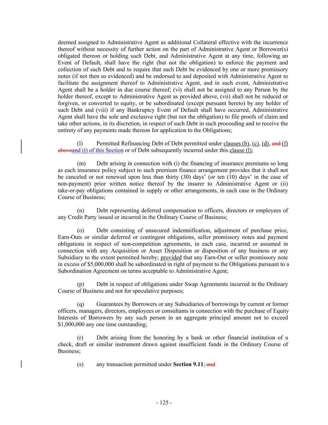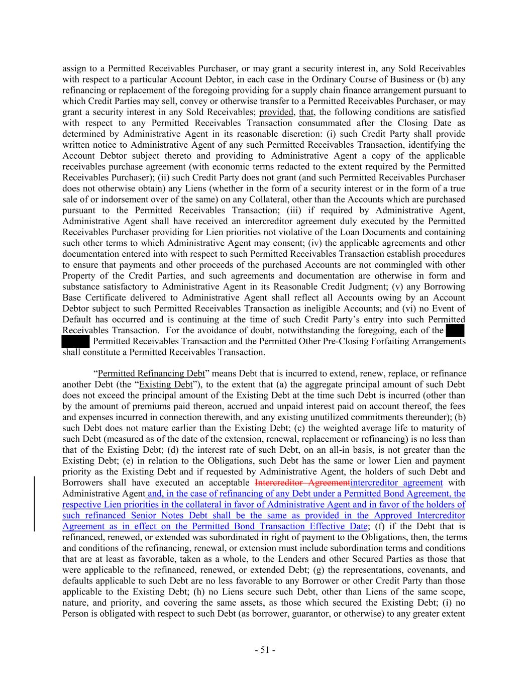 assign to a Permitted Receivables Purchaser, or may grant a security interest in, any Sold Receivables with respect to a particular Account Debtor, in each case in the Ordinary Course of Business or (b) any refinancing or replacement of the foregoing providing for a supply chain finance arrangement pursuant to which Credit Parties may sell, convey or otherwise transfer to a Permitted Receivables Purchaser, or may grant a security interest in any Sold Receivables; provided, that, the following conditions are satisfied with respect to any Permitted Receivables Transaction consummated after the Closing Date as determined by Administrative Agent in its reasonable discretion: (i) such Credit Party shall provide written notice to Administrative Agent of any such Permitted Receivables Transaction, identifying the Account Debtor subject thereto and providing to Administrative Agent a copy of the applicable receivables purchase agreement (with economic terms redacted to the extent required by the Permitted Receivables Purchaser); (ii) such Credit Party does not grant (and such Permitted Receivables Purchaser does not otherwise obtain) any Liens (whether in the form of a security interest or in the form of a true sale of or indorsement over of the same) on any Collateral, other than the Accounts which are purchased pursuant to the Permitted Receivables Transaction; (iii) if required by Administrative Agent, Administrative Agent shall have received an intercreditor agreement duly executed by the Permitted Receivables Purchaser providing for Lien priorities not violative of the Loan Documents and containing such other terms to which Administrative Agent may consent; (iv) the applicable agreements and other documentation entered into with respect to such Permitted Receivables Transaction establish procedures to ensure that payments and other proceeds of the purchased Accounts are not commingled with other Property of the Credit Parties, and such agreements and documentation are otherwise in form and substance satisfactory to Administrative Agent in its Reasonable Credit Judgment; (v) any Borrowing Base Certificate delivered to Administrative Agent shall reflect all Accounts owing by an Account Debtor subject to such Permitted Receivables Transaction as ineligible Accounts; and (vi) no Event of Default has occurred and is continuing at the time of such Credit Party’s entry into such Permitted Receivables Transaction. For the avoidance of doubt, notwithstanding the foregoing, each of the Permitted Receivables Transaction and the Permitted Other Pre-Closing Forfaiting Arrangements shall constitute a Permitted Receivables Transaction. “Permitted Refinancing Debt” means Debt that is incurred to extend, renew, replace, or refinance another Debt (the “Existing Debt”), to the extent that (a) the aggregate principal amount of such Debt does not exceed the principal amount of the Existing Debt at the time such Debt is incurred (other than by the amount of premiums paid thereon, accrued and unpaid interest paid on account thereof, the fees and expenses incurred in connection therewith, and any existing unutilized commitments thereunder); (b) such Debt does not mature earlier than the Existing Debt; (c) the weighted average life to maturity of such Debt (measured as of the date of the extension, renewal, replacement or refinancing) is no less than that of the Existing Debt; (d) the interest rate of such Debt, on an all-in basis, is not greater than the Existing Debt; (e) in relation to the Obligations, such Debt has the same or lower Lien and payment priority as the Existing Debt and if requested by Administrative Agent, the holders of such Debt and Borrowers shall have executed an acceptable Intercreditor Agreementintercreditor agreement with Administrative Agent and, in the case of refinancing of any Debt under a Permitted Bond Agreement, the respective Lien priorities in the collateral in favor of Administrative Agent and in favor of the holders of such refinanced Senior Notes Debt shall be the same as provided in the Approved Intercreditor Agreement as in effect on the Permitted Bond Transaction Effective Date; (f) if the Debt that is refinanced, renewed, or extended was subordinated in right of payment to the Obligations, then, the terms and conditions of the refinancing, renewal, or extension must include subordination terms and conditions that are at least as favorable, taken as a whole, to the Lenders and other Secured Parties as those that were applicable to the refinanced, renewed, or extended Debt; (g) the representations, covenants, and defaults applicable to such Debt are no less favorable to any Borrower or other Credit Party than those applicable to the Existing Debt; (h) no Liens secure such Debt, other than Liens of the same scope, nature, and priority, and covering the same assets, as those which secured the Existing Debt; (i) no Person is obligated with respect to such Debt (as borrower, guarantor, or otherwise) to any greater extent - 51 -