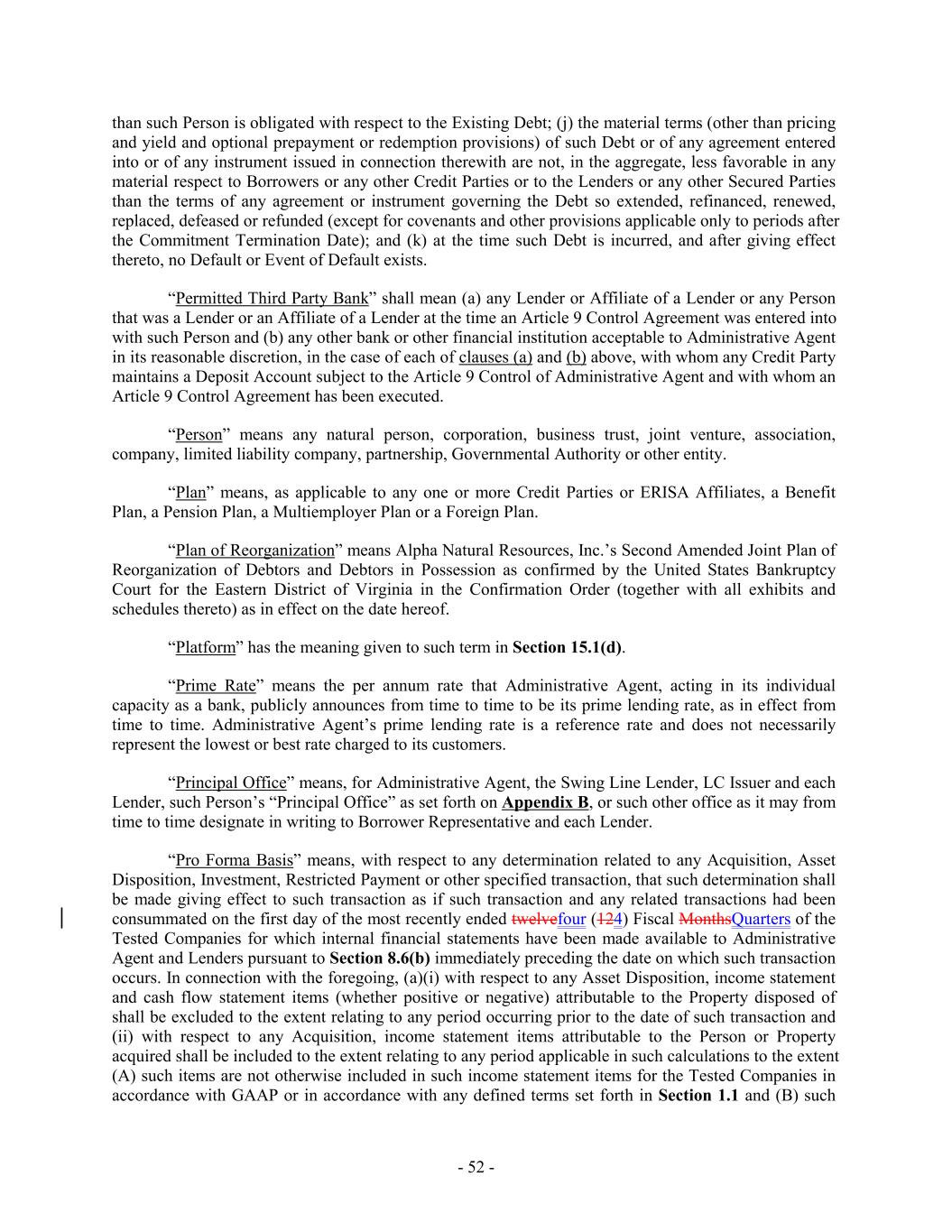 than such Person is obligated with respect to the Existing Debt; (j) the material terms (other than pricing and yield and optional prepayment or redemption provisions) of such Debt or of any agreement entered into or of any instrument issued in connection therewith are not, in the aggregate, less favorable in any material respect to Borrowers or any other Credit Parties or to the Lenders or any other Secured Parties than the terms of any agreement or instrument governing the Debt so extended, refinanced, renewed, replaced, defeased or refunded (except for covenants and other provisions applicable only to periods after the Commitment Termination Date); and (k) at the time such Debt is incurred, and after giving effect thereto, no Default or Event of Default exists. “Permitted Third Party Bank” shall mean (a) any Lender or Affiliate of a Lender or any Person that was a Lender or an Affiliate of a Lender at the time an Article 9 Control Agreement was entered into with such Person and (b) any other bank or other financial institution acceptable to Administrative Agent in its reasonable discretion, in the case of each of clauses (a) and (b) above, with whom any Credit Party maintains a Deposit Account subject to the Article 9 Control of Administrative Agent and with whom an Article 9 Control Agreement has been executed. “Person” means any natural person, corporation, business trust, joint venture, association, company, limited liability company, partnership, Governmental Authority or other entity. “Plan” means, as applicable to any one or more Credit Parties or ERISA Affiliates, a Benefit Plan, a Pension Plan, a Multiemployer Plan or a Foreign Plan. “Plan of Reorganization” means Alpha Natural Resources, Inc.’s Second Amended Joint Plan of Reorganization of Debtors and Debtors in Possession as confirmed by the United States Bankruptcy Court for the Eastern District of Virginia in the Confirmation Order (together with all exhibits and schedules thereto) as in effect on the date hereof. “Platform” has the meaning given to such term in Section 15.1(d). “Prime Rate” means the per annum rate that Administrative Agent, acting in its individual capacity as a bank, publicly announces from time to time to be its prime lending rate, as in effect from time to time. Administrative Agent’s prime lending rate is a reference rate and does not necessarily represent the lowest or best rate charged to its customers. “Principal Office” means, for Administrative Agent, the Swing Line Lender, LC Issuer and each Lender, such Person’s “Principal Office” as set forth on Appendix B, or such other office as it may from time to time designate in writing to Borrower Representative and each Lender. “Pro Forma Basis” means, with respect to any determination related to any Acquisition, Asset Disposition, Investment, Restricted Payment or other specified transaction, that such determination shall be made giving effect to such transaction as if such transaction and any related transactions had been consummated on the first day of the most recently ended twelvefour (124) Fiscal MonthsQuarters of the Tested Companies for which internal financial statements have been made available to Administrative Agent and Lenders pursuant to Section 8.6(b) immediately preceding the date on which such transaction occurs. In connection with the foregoing, (a)(i) with respect to any Asset Disposition, income statement and cash flow statement items (whether positive or negative) attributable to the Property disposed of shall be excluded to the extent relating to any period occurring prior to the date of such transaction and (ii) with respect to any Acquisition, income statement items attributable to the Person or Property acquired shall be included to the extent relating to any period applicable in such calculations to the extent (A) such items are not otherwise included in such income statement items for the Tested Companies in accordance with GAAP or in accordance with any defined terms set forth in Section 1.1 and (B) such - 52 -