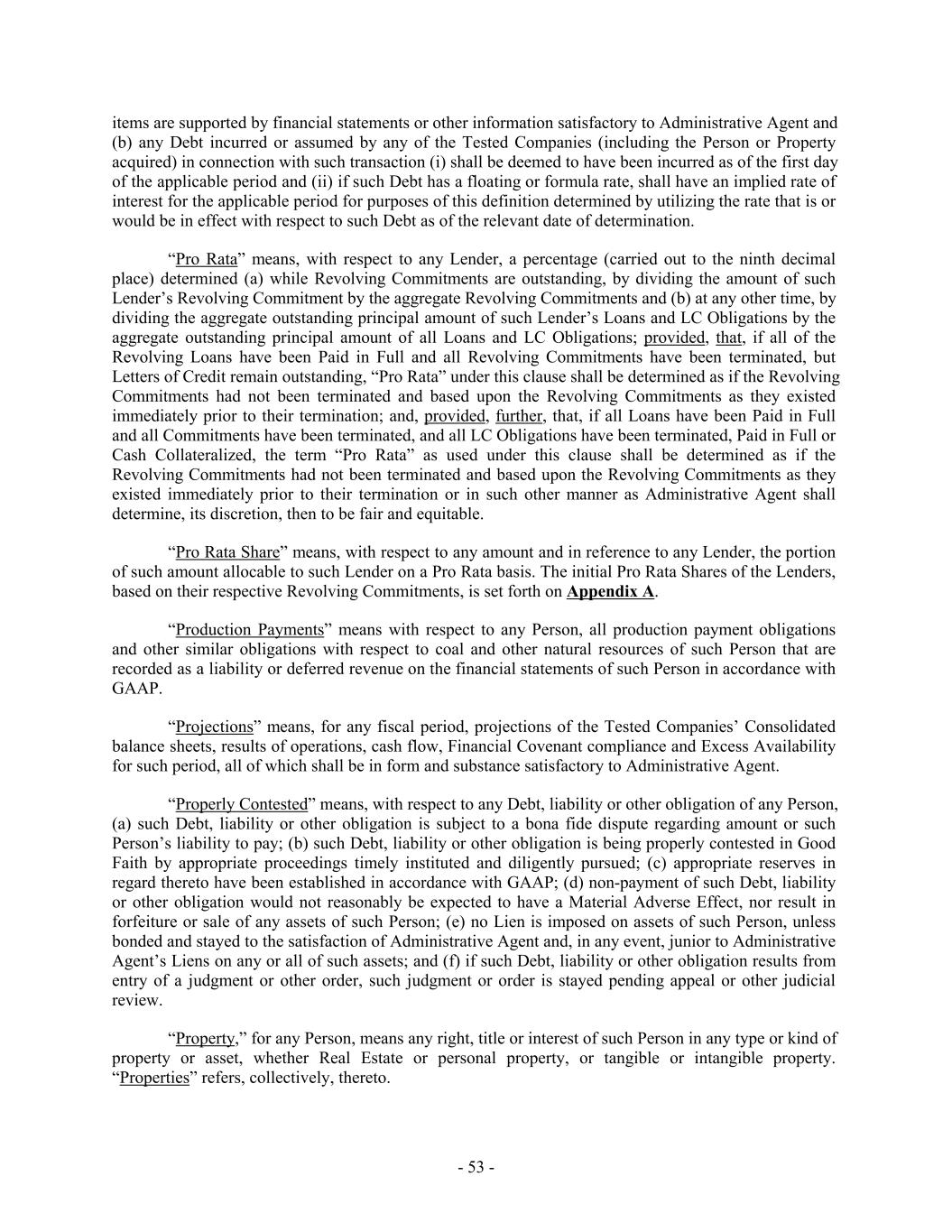 items are supported by financial statements or other information satisfactory to Administrative Agent and (b) any Debt incurred or assumed by any of the Tested Companies (including the Person or Property acquired) in connection with such transaction (i) shall be deemed to have been incurred as of the first day of the applicable period and (ii) if such Debt has a floating or formula rate, shall have an implied rate of interest for the applicable period for purposes of this definition determined by utilizing the rate that is or would be in effect with respect to such Debt as of the relevant date of determination. “Pro Rata” means, with respect to any Lender, a percentage (carried out to the ninth decimal place) determined (a) while Revolving Commitments are outstanding, by dividing the amount of such Lender’s Revolving Commitment by the aggregate Revolving Commitments and (b) at any other time, by dividing the aggregate outstanding principal amount of such Lender’s Loans and LC Obligations by the aggregate outstanding principal amount of all Loans and LC Obligations; provided, that, if all of the Revolving Loans have been Paid in Full and all Revolving Commitments have been terminated, but Letters of Credit remain outstanding, “Pro Rata” under this clause shall be determined as if the Revolving Commitments had not been terminated and based upon the Revolving Commitments as they existed immediately prior to their termination; and, provided, further, that, if all Loans have been Paid in Full and all Commitments have been terminated, and all LC Obligations have been terminated, Paid in Full or Cash Collateralized, the term “Pro Rata” as used under this clause shall be determined as if the Revolving Commitments had not been terminated and based upon the Revolving Commitments as they existed immediately prior to their termination or in such other manner as Administrative Agent shall determine, its discretion, then to be fair and equitable. “Pro Rata Share” means, with respect to any amount and in reference to any Lender, the portion of such amount allocable to such Lender on a Pro Rata basis. The initial Pro Rata Shares of the Lenders, based on their respective Revolving Commitments, is set forth on Appendix A. “Production Payments” means with respect to any Person, all production payment obligations and other similar obligations with respect to coal and other natural resources of such Person that are recorded as a liability or deferred revenue on the financial statements of such Person in accordance with GAAP. “Projections” means, for any fiscal period, projections of the Tested Companies’ Consolidated balance sheets, results of operations, cash flow, Financial Covenant compliance and Excess Availability for such period, all of which shall be in form and substance satisfactory to Administrative Agent. “Properly Contested” means, with respect to any Debt, liability or other obligation of any Person, (a) such Debt, liability or other obligation is subject to a bona fide dispute regarding amount or such Person’s liability to pay; (b) such Debt, liability or other obligation is being properly contested in Good Faith by appropriate proceedings timely instituted and diligently pursued; (c) appropriate reserves in regard thereto have been established in accordance with GAAP; (d) non-payment of such Debt, liability or other obligation would not reasonably be expected to have a Material Adverse Effect, nor result in forfeiture or sale of any assets of such Person; (e) no Lien is imposed on assets of such Person, unless bonded and stayed to the satisfaction of Administrative Agent and, in any event, junior to Administrative Agent’s Liens on any or all of such assets; and (f) if such Debt, liability or other obligation results from entry of a judgment or other order, such judgment or order is stayed pending appeal or other judicial review. “Property,” for any Person, means any right, title or interest of such Person in any type or kind of property or asset, whether Real Estate or personal property, or tangible or intangible property. “Properties” refers, collectively, thereto. - 53 -
