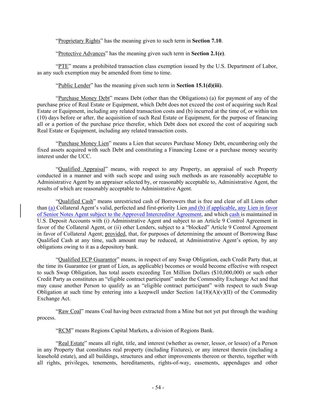 “Proprietary Rights” has the meaning given to such term in Section 7.10. “Protective Advances” has the meaning given such term in Section 2.1(e). “PTE” means a prohibited transaction class exemption issued by the U.S. Department of Labor, as any such exemption may be amended from time to time. “Public Lender” has the meaning given such term in Section 15.1(d)(iii). “Purchase Money Debt” means Debt (other than the Obligations) (a) for payment of any of the purchase price of Real Estate or Equipment, which Debt does not exceed the cost of acquiring such Real Estate or Equipment, including any related transaction costs and (b) incurred at the time of, or within ten (10) days before or after, the acquisition of such Real Estate or Equipment, for the purpose of financing all or a portion of the purchase price therefor, which Debt does not exceed the cost of acquiring such Real Estate or Equipment, including any related transaction costs. “Purchase Money Lien” means a Lien that secures Purchase Money Debt, encumbering only the fixed assets acquired with such Debt and constituting a Financing Lease or a purchase money security interest under the UCC. “Qualified Appraisal” means, with respect to any Property, an appraisal of such Property conducted in a manner and with such scope and using such methods as are reasonably acceptable to Administrative Agent by an appraiser selected by, or reasonably acceptable to, Administrative Agent, the results of which are reasonably acceptable to Administrative Agent. “Qualified Cash” means unrestricted cash of Borrowers that is free and clear of all Liens other than (a) Collateral Agent’s valid, perfected and first-priority Lien and (b) if applicable, any Lien in favor of Senior Notes Agent subject to the Approved Intercreditor Agreement, and which cash is maintained in U.S. Deposit Accounts with (i) Administrative Agent and subject to an Article 9 Control Agreement in favor of the Collateral Agent, or (ii) other Lenders, subject to a “blocked” Article 9 Control Agreement in favor of Collateral Agent; provided, that, for purposes of determining the amount of Borrowing Base Qualified Cash at any time, such amount may be reduced, at Administrative Agent’s option, by any obligations owing to it as a depository bank. “Qualified ECP Guarantor” means, in respect of any Swap Obligation, each Credit Party that, at the time its Guarantee (or grant of Lien, as applicable) becomes or would become effective with respect to such Swap Obligation, has total assets exceeding Ten Million Dollars ($10,000,000) or such other Credit Party as constitutes an “eligible contract participant” under the Commodity Exchange Act and that may cause another Person to qualify as an “eligible contract participant” with respect to such Swap Obligation at such time by entering into a keepwell under Section 1a(18)(A)(v)(II) of the Commodity Exchange Act. “Raw Coal” means Coal having been extracted from a Mine but not yet put through the washing process. “RCM” means Regions Capital Markets, a division of Regions Bank. “Real Estate” means all right, title, and interest (whether as owner, lessor, or lessee) of a Person in any Property that constitutes real property (including Fixtures), or any interest therein (including a leasehold estate), and all buildings, structures and other improvements thereon or thereto, together with all rights, privileges, tenements, hereditaments, rights-of-way, easements, appendages and other - 54 -