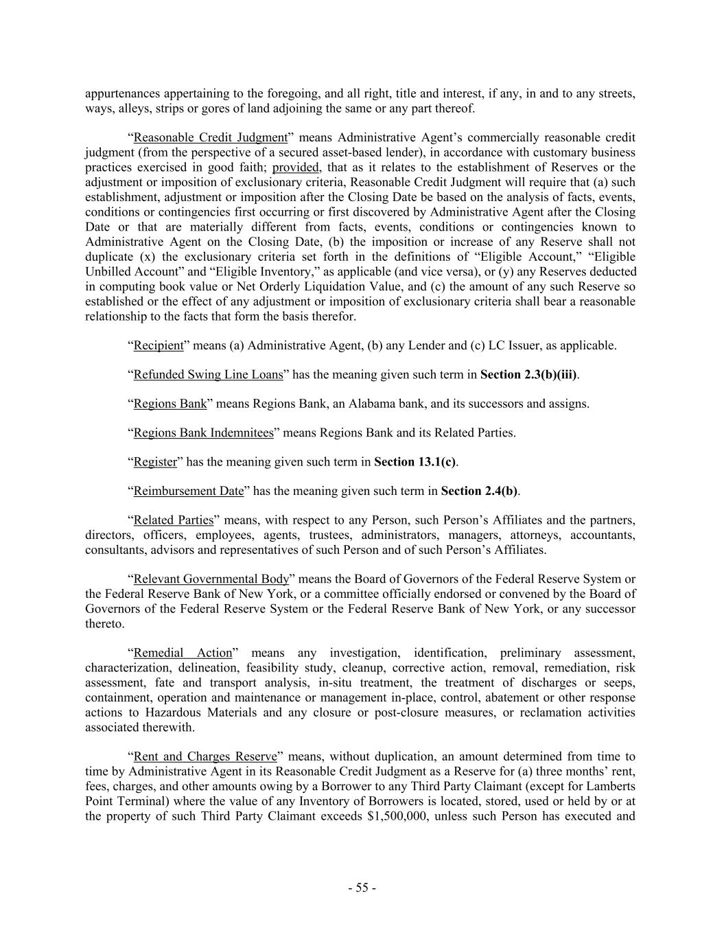appurtenances appertaining to the foregoing, and all right, title and interest, if any, in and to any streets, ways, alleys, strips or gores of land adjoining the same or any part thereof. “Reasonable Credit Judgment” means Administrative Agent’s commercially reasonable credit judgment (from the perspective of a secured asset-based lender), in accordance with customary business practices exercised in good faith; provided, that as it relates to the establishment of Reserves or the adjustment or imposition of exclusionary criteria, Reasonable Credit Judgment will require that (a) such establishment, adjustment or imposition after the Closing Date be based on the analysis of facts, events, conditions or contingencies first occurring or first discovered by Administrative Agent after the Closing Date or that are materially different from facts, events, conditions or contingencies known to Administrative Agent on the Closing Date, (b) the imposition or increase of any Reserve shall not duplicate (x) the exclusionary criteria set forth in the definitions of “Eligible Account,” “Eligible Unbilled Account” and “Eligible Inventory,” as applicable (and vice versa), or (y) any Reserves deducted in computing book value or Net Orderly Liquidation Value, and (c) the amount of any such Reserve so established or the effect of any adjustment or imposition of exclusionary criteria shall bear a reasonable relationship to the facts that form the basis therefor. “Recipient” means (a) Administrative Agent, (b) any Lender and (c) LC Issuer, as applicable. “Refunded Swing Line Loans” has the meaning given such term in Section 2.3(b)(iii). “Regions Bank” means Regions Bank, an Alabama bank, and its successors and assigns. “Regions Bank Indemnitees” means Regions Bank and its Related Parties. “Register” has the meaning given such term in Section 13.1(c). “Reimbursement Date” has the meaning given such term in Section 2.4(b). “Related Parties” means, with respect to any Person, such Person’s Affiliates and the partners, directors, officers, employees, agents, trustees, administrators, managers, attorneys, accountants, consultants, advisors and representatives of such Person and of such Person’s Affiliates. “Relevant Governmental Body” means the Board of Governors of the Federal Reserve System or the Federal Reserve Bank of New York, or a committee officially endorsed or convened by the Board of Governors of the Federal Reserve System or the Federal Reserve Bank of New York, or any successor thereto. “Remedial Action” means any investigation, identification, preliminary assessment, characterization, delineation, feasibility study, cleanup, corrective action, removal, remediation, risk assessment, fate and transport analysis, in-situ treatment, the treatment of discharges or seeps, containment, operation and maintenance or management in-place, control, abatement or other response actions to Hazardous Materials and any closure or post-closure measures, or reclamation activities associated therewith. “Rent and Charges Reserve” means, without duplication, an amount determined from time to time by Administrative Agent in its Reasonable Credit Judgment as a Reserve for (a) three months’ rent, fees, charges, and other amounts owing by a Borrower to any Third Party Claimant (except for Lamberts Point Terminal) where the value of any Inventory of Borrowers is located, stored, used or held by or at the property of such Third Party Claimant exceeds $1,500,000, unless such Person has executed and - 55 -