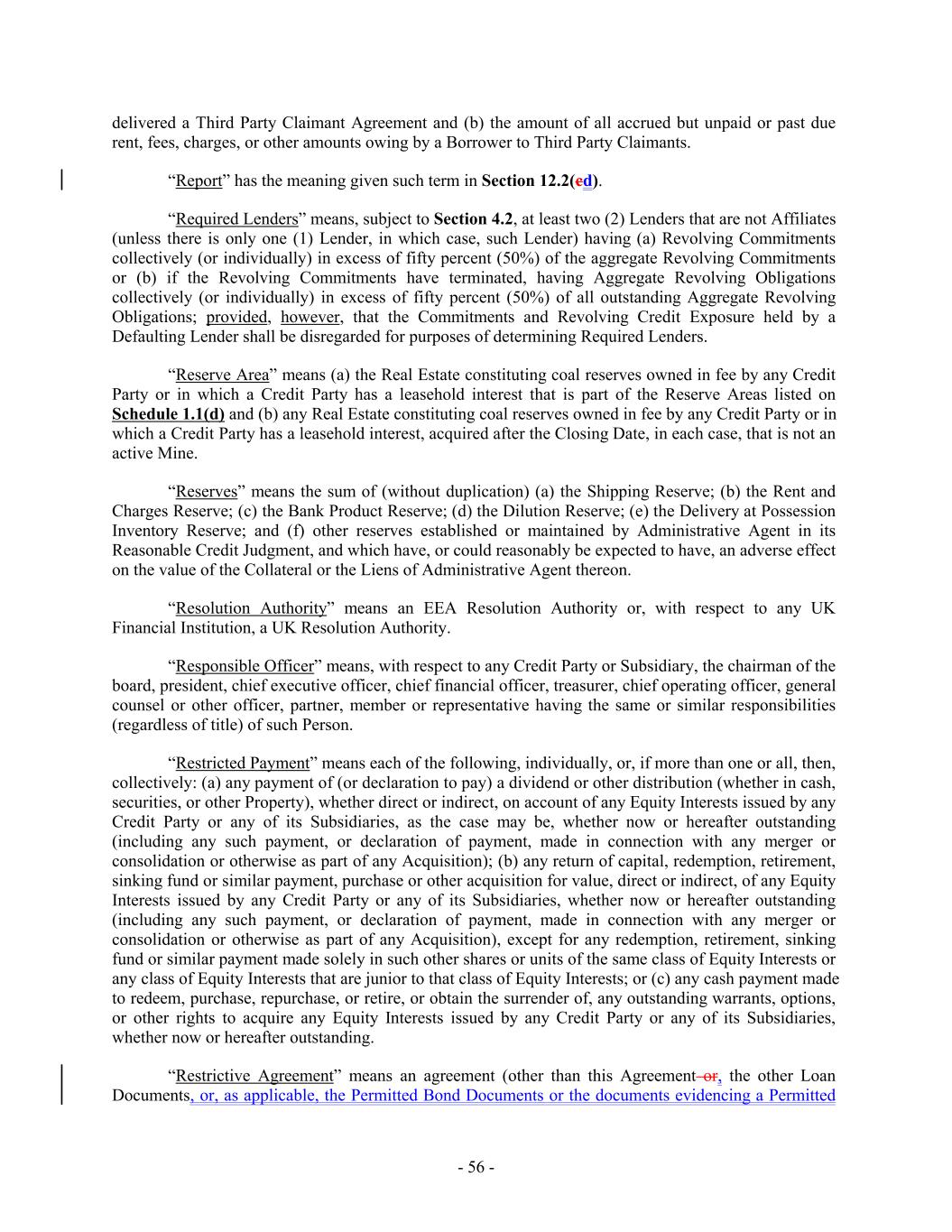 delivered a Third Party Claimant Agreement and (b) the amount of all accrued but unpaid or past due rent, fees, charges, or other amounts owing by a Borrower to Third Party Claimants. “Report” has the meaning given such term in Section 12.2(cd). “Required Lenders” means, subject to Section 4.2, at least two (2) Lenders that are not Affiliates (unless there is only one (1) Lender, in which case, such Lender) having (a) Revolving Commitments collectively (or individually) in excess of fifty percent (50%) of the aggregate Revolving Commitments or (b) if the Revolving Commitments have terminated, having Aggregate Revolving Obligations collectively (or individually) in excess of fifty percent (50%) of all outstanding Aggregate Revolving Obligations; provided, however, that the Commitments and Revolving Credit Exposure held by a Defaulting Lender shall be disregarded for purposes of determining Required Lenders. “Reserve Area” means (a) the Real Estate constituting coal reserves owned in fee by any Credit Party or in which a Credit Party has a leasehold interest that is part of the Reserve Areas listed on Schedule 1.1(d) and (b) any Real Estate constituting coal reserves owned in fee by any Credit Party or in which a Credit Party has a leasehold interest, acquired after the Closing Date, in each case, that is not an active Mine. “Reserves” means the sum of (without duplication) (a) the Shipping Reserve; (b) the Rent and Charges Reserve; (c) the Bank Product Reserve; (d) the Dilution Reserve; (e) the Delivery at Possession Inventory Reserve; and (f) other reserves established or maintained by Administrative Agent in its Reasonable Credit Judgment, and which have, or could reasonably be expected to have, an adverse effect on the value of the Collateral or the Liens of Administrative Agent thereon. “Resolution Authority” means an EEA Resolution Authority or, with respect to any UK Financial Institution, a UK Resolution Authority. “Responsible Officer” means, with respect to any Credit Party or Subsidiary, the chairman of the board, president, chief executive officer, chief financial officer, treasurer, chief operating officer, general counsel or other officer, partner, member or representative having the same or similar responsibilities (regardless of title) of such Person. “Restricted Payment” means each of the following, individually, or, if more than one or all, then, collectively: (a) any payment of (or declaration to pay) a dividend or other distribution (whether in cash, securities, or other Property), whether direct or indirect, on account of any Equity Interests issued by any Credit Party or any of its Subsidiaries, as the case may be, whether now or hereafter outstanding (including any such payment, or declaration of payment, made in connection with any merger or consolidation or otherwise as part of any Acquisition); (b) any return of capital, redemption, retirement, sinking fund or similar payment, purchase or other acquisition for value, direct or indirect, of any Equity Interests issued by any Credit Party or any of its Subsidiaries, whether now or hereafter outstanding (including any such payment, or declaration of payment, made in connection with any merger or consolidation or otherwise as part of any Acquisition), except for any redemption, retirement, sinking fund or similar payment made solely in such other shares or units of the same class of Equity Interests or any class of Equity Interests that are junior to that class of Equity Interests; or (c) any cash payment made to redeem, purchase, repurchase, or retire, or obtain the surrender of, any outstanding warrants, options, or other rights to acquire any Equity Interests issued by any Credit Party or any of its Subsidiaries, whether now or hereafter outstanding. “Restrictive Agreement” means an agreement (other than this Agreement or, the other Loan Documents, or, as applicable, the Permitted Bond Documents or the documents evidencing a Permitted - 56 -
