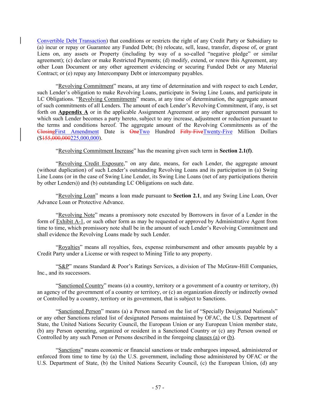 Convertible Debt Transaction) that conditions or restricts the right of any Credit Party or Subsidiary to (a) incur or repay or Guarantee any Funded Debt; (b) relocate, sell, lease, transfer, dispose of, or grant Liens on, any assets or Property (including by way of a so-called “negative pledge” or similar agreement); (c) declare or make Restricted Payments; (d) modify, extend, or renew this Agreement, any other Loan Document or any other agreement evidencing or securing Funded Debt or any Material Contract; or (e) repay any Intercompany Debt or intercompany payables. “Revolving Commitment” means, at any time of determination and with respect to each Lender, such Lender’s obligation to make Revolving Loans, participate in Swing Line Loans, and participate in LC Obligations. “Revolving Commitments” means, at any time of determination, the aggregate amount of such commitments of all Lenders. The amount of each Lender’s Revolving Commitment, if any, is set forth on Appendix A or in the applicable Assignment Agreement or any other agreement pursuant to which such Lender becomes a party hereto, subject to any increase, adjustment or reduction pursuant to the terms and conditions hereof. The aggregate amount of the Revolving Commitments as of the ClosingFirst Amendment Date is OneTwo Hundred Fifty FiveTwenty-Five Million Dollars ($155,000,000225,000,000). “Revolving Commitment Increase” has the meaning given such term in Section 2.1(f). “Revolving Credit Exposure,” on any date, means, for each Lender, the aggregate amount (without duplication) of such Lender’s outstanding Revolving Loans and its participation in (a) Swing Line Loans (or in the case of Swing Line Lender, its Swing Line Loans (net of any participations therein by other Lenders)) and (b) outstanding LC Obligations on such date. “Revolving Loan” means a loan made pursuant to Section 2.1, and any Swing Line Loan, Over Advance Loan or Protective Advance. “Revolving Note” means a promissory note executed by Borrowers in favor of a Lender in the form of Exhibit A-1, or such other form as may be requested or approved by Administrative Agent from time to time, which promissory note shall be in the amount of such Lender’s Revolving Commitment and shall evidence the Revolving Loans made by such Lender. “Royalties” means all royalties, fees, expense reimbursement and other amounts payable by a Credit Party under a License or with respect to Mining Title to any property. “S&P” means Standard & Poor’s Ratings Services, a division of The McGraw-Hill Companies, Inc., and its successors. “Sanctioned Country” means (a) a country, territory or a government of a country or territory, (b) an agency of the government of a country or territory, or (c) an organization directly or indirectly owned or Controlled by a country, territory or its government, that is subject to Sanctions. “Sanctioned Person” means (a) a Person named on the list of “Specially Designated Nationals” or any other Sanctions related list of designated Persons maintained by OFAC, the U.S. Department of State, the United Nations Security Council, the European Union or any European Union member state, (b) any Person operating, organized or resident in a Sanctioned Country or (c) any Person owned or Controlled by any such Person or Persons described in the foregoing clauses (a) or (b). “Sanctions” means economic or financial sanctions or trade embargoes imposed, administered or enforced from time to time by (a) the U.S. government, including those administered by OFAC or the U.S. Department of State, (b) the United Nations Security Council, (c) the European Union, (d) any - 57 -