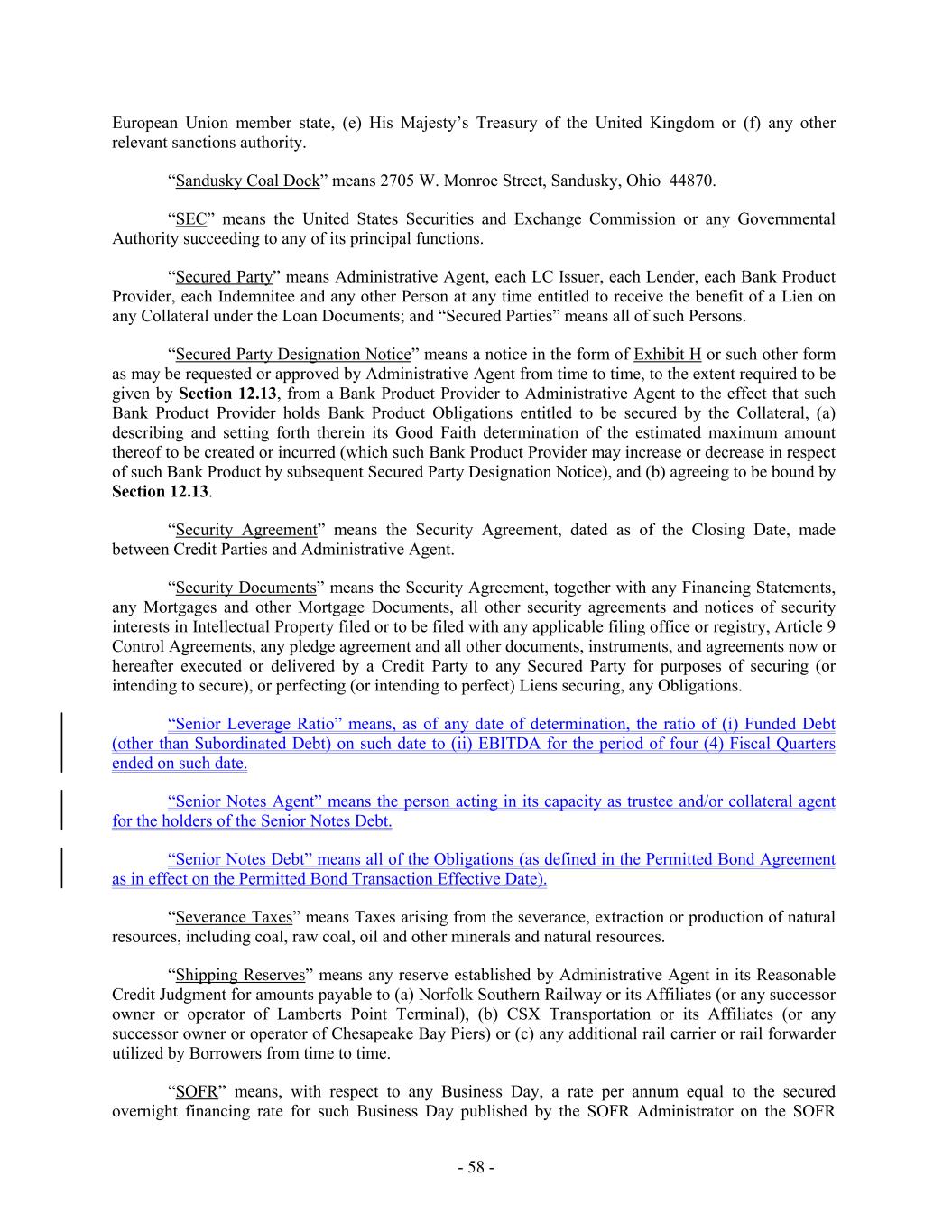 European Union member state, (e) His Majesty’s Treasury of the United Kingdom or (f) any other relevant sanctions authority. “Sandusky Coal Dock” means 2705 W. Monroe Street, Sandusky, Ohio 44870. “SEC” means the United States Securities and Exchange Commission or any Governmental Authority succeeding to any of its principal functions. “Secured Party” means Administrative Agent, each LC Issuer, each Lender, each Bank Product Provider, each Indemnitee and any other Person at any time entitled to receive the benefit of a Lien on any Collateral under the Loan Documents; and “Secured Parties” means all of such Persons. “Secured Party Designation Notice” means a notice in the form of Exhibit H or such other form as may be requested or approved by Administrative Agent from time to time, to the extent required to be given by Section 12.13, from a Bank Product Provider to Administrative Agent to the effect that such Bank Product Provider holds Bank Product Obligations entitled to be secured by the Collateral, (a) describing and setting forth therein its Good Faith determination of the estimated maximum amount thereof to be created or incurred (which such Bank Product Provider may increase or decrease in respect of such Bank Product by subsequent Secured Party Designation Notice), and (b) agreeing to be bound by Section 12.13. “Security Agreement” means the Security Agreement, dated as of the Closing Date, made between Credit Parties and Administrative Agent. “Security Documents” means the Security Agreement, together with any Financing Statements, any Mortgages and other Mortgage Documents, all other security agreements and notices of security interests in Intellectual Property filed or to be filed with any applicable filing office or registry, Article 9 Control Agreements, any pledge agreement and all other documents, instruments, and agreements now or hereafter executed or delivered by a Credit Party to any Secured Party for purposes of securing (or intending to secure), or perfecting (or intending to perfect) Liens securing, any Obligations. “Senior Leverage Ratio” means, as of any date of determination, the ratio of (i) Funded Debt (other than Subordinated Debt) on such date to (ii) EBITDA for the period of four (4) Fiscal Quarters ended on such date. “Senior Notes Agent” means the person acting in its capacity as trustee and/or collateral agent for the holders of the Senior Notes Debt. “Senior Notes Debt” means all of the Obligations (as defined in the Permitted Bond Agreement as in effect on the Permitted Bond Transaction Effective Date). “Severance Taxes” means Taxes arising from the severance, extraction or production of natural resources, including coal, raw coal, oil and other minerals and natural resources. “Shipping Reserves” means any reserve established by Administrative Agent in its Reasonable Credit Judgment for amounts payable to (a) Norfolk Southern Railway or its Affiliates (or any successor owner or operator of Lamberts Point Terminal), (b) CSX Transportation or its Affiliates (or any successor owner or operator of Chesapeake Bay Piers) or (c) any additional rail carrier or rail forwarder utilized by Borrowers from time to time. “SOFR” means, with respect to any Business Day, a rate per annum equal to the secured overnight financing rate for such Business Day published by the SOFR Administrator on the SOFR - 58 -