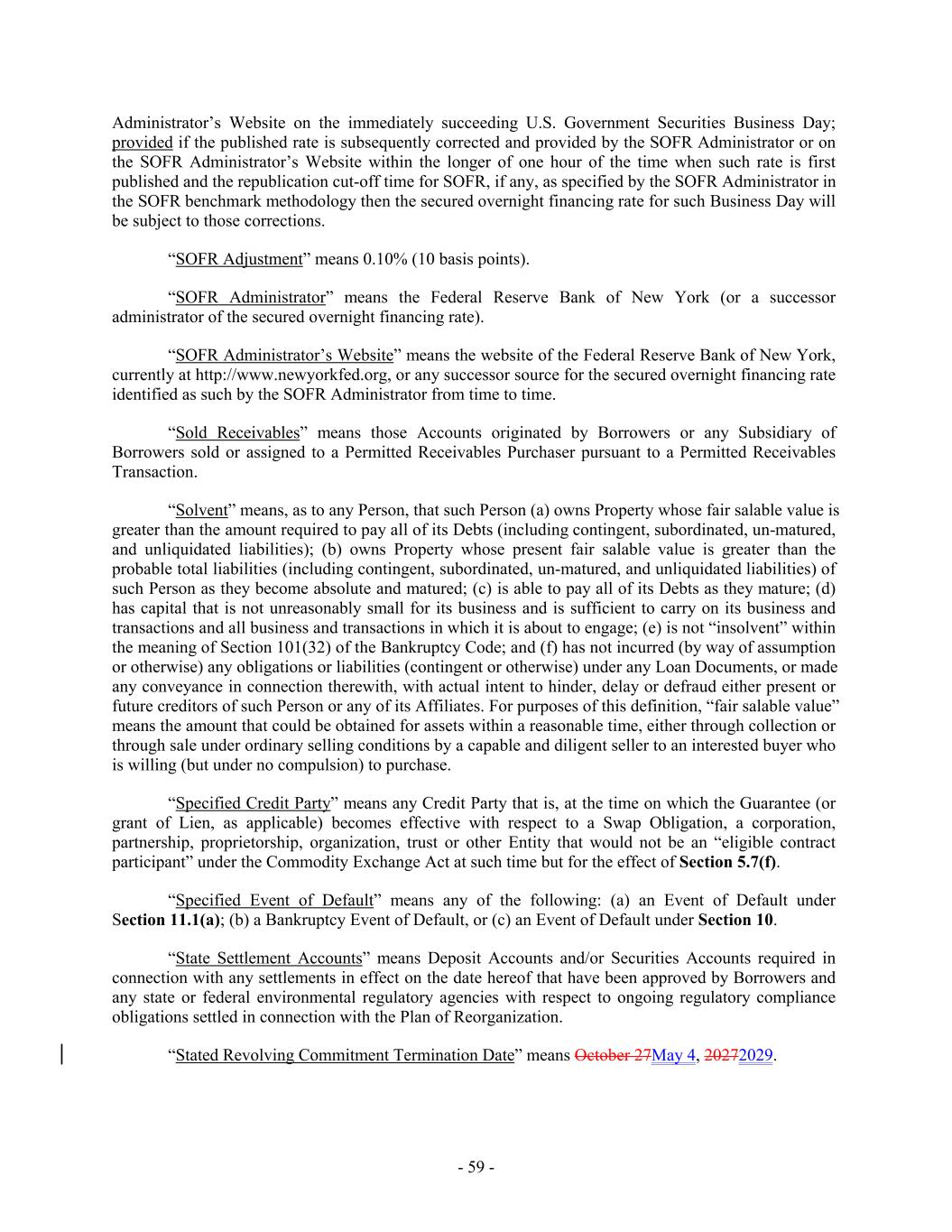 Administrator’s Website on the immediately succeeding U.S. Government Securities Business Day; provided if the published rate is subsequently corrected and provided by the SOFR Administrator or on the SOFR Administrator’s Website within the longer of one hour of the time when such rate is first published and the republication cut-off time for SOFR, if any, as specified by the SOFR Administrator in the SOFR benchmark methodology then the secured overnight financing rate for such Business Day will be subject to those corrections. “SOFR Adjustment” means 0.10% (10 basis points). “SOFR Administrator” means the Federal Reserve Bank of New York (or a successor administrator of the secured overnight financing rate). “SOFR Administrator’s Website” means the website of the Federal Reserve Bank of New York, currently at http://www.newyorkfed.org, or any successor source for the secured overnight financing rate identified as such by the SOFR Administrator from time to time. “Sold Receivables” means those Accounts originated by Borrowers or any Subsidiary of Borrowers sold or assigned to a Permitted Receivables Purchaser pursuant to a Permitted Receivables Transaction. “Solvent” means, as to any Person, that such Person (a) owns Property whose fair salable value is greater than the amount required to pay all of its Debts (including contingent, subordinated, un-matured, and unliquidated liabilities); (b) owns Property whose present fair salable value is greater than the probable total liabilities (including contingent, subordinated, un-matured, and unliquidated liabilities) of such Person as they become absolute and matured; (c) is able to pay all of its Debts as they mature; (d) has capital that is not unreasonably small for its business and is sufficient to carry on its business and transactions and all business and transactions in which it is about to engage; (e) is not “insolvent” within the meaning of Section 101(32) of the Bankruptcy Code; and (f) has not incurred (by way of assumption or otherwise) any obligations or liabilities (contingent or otherwise) under any Loan Documents, or made any conveyance in connection therewith, with actual intent to hinder, delay or defraud either present or future creditors of such Person or any of its Affiliates. For purposes of this definition, “fair salable value” means the amount that could be obtained for assets within a reasonable time, either through collection or through sale under ordinary selling conditions by a capable and diligent seller to an interested buyer who is willing (but under no compulsion) to purchase. “Specified Credit Party” means any Credit Party that is, at the time on which the Guarantee (or grant of Lien, as applicable) becomes effective with respect to a Swap Obligation, a corporation, partnership, proprietorship, organization, trust or other Entity that would not be an “eligible contract participant” under the Commodity Exchange Act at such time but for the effect of Section 5.7(f). “Specified Event of Default” means any of the following: (a) an Event of Default under Section 11.1(a); (b) a Bankruptcy Event of Default, or (c) an Event of Default under Section 10. “State Settlement Accounts” means Deposit Accounts and/or Securities Accounts required in connection with any settlements in effect on the date hereof that have been approved by Borrowers and any state or federal environmental regulatory agencies with respect to ongoing regulatory compliance obligations settled in connection with the Plan of Reorganization. “Stated Revolving Commitment Termination Date” means October 27May 4, 20272029. - 59 -