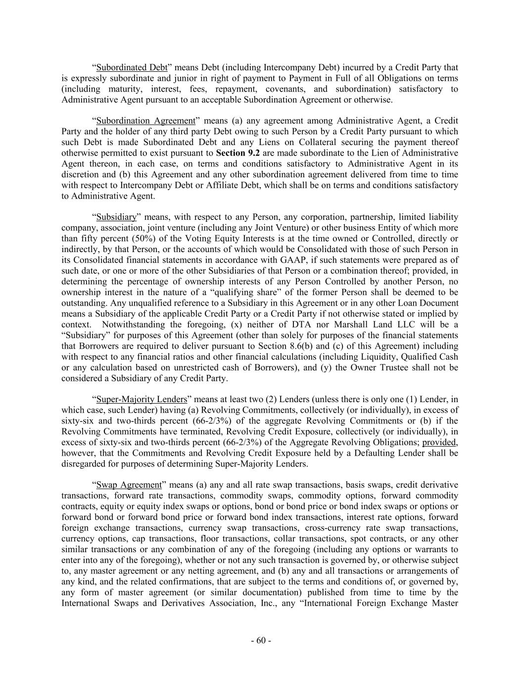 “Subordinated Debt” means Debt (including Intercompany Debt) incurred by a Credit Party that is expressly subordinate and junior in right of payment to Payment in Full of all Obligations on terms (including maturity, interest, fees, repayment, covenants, and subordination) satisfactory to Administrative Agent pursuant to an acceptable Subordination Agreement or otherwise. “Subordination Agreement” means (a) any agreement among Administrative Agent, a Credit Party and the holder of any third party Debt owing to such Person by a Credit Party pursuant to which such Debt is made Subordinated Debt and any Liens on Collateral securing the payment thereof otherwise permitted to exist pursuant to Section 9.2 are made subordinate to the Lien of Administrative Agent thereon, in each case, on terms and conditions satisfactory to Administrative Agent in its discretion and (b) this Agreement and any other subordination agreement delivered from time to time with respect to Intercompany Debt or Affiliate Debt, which shall be on terms and conditions satisfactory to Administrative Agent. “Subsidiary” means, with respect to any Person, any corporation, partnership, limited liability company, association, joint venture (including any Joint Venture) or other business Entity of which more than fifty percent (50%) of the Voting Equity Interests is at the time owned or Controlled, directly or indirectly, by that Person, or the accounts of which would be Consolidated with those of such Person in its Consolidated financial statements in accordance with GAAP, if such statements were prepared as of such date, or one or more of the other Subsidiaries of that Person or a combination thereof; provided, in determining the percentage of ownership interests of any Person Controlled by another Person, no ownership interest in the nature of a “qualifying share” of the former Person shall be deemed to be outstanding. Any unqualified reference to a Subsidiary in this Agreement or in any other Loan Document means a Subsidiary of the applicable Credit Party or a Credit Party if not otherwise stated or implied by context. Notwithstanding the foregoing, (x) neither of DTA nor Marshall Land LLC will be a “Subsidiary” for purposes of this Agreement (other than solely for purposes of the financial statements that Borrowers are required to deliver pursuant to Section 8.6(b) and (c) of this Agreement) including with respect to any financial ratios and other financial calculations (including Liquidity, Qualified Cash or any calculation based on unrestricted cash of Borrowers), and (y) the Owner Trustee shall not be considered a Subsidiary of any Credit Party. “Super-Majority Lenders” means at least two (2) Lenders (unless there is only one (1) Lender, in which case, such Lender) having (a) Revolving Commitments, collectively (or individually), in excess of sixty-six and two-thirds percent (66-2/3%) of the aggregate Revolving Commitments or (b) if the Revolving Commitments have terminated, Revolving Credit Exposure, collectively (or individually), in excess of sixty-six and two-thirds percent (66-2/3%) of the Aggregate Revolving Obligations; provided, however, that the Commitments and Revolving Credit Exposure held by a Defaulting Lender shall be disregarded for purposes of determining Super-Majority Lenders. “Swap Agreement” means (a) any and all rate swap transactions, basis swaps, credit derivative transactions, forward rate transactions, commodity swaps, commodity options, forward commodity contracts, equity or equity index swaps or options, bond or bond price or bond index swaps or options or forward bond or forward bond price or forward bond index transactions, interest rate options, forward foreign exchange transactions, currency swap transactions, cross-currency rate swap transactions, currency options, cap transactions, floor transactions, collar transactions, spot contracts, or any other similar transactions or any combination of any of the foregoing (including any options or warrants to enter into any of the foregoing), whether or not any such transaction is governed by, or otherwise subject to, any master agreement or any netting agreement, and (b) any and all transactions or arrangements of any kind, and the related confirmations, that are subject to the terms and conditions of, or governed by, any form of master agreement (or similar documentation) published from time to time by the International Swaps and Derivatives Association, Inc., any “International Foreign Exchange Master - 60 -