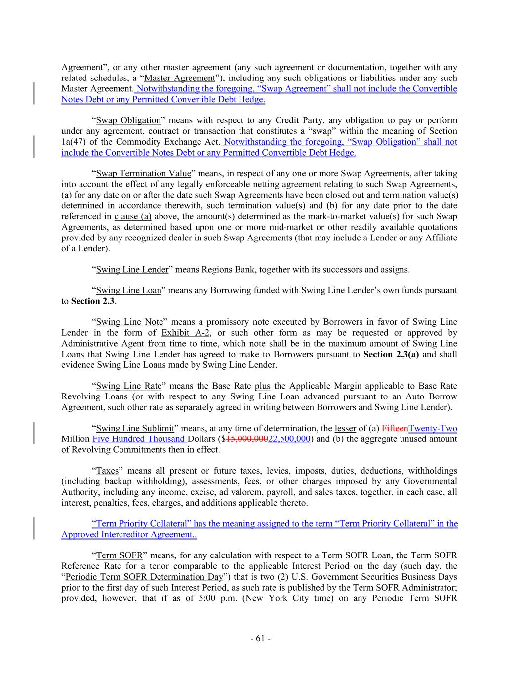 Agreement”, or any other master agreement (any such agreement or documentation, together with any related schedules, a “Master Agreement”), including any such obligations or liabilities under any such Master Agreement. Notwithstanding the foregoing, “Swap Agreement” shall not include the Convertible Notes Debt or any Permitted Convertible Debt Hedge. “Swap Obligation” means with respect to any Credit Party, any obligation to pay or perform under any agreement, contract or transaction that constitutes a “swap” within the meaning of Section 1a(47) of the Commodity Exchange Act. Notwithstanding the foregoing, “Swap Obligation” shall not include the Convertible Notes Debt or any Permitted Convertible Debt Hedge. “Swap Termination Value” means, in respect of any one or more Swap Agreements, after taking into account the effect of any legally enforceable netting agreement relating to such Swap Agreements, (a) for any date on or after the date such Swap Agreements have been closed out and termination value(s) determined in accordance therewith, such termination value(s) and (b) for any date prior to the date referenced in clause (a) above, the amount(s) determined as the mark-to-market value(s) for such Swap Agreements, as determined based upon one or more mid-market or other readily available quotations provided by any recognized dealer in such Swap Agreements (that may include a Lender or any Affiliate of a Lender). “Swing Line Lender” means Regions Bank, together with its successors and assigns. “Swing Line Loan” means any Borrowing funded with Swing Line Lender’s own funds pursuant to Section 2.3. “Swing Line Note” means a promissory note executed by Borrowers in favor of Swing Line Lender in the form of Exhibit A-2, or such other form as may be requested or approved by Administrative Agent from time to time, which note shall be in the maximum amount of Swing Line Loans that Swing Line Lender has agreed to make to Borrowers pursuant to Section 2.3(a) and shall evidence Swing Line Loans made by Swing Line Lender. “Swing Line Rate” means the Base Rate plus the Applicable Margin applicable to Base Rate Revolving Loans (or with respect to any Swing Line Loan advanced pursuant to an Auto Borrow Agreement, such other rate as separately agreed in writing between Borrowers and Swing Line Lender). “Swing Line Sublimit” means, at any time of determination, the lesser of (a) FifteenTwenty-Two Million Five Hundred Thousand Dollars ($15,000,00022,500,000) and (b) the aggregate unused amount of Revolving Commitments then in effect. “Taxes” means all present or future taxes, levies, imposts, duties, deductions, withholdings (including backup withholding), assessments, fees, or other charges imposed by any Governmental Authority, including any income, excise, ad valorem, payroll, and sales taxes, together, in each case, all interest, penalties, fees, charges, and additions applicable thereto. “Term Priority Collateral” has the meaning assigned to the term “Term Priority Collateral” in the Approved Intercreditor Agreement.. “Term SOFR” means, for any calculation with respect to a Term SOFR Loan, the Term SOFR Reference Rate for a tenor comparable to the applicable Interest Period on the day (such day, the “Periodic Term SOFR Determination Day”) that is two (2) U.S. Government Securities Business Days prior to the first day of such Interest Period, as such rate is published by the Term SOFR Administrator; provided, however, that if as of 5:00 p.m. (New York City time) on any Periodic Term SOFR - 61 -