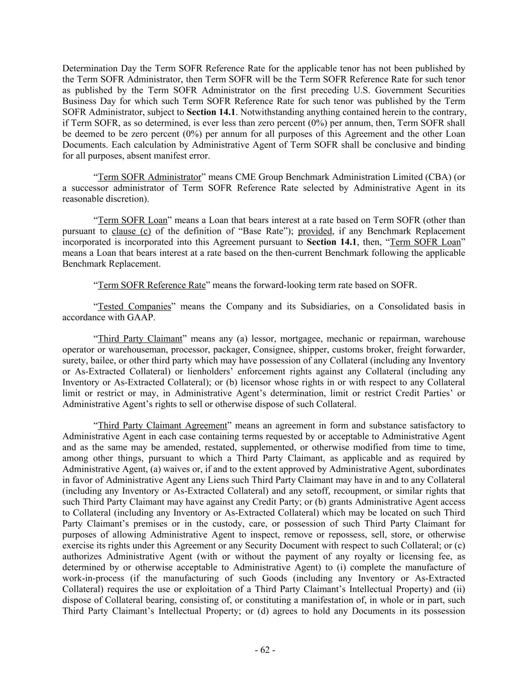 Determination Day the Term SOFR Reference Rate for the applicable tenor has not been published by the Term SOFR Administrator, then Term SOFR will be the Term SOFR Reference Rate for such tenor as published by the Term SOFR Administrator on the first preceding U.S. Government Securities Business Day for which such Term SOFR Reference Rate for such tenor was published by the Term SOFR Administrator, subject to Section 14.1. Notwithstanding anything contained herein to the contrary, if Term SOFR, as so determined, is ever less than zero percent (0%) per annum, then, Term SOFR shall be deemed to be zero percent (0%) per annum for all purposes of this Agreement and the other Loan Documents. Each calculation by Administrative Agent of Term SOFR shall be conclusive and binding for all purposes, absent manifest error. “Term SOFR Administrator” means CME Group Benchmark Administration Limited (CBA) (or a successor administrator of Term SOFR Reference Rate selected by Administrative Agent in its reasonable discretion). “Term SOFR Loan” means a Loan that bears interest at a rate based on Term SOFR (other than pursuant to clause (c) of the definition of “Base Rate”); provided, if any Benchmark Replacement incorporated is incorporated into this Agreement pursuant to Section 14.1, then, “Term SOFR Loan” means a Loan that bears interest at a rate based on the then-current Benchmark following the applicable Benchmark Replacement. “Term SOFR Reference Rate” means the forward-looking term rate based on SOFR. “Tested Companies” means the Company and its Subsidiaries, on a Consolidated basis in accordance with GAAP. “Third Party Claimant” means any (a) lessor, mortgagee, mechanic or repairman, warehouse operator or warehouseman, processor, packager, Consignee, shipper, customs broker, freight forwarder, surety, bailee, or other third party which may have possession of any Collateral (including any Inventory or As-Extracted Collateral) or lienholders’ enforcement rights against any Collateral (including any Inventory or As-Extracted Collateral); or (b) licensor whose rights in or with respect to any Collateral limit or restrict or may, in Administrative Agent’s determination, limit or restrict Credit Parties’ or Administrative Agent’s rights to sell or otherwise dispose of such Collateral. “Third Party Claimant Agreement” means an agreement in form and substance satisfactory to Administrative Agent in each case containing terms requested by or acceptable to Administrative Agent and as the same may be amended, restated, supplemented, or otherwise modified from time to time, among other things, pursuant to which a Third Party Claimant, as applicable and as required by Administrative Agent, (a) waives or, if and to the extent approved by Administrative Agent, subordinates in favor of Administrative Agent any Liens such Third Party Claimant may have in and to any Collateral (including any Inventory or As-Extracted Collateral) and any setoff, recoupment, or similar rights that such Third Party Claimant may have against any Credit Party; or (b) grants Administrative Agent access to Collateral (including any Inventory or As-Extracted Collateral) which may be located on such Third Party Claimant’s premises or in the custody, care, or possession of such Third Party Claimant for purposes of allowing Administrative Agent to inspect, remove or repossess, sell, store, or otherwise exercise its rights under this Agreement or any Security Document with respect to such Collateral; or (c) authorizes Administrative Agent (with or without the payment of any royalty or licensing fee, as determined by or otherwise acceptable to Administrative Agent) to (i) complete the manufacture of work-in-process (if the manufacturing of such Goods (including any Inventory or As-Extracted Collateral) requires the use or exploitation of a Third Party Claimant’s Intellectual Property) and (ii) dispose of Collateral bearing, consisting of, or constituting a manifestation of, in whole or in part, such Third Party Claimant’s Intellectual Property; or (d) agrees to hold any Documents in its possession - 62 -