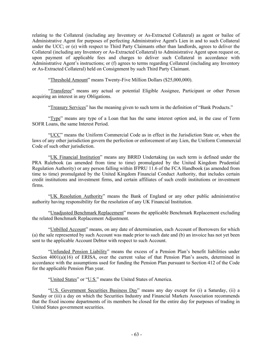 relating to the Collateral (including any Inventory or As-Extracted Collateral) as agent or bailee of Administrative Agent for purposes of perfecting Administrative Agent's Lien in and to such Collateral under the UCC; or (e) with respect to Third Party Claimants other than landlords, agrees to deliver the Collateral (including any Inventory or As-Extracted Collateral) to Administrative Agent upon request or, upon payment of applicable fees and charges to deliver such Collateral in accordance with Administrative Agent’s instructions; or (f) agrees to terms regarding Collateral (including any Inventory or As-Extracted Collateral) held on Consignment by such Third Party Claimant. “Threshold Amount” means Twenty-Five Million Dollars ($25,000,000). “Transferee” means any actual or potential Eligible Assignee, Participant or other Person acquiring an interest in any Obligations. “Treasury Services” has the meaning given to such term in the definition of “Bank Products.” “Type” means any type of a Loan that has the same interest option and, in the case of Term SOFR Loans, the same Interest Period. “UCC” means the Uniform Commercial Code as in effect in the Jurisdiction State or, when the laws of any other jurisdiction govern the perfection or enforcement of any Lien, the Uniform Commercial Code of such other jurisdiction. “UK Financial Institution” means any BRRD Undertaking (as such term is defined under the PRA Rulebook (as amended from time to time) promulgated by the United Kingdom Prudential Regulation Authority) or any person falling within IFPRU 11.6 of the FCA Handbook (as amended from time to time) promulgated by the United Kingdom Financial Conduct Authority, that includes certain credit institutions and investment firms, and certain affiliates of such credit institutions or investment firms. “UK Resolution Authority” means the Bank of England or any other public administrative authority having responsibility for the resolution of any UK Financial Institution. “Unadjusted Benchmark Replacement” means the applicable Benchmark Replacement excluding the related Benchmark Replacement Adjustment. “Unbilled Account” means, on any date of determination, each Account of Borrowers for which (a) the sale represented by such Account was made prior to such date and (b) an invoice has not yet been sent to the applicable Account Debtor with respect to such Account. “Unfunded Pension Liability” means the excess of a Pension Plan’s benefit liabilities under Section 4001(a)(16) of ERISA, over the current value of that Pension Plan’s assets, determined in accordance with the assumptions used for funding the Pension Plan pursuant to Section 412 of the Code for the applicable Pension Plan year. “United States” or “U.S.” means the United States of America. “U.S. Government Securities Business Day” means any day except for (i) a Saturday, (ii) a Sunday or (iii) a day on which the Securities Industry and Financial Markets Association recommends that the fixed income departments of its members be closed for the entire day for purposes of trading in United States government securities. - 63 -