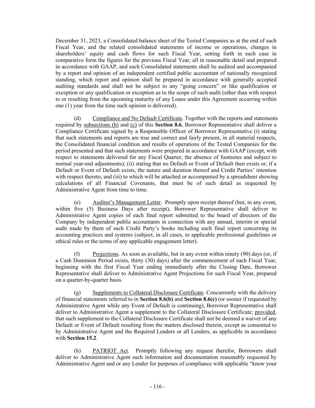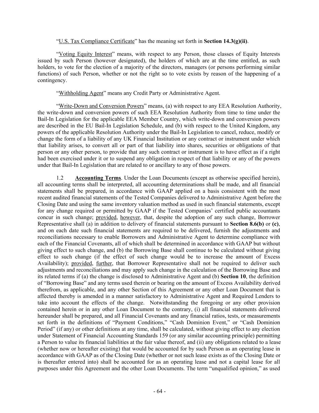 “U.S. Tax Compliance Certificate” has the meaning set forth in Section 14.3(g)(ii). “Voting Equity Interest” means, with respect to any Person, those classes of Equity Interests issued by such Person (however designated), the holders of which are at the time entitled, as such holders, to vote for the election of a majority of the directors, managers (or persons performing similar functions) of such Person, whether or not the right so to vote exists by reason of the happening of a contingency. “Withholding Agent” means any Credit Party or Administrative Agent. “Write-Down and Conversion Powers” means, (a) with respect to any EEA Resolution Authority, the write-down and conversion powers of such EEA Resolution Authority from time to time under the Bail-In Legislation for the applicable EEA Member Country, which write-down and conversion powers are described in the EU Bail-In Legislation Schedule, and (b) with respect to the United Kingdom, any powers of the applicable Resolution Authority under the Bail-In Legislation to cancel, reduce, modify or change the form of a liability of any UK Financial Institution or any contract or instrument under which that liability arises, to convert all or part of that liability into shares, securities or obligations of that person or any other person, to provide that any such contract or instrument is to have effect as if a right had been exercised under it or to suspend any obligation in respect of that liability or any of the powers under that Bail-In Legislation that are related to or ancillary to any of those powers. 1.2 Accounting Terms. Under the Loan Documents (except as otherwise specified herein), all accounting terms shall be interpreted, all accounting determinations shall be made, and all financial statements shall be prepared, in accordance with GAAP applied on a basis consistent with the most recent audited financial statements of the Tested Companies delivered to Administrative Agent before the Closing Date and using the same inventory valuation method as used in such financial statements, except for any change required or permitted by GAAP if the Tested Companies’ certified public accountants concur in such change; provided, however, that, despite the adoption of any such change, Borrower Representative shall (a) in addition to delivery of financial statements pursuant to Section 8.6(b) or (c), and on each date such financial statements are required to be delivered, furnish the adjustments and reconciliations necessary to enable Borrowers and Administrative Agent to determine compliance with each of the Financial Covenants, all of which shall be determined in accordance with GAAP but without giving effect to such change, and (b) the Borrowing Base shall continue to be calculated without giving effect to such change (if the effect of such change would be to increase the amount of Excess Availability); provided, further, that Borrower Representative shall not be required to deliver such adjustments and reconciliations and may apply such change in the calculation of the Borrowing Base and its related terms if (a) the change is disclosed to Administrative Agent and (b) Section 10, the definition of “Borrowing Base” and any terms used therein or bearing on the amount of Excess Availability derived therefrom, as applicable, and any other Section of this Agreement or any other Loan Document that is affected thereby is amended in a manner satisfactory to Administrative Agent and Required Lenders to take into account the effects of the change. Notwithstanding the foregoing or any other provision contained herein or in any other Loan Document to the contrary, (i) all financial statements delivered hereunder shall be prepared, and all Financial Covenants and any financial ratios, tests, or measurements set forth in the definitions of “Payment Conditions,” “Cash Dominion Event,” or “Cash Dominion Period” (if any) or other definitions at any time, shall be calculated, without giving effect to any election under Statement of Financial Accounting Standards 159 (or any similar accounting principle) permitting a Person to value its financial liabilities at the fair value thereof, and (ii) any obligations related to a lease (whether now or hereafter existing) that would be accounted for by such Person as an operating lease in accordance with GAAP as of the Closing Date (whether or not such lease exists as of the Closing Date or is thereafter entered into) shall be accounted for as an operating lease and not a capital lease for all purposes under this Agreement and the other Loan Documents. The term “unqualified opinion,” as used - 64 -