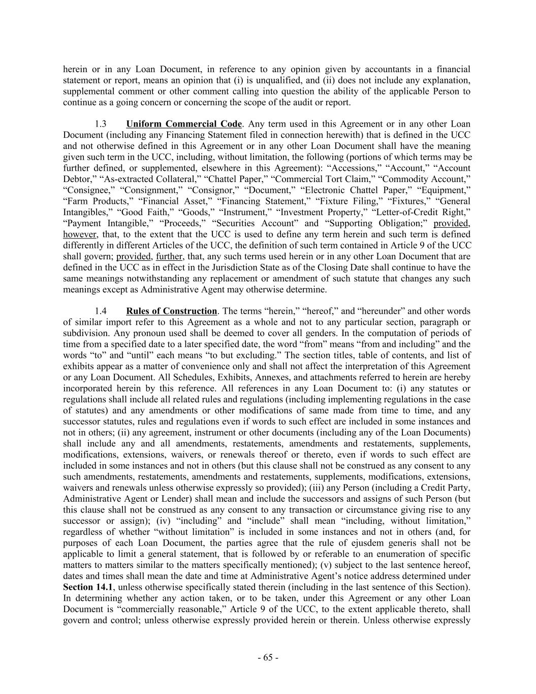 herein or in any Loan Document, in reference to any opinion given by accountants in a financial statement or report, means an opinion that (i) is unqualified, and (ii) does not include any explanation, supplemental comment or other comment calling into question the ability of the applicable Person to continue as a going concern or concerning the scope of the audit or report. 1.3 Uniform Commercial Code. Any term used in this Agreement or in any other Loan Document (including any Financing Statement filed in connection herewith) that is defined in the UCC and not otherwise defined in this Agreement or in any other Loan Document shall have the meaning given such term in the UCC, including, without limitation, the following (portions of which terms may be further defined, or supplemented, elsewhere in this Agreement): “Accessions,” “Account,” “Account Debtor,” “As-extracted Collateral,” “Chattel Paper,” “Commercial Tort Claim,” “Commodity Account,” “Consignee,” “Consignment,” “Consignor,” “Document,” “Electronic Chattel Paper,” “Equipment,” “Farm Products,” “Financial Asset,” “Financing Statement,” “Fixture Filing,” “Fixtures,” “General Intangibles,” “Good Faith,” “Goods,” “Instrument,” “Investment Property,” “Letter-of-Credit Right,” “Payment Intangible,” “Proceeds,” “Securities Account” and “Supporting Obligation;” provided, however, that, to the extent that the UCC is used to define any term herein and such term is defined differently in different Articles of the UCC, the definition of such term contained in Article 9 of the UCC shall govern; provided, further, that, any such terms used herein or in any other Loan Document that are defined in the UCC as in effect in the Jurisdiction State as of the Closing Date shall continue to have the same meanings notwithstanding any replacement or amendment of such statute that changes any such meanings except as Administrative Agent may otherwise determine. 1.4 Rules of Construction. The terms “herein,” “hereof,” and “hereunder” and other words of similar import refer to this Agreement as a whole and not to any particular section, paragraph or subdivision. Any pronoun used shall be deemed to cover all genders. In the computation of periods of time from a specified date to a later specified date, the word “from” means “from and including” and the words “to” and “until” each means “to but excluding.” The section titles, table of contents, and list of exhibits appear as a matter of convenience only and shall not affect the interpretation of this Agreement or any Loan Document. All Schedules, Exhibits, Annexes, and attachments referred to herein are hereby incorporated herein by this reference. All references in any Loan Document to: (i) any statutes or regulations shall include all related rules and regulations (including implementing regulations in the case of statutes) and any amendments or other modifications of same made from time to time, and any successor statutes, rules and regulations even if words to such effect are included in some instances and not in others; (ii) any agreement, instrument or other documents (including any of the Loan Documents) shall include any and all amendments, restatements, amendments and restatements, supplements, modifications, extensions, waivers, or renewals thereof or thereto, even if words to such effect are included in some instances and not in others (but this clause shall not be construed as any consent to any such amendments, restatements, amendments and restatements, supplements, modifications, extensions, waivers and renewals unless otherwise expressly so provided); (iii) any Person (including a Credit Party, Administrative Agent or Lender) shall mean and include the successors and assigns of such Person (but this clause shall not be construed as any consent to any transaction or circumstance giving rise to any successor or assign); (iv) “including” and “include” shall mean “including, without limitation,” regardless of whether “without limitation” is included in some instances and not in others (and, for purposes of each Loan Document, the parties agree that the rule of ejusdem generis shall not be applicable to limit a general statement, that is followed by or referable to an enumeration of specific matters to matters similar to the matters specifically mentioned); (v) subject to the last sentence hereof, dates and times shall mean the date and time at Administrative Agent’s notice address determined under Section 14.1, unless otherwise specifically stated therein (including in the last sentence of this Section). In determining whether any action taken, or to be taken, under this Agreement or any other Loan Document is “commercially reasonable,” Article 9 of the UCC, to the extent applicable thereto, shall govern and control; unless otherwise expressly provided herein or therein. Unless otherwise expressly - 65 -