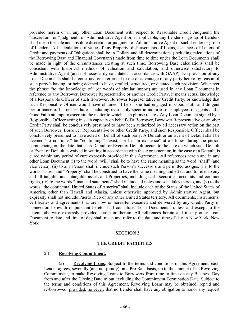 provided herein or in any other Loan Document with respect to Reasonable Credit Judgment, the “discretion” or “judgment” of Administrative Agent or, if applicable, any Lender or group of Lenders shall mean the sole and absolute discretion or judgment of Administrative Agent or such Lender or group of Lenders. All calculations of value of any Property, disbursements of Loans, issuances of Letters of Credit and payments of Obligations shall be in Dollars and all determinations (including calculations of the Borrowing Base and Financial Covenants) made from time to time under the Loan Documents shall be made in light of the circumstances existing at such time. Borrowing Base calculations shall be consistent with historical methods of valuation and calculation, and otherwise satisfactory to Administrative Agent (and not necessarily calculated in accordance with GAAP). No provision of any Loan Documents shall be construed or interpreted to the disadvantage of any party hereto by reason of such party’s having, or being deemed to have, drafted, structured, or dictated such provision. Whenever the phrase “to the knowledge of” (or words of similar import) are used in any Loan Document in reference to any Borrower, Borrower Representative or another Credit Party, it means actual knowledge of a Responsible Officer of such Borrower, Borrower Representative or Credit Party, or knowledge that such Responsible Officer would have obtained if he or she had engaged in Good Faith and diligent performance of his or her duties, including reasonably specific inquiries of employees or agents and a Good Faith attempt to ascertain the matter to which such phrase relates. Any Loan Document signed by a Responsible Officer acting in such capacity on behalf of a Borrower, Borrower Representative or another Credit Party shall be conclusively presumed to have been authorized by all necessary action on the part of such Borrower, Borrower Representative or other Credit Party, and such Responsible Officer shall be conclusively presumed to have acted on behalf of such party. A Default or an Event of Default shall be deemed “to continue,” be “continuing,” “exist,” or be “in existence” at all times during the period commencing on the date that such Default or Event of Default occurs to the date on which such Default or Event of Default is waived in writing in accordance with this Agreement or, in the case of a Default, is cured within any period of cure expressly provided in this Agreement. All references herein and in any other Loan Document (i) to the word “will” shall be to have the same meaning as the word “shall” (and vice versa), (ii) to any Person shall include such Person’s successors and permitted assigns, (iii) to the words “asset” and “Property” shall be construed to have the same meaning and effect and to refer to any and all tangible and intangible assets and Properties, including cash, securities, accounts and contract rights, (iv) to the words “financial statements” shall include all notes and schedules thereto, and (v) to the words “the continental United States of America” shall include each of the States of the United States of America, other than Hawaii and Alaska, unless otherwise approved by Administrative Agent, but expressly shall not include Puerto Rico or any other United States territory. All documents, instruments, certificates and agreements that are now or hereafter executed and delivered by any Credit Party in connection herewith or pursuant hereto shall constitute “Loan Documents” unless and except to the extent otherwise expressly provided herein or therein. All references herein and in any other Loan Document to date and time of day shall mean and refer to the date and time of day in New York, New York. SECTION 2. THE CREDIT FACILITIES 2.1 Revolving Commitment. (a) Revolving Loans. Subject to the terms and conditions of this Agreement, each Lender agrees, severally (and not jointly) on a Pro Rata basis, up to the amount of its Revolving Commitment, to make Revolving Loans to Borrowers from time to time on any Business Day from and after the Closing Date to but excluding the Commitment Termination Date. Subject to the terms and conditions of this Agreement, Revolving Loans may be obtained, repaid and re-borrowed; provided, however, that no Lender shall have any obligation to honor any request - 66 -