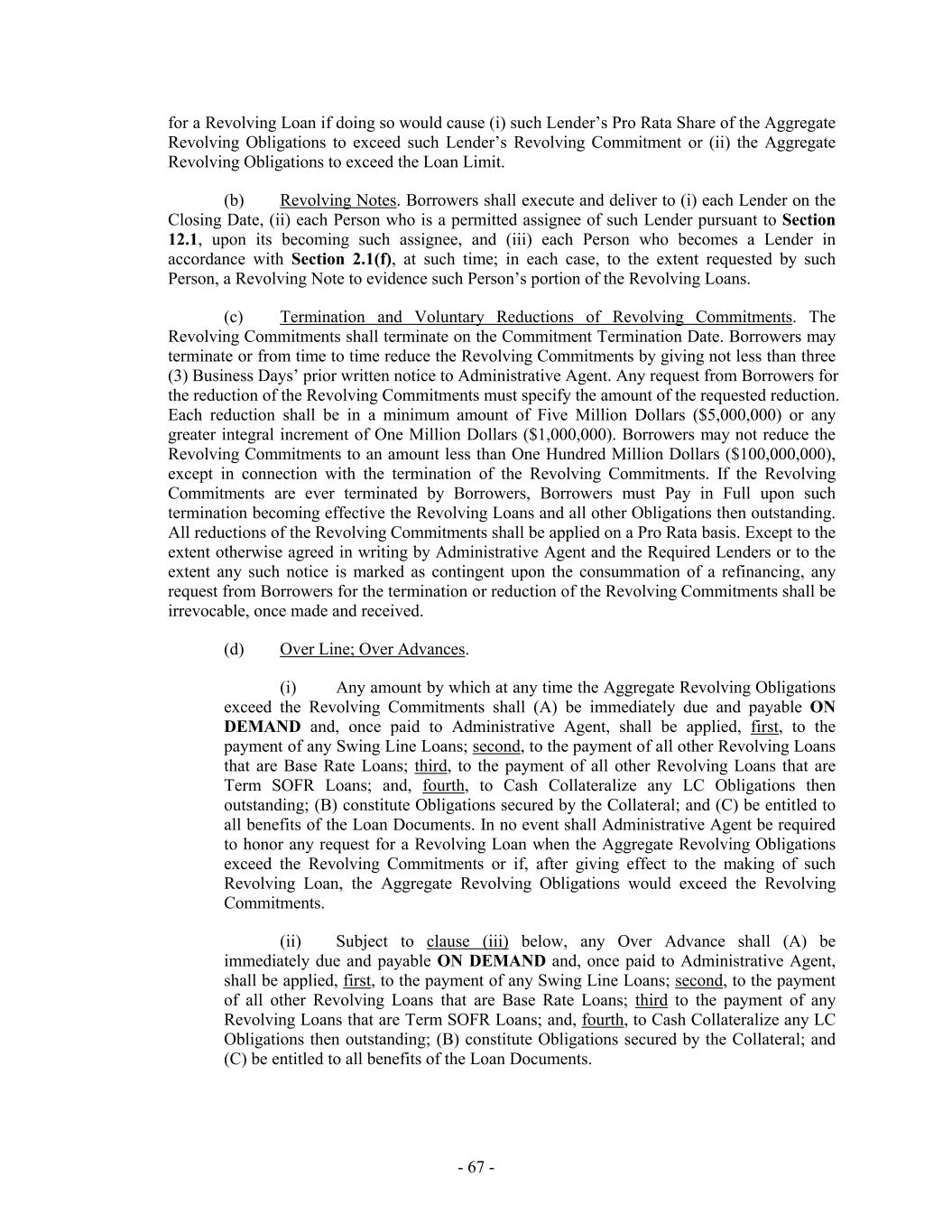 for a Revolving Loan if doing so would cause (i) such Lender’s Pro Rata Share of the Aggregate Revolving Obligations to exceed such Lender’s Revolving Commitment or (ii) the Aggregate Revolving Obligations to exceed the Loan Limit. (b) Revolving Notes. Borrowers shall execute and deliver to (i) each Lender on the Closing Date, (ii) each Person who is a permitted assignee of such Lender pursuant to Section 12.1, upon its becoming such assignee, and (iii) each Person who becomes a Lender in accordance with Section 2.1(f), at such time; in each case, to the extent requested by such Person, a Revolving Note to evidence such Person’s portion of the Revolving Loans. (c) Termination and Voluntary Reductions of Revolving Commitments. The Revolving Commitments shall terminate on the Commitment Termination Date. Borrowers may terminate or from time to time reduce the Revolving Commitments by giving not less than three (3) Business Days’ prior written notice to Administrative Agent. Any request from Borrowers for the reduction of the Revolving Commitments must specify the amount of the requested reduction. Each reduction shall be in a minimum amount of Five Million Dollars ($5,000,000) or any greater integral increment of One Million Dollars ($1,000,000). Borrowers may not reduce the Revolving Commitments to an amount less than One Hundred Million Dollars ($100,000,000), except in connection with the termination of the Revolving Commitments. If the Revolving Commitments are ever terminated by Borrowers, Borrowers must Pay in Full upon such termination becoming effective the Revolving Loans and all other Obligations then outstanding. All reductions of the Revolving Commitments shall be applied on a Pro Rata basis. Except to the extent otherwise agreed in writing by Administrative Agent and the Required Lenders or to the extent any such notice is marked as contingent upon the consummation of a refinancing, any request from Borrowers for the termination or reduction of the Revolving Commitments shall be irrevocable, once made and received. (d) Over Line; Over Advances. (i) Any amount by which at any time the Aggregate Revolving Obligations exceed the Revolving Commitments shall (A) be immediately due and payable ON DEMAND and, once paid to Administrative Agent, shall be applied, first, to the payment of any Swing Line Loans; second, to the payment of all other Revolving Loans that are Base Rate Loans; third, to the payment of all other Revolving Loans that are Term SOFR Loans; and, fourth, to Cash Collateralize any LC Obligations then outstanding; (B) constitute Obligations secured by the Collateral; and (C) be entitled to all benefits of the Loan Documents. In no event shall Administrative Agent be required to honor any request for a Revolving Loan when the Aggregate Revolving Obligations exceed the Revolving Commitments or if, after giving effect to the making of such Revolving Loan, the Aggregate Revolving Obligations would exceed the Revolving Commitments. (ii) Subject to clause (iii) below, any Over Advance shall (A) be immediately due and payable ON DEMAND and, once paid to Administrative Agent, shall be applied, first, to the payment of any Swing Line Loans; second, to the payment of all other Revolving Loans that are Base Rate Loans; third to the payment of any Revolving Loans that are Term SOFR Loans; and, fourth, to Cash Collateralize any LC Obligations then outstanding; (B) constitute Obligations secured by the Collateral; and (C) be entitled to all benefits of the Loan Documents. - 67 -