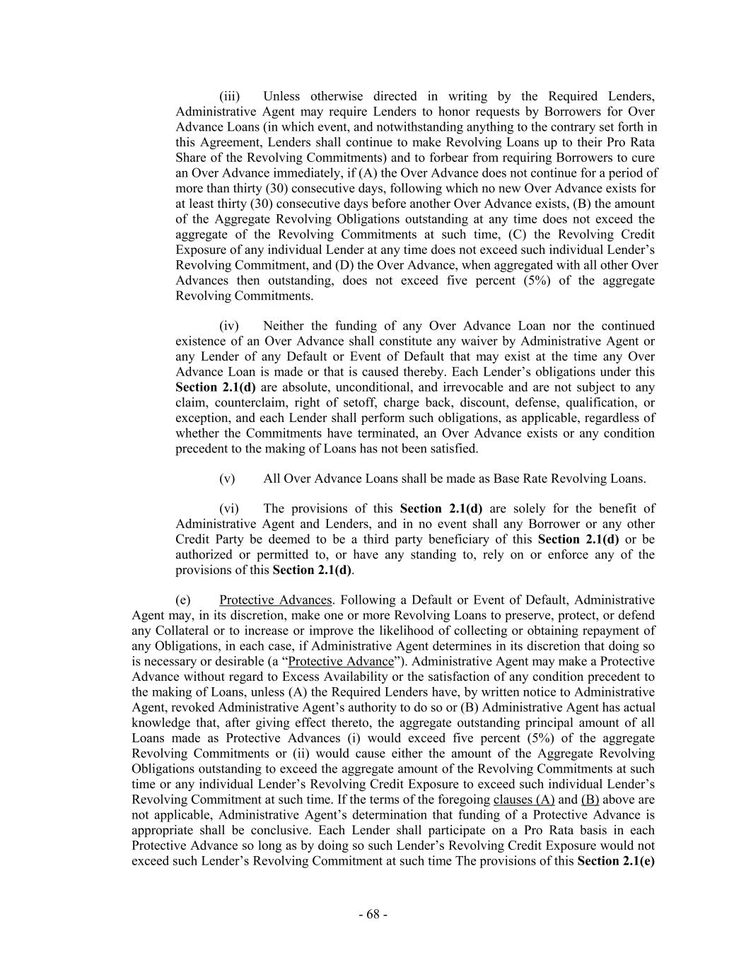 (iii) Unless otherwise directed in writing by the Required Lenders, Administrative Agent may require Lenders to honor requests by Borrowers for Over Advance Loans (in which event, and notwithstanding anything to the contrary set forth in this Agreement, Lenders shall continue to make Revolving Loans up to their Pro Rata Share of the Revolving Commitments) and to forbear from requiring Borrowers to cure an Over Advance immediately, if (A) the Over Advance does not continue for a period of more than thirty (30) consecutive days, following which no new Over Advance exists for at least thirty (30) consecutive days before another Over Advance exists, (B) the amount of the Aggregate Revolving Obligations outstanding at any time does not exceed the aggregate of the Revolving Commitments at such time, (C) the Revolving Credit Exposure of any individual Lender at any time does not exceed such individual Lender’s Revolving Commitment, and (D) the Over Advance, when aggregated with all other Over Advances then outstanding, does not exceed five percent (5%) of the aggregate Revolving Commitments. (iv) Neither the funding of any Over Advance Loan nor the continued existence of an Over Advance shall constitute any waiver by Administrative Agent or any Lender of any Default or Event of Default that may exist at the time any Over Advance Loan is made or that is caused thereby. Each Lender’s obligations under this Section 2.1(d) are absolute, unconditional, and irrevocable and are not subject to any claim, counterclaim, right of setoff, charge back, discount, defense, qualification, or exception, and each Lender shall perform such obligations, as applicable, regardless of whether the Commitments have terminated, an Over Advance exists or any condition precedent to the making of Loans has not been satisfied. (v) All Over Advance Loans shall be made as Base Rate Revolving Loans. (vi) The provisions of this Section 2.1(d) are solely for the benefit of Administrative Agent and Lenders, and in no event shall any Borrower or any other Credit Party be deemed to be a third party beneficiary of this Section 2.1(d) or be authorized or permitted to, or have any standing to, rely on or enforce any of the provisions of this Section 2.1(d). (e) Protective Advances. Following a Default or Event of Default, Administrative Agent may, in its discretion, make one or more Revolving Loans to preserve, protect, or defend any Collateral or to increase or improve the likelihood of collecting or obtaining repayment of any Obligations, in each case, if Administrative Agent determines in its discretion that doing so is necessary or desirable (a “Protective Advance”). Administrative Agent may make a Protective Advance without regard to Excess Availability or the satisfaction of any condition precedent to the making of Loans, unless (A) the Required Lenders have, by written notice to Administrative Agent, revoked Administrative Agent’s authority to do so or (B) Administrative Agent has actual knowledge that, after giving effect thereto, the aggregate outstanding principal amount of all Loans made as Protective Advances (i) would exceed five percent (5%) of the aggregate Revolving Commitments or (ii) would cause either the amount of the Aggregate Revolving Obligations outstanding to exceed the aggregate amount of the Revolving Commitments at such time or any individual Lender’s Revolving Credit Exposure to exceed such individual Lender’s Revolving Commitment at such time. If the terms of the foregoing clauses (A) and (B) above are not applicable, Administrative Agent’s determination that funding of a Protective Advance is appropriate shall be conclusive. Each Lender shall participate on a Pro Rata basis in each Protective Advance so long as by doing so such Lender’s Revolving Credit Exposure would not exceed such Lender’s Revolving Commitment at such time The provisions of this Section 2.1(e) - 68 -