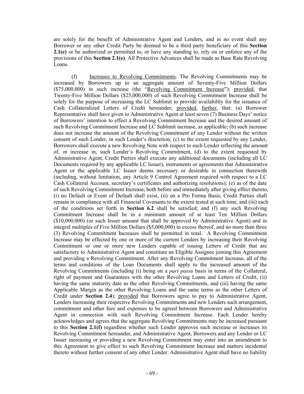 are solely for the benefit of Administrative Agent and Lenders, and in no event shall any Borrower or any other Credit Party be deemed to be a third party beneficiary of this Section 2.1(e) or be authorized or permitted to, or have any standing to, rely on or enforce any of the provisions of this Section 2.1(e). All Protective Advances shall be made as Base Rate Revolving Loans. (f) Increases to Revolving Commitments. The Revolving Commitments may be increased by Borrowers up to an aggregate amount of Seventy-Five Million Dollars ($75,000,000) in such increase (the “Revolving Commitment Increase”); provided, that Twenty-Five Million Dollars ($25,000,000) of such Revolving Commitment Increase shall be solely for the purpose of increasing the LC Sublimit to provide availability for the issuance of Cash Collateralized Letters of Credit hereunder; provided, further, that: (a) Borrower Representative shall have given to Administrative Agent at least seven (7) Business Days’ notice of Borrowers’ intention to effect a Revolving Commitment Increase and the desired amount of such Revolving Commitment Increase and LC Sublimit increase, as applicable; (b) such increase does not increase the amount of the Revolving Commitment of any Lender without the written consent of such Lender, in such Lender’s discretion; (c) to the extent requested by any Lender, Borrowers shall execute a new Revolving Note with respect to such Lender reflecting the amount of, or increase in, such Lender’s Revolving Commitment, (d) to the extent requested by Administrative Agent, Credit Parties shall execute any additional documents (including all LC Documents required by any applicable LC Issuer), instruments or agreements that Administrative Agent or the applicable LC Issuer deems necessary or desirable in connection therewith (including, without limitation, any Article 9 Control Agreement required with respect to a LC Cash Collateral Account, secretary’s certificates and authorizing resolutions); (e) as of the date of such Revolving Commitment Increase, both before and immediately after giving effect thereto, (i) no Default or Event of Default shall exist, (ii) on a Pro Forma Basis, Credit Parties shall remain in compliance with all Financial Covenants to the extent tested at such time, and (iii) each of the conditions set forth in Section 6.2 shall be satisfied; and (f) any such Revolving Commitment Increase shall be in a minimum amount of at least Ten Million Dollars ($10,000,000) (or such lesser amount that shall be approved by Administrative Agent) and in integral multiples of Five Million Dollars ($5,000,000) in excess thereof, and no more than three (3) Revolving Commitment Increases shall be permitted in total. A Revolving Commitment Increase may be effected by one or more of the current Lenders by increasing their Revolving Commitment or one or more new Lenders capable of issuing Letters of Credit that are satisfactory to Administrative Agent and constitute an Eligible Assignee joining this Agreement and providing a Revolving Commitment. After any Revolving Commitment Increase, all of the terms and conditions of the Loan Documents shall apply to the increased amount of the Revolving Commitments (including (i) being on a pari passu basis in terms of the Collateral, right of payment and Guarantees with the other Revolving Loans and Letters of Credit, (ii) having the same maturity date as the other Revolving Commitments, and (iii) having the same Applicable Margin as the other Revolving Loans and the same terms as the other Letters of Credit under Section 2.4); provided that Borrowers agree to pay to Administrative Agent, Lenders increasing their respective Revolving Commitments and new Lenders such arrangement, commitment and other fees and expenses to be agreed between Borrowers and Administrative Agent in connection with such Revolving Commitment Increase. Each Lender hereby acknowledges and agrees that the aggregate Revolving Commitments may be increased pursuant to this Section 2.1(f) regardless whether such Lender approves such increase or increases its Revolving Commitment hereunder, and Administrative Agent, Borrowers and any Lender or LC Issuer increasing or providing a new Revolving Commitment may enter into an amendment to this Agreement to give effect to such Revolving Commitment Increase and matters incidental thereto without further consent of any other Lender. Administrative Agent shall have no liability - 69 -