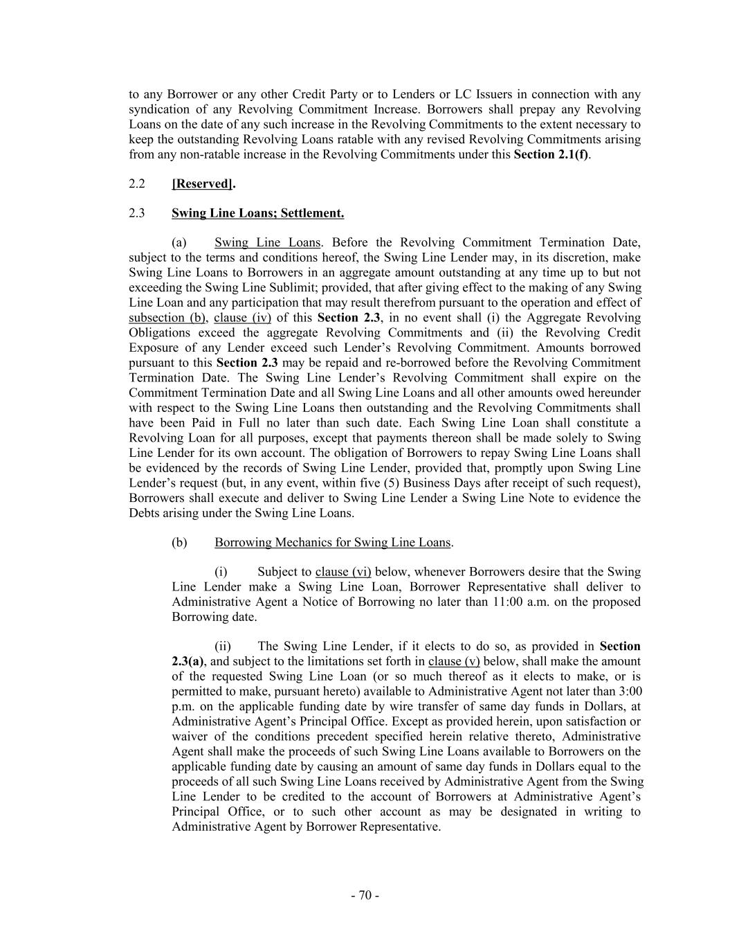 to any Borrower or any other Credit Party or to Lenders or LC Issuers in connection with any syndication of any Revolving Commitment Increase. Borrowers shall prepay any Revolving Loans on the date of any such increase in the Revolving Commitments to the extent necessary to keep the outstanding Revolving Loans ratable with any revised Revolving Commitments arising from any non-ratable increase in the Revolving Commitments under this Section 2.1(f). 2.2 [Reserved]. 2.3 Swing Line Loans; Settlement. (a) Swing Line Loans. Before the Revolving Commitment Termination Date, subject to the terms and conditions hereof, the Swing Line Lender may, in its discretion, make Swing Line Loans to Borrowers in an aggregate amount outstanding at any time up to but not exceeding the Swing Line Sublimit; provided, that after giving effect to the making of any Swing Line Loan and any participation that may result therefrom pursuant to the operation and effect of subsection (b), clause (iv) of this Section 2.3, in no event shall (i) the Aggregate Revolving Obligations exceed the aggregate Revolving Commitments and (ii) the Revolving Credit Exposure of any Lender exceed such Lender’s Revolving Commitment. Amounts borrowed pursuant to this Section 2.3 may be repaid and re-borrowed before the Revolving Commitment Termination Date. The Swing Line Lender’s Revolving Commitment shall expire on the Commitment Termination Date and all Swing Line Loans and all other amounts owed hereunder with respect to the Swing Line Loans then outstanding and the Revolving Commitments shall have been Paid in Full no later than such date. Each Swing Line Loan shall constitute a Revolving Loan for all purposes, except that payments thereon shall be made solely to Swing Line Lender for its own account. The obligation of Borrowers to repay Swing Line Loans shall be evidenced by the records of Swing Line Lender, provided that, promptly upon Swing Line Lender’s request (but, in any event, within five (5) Business Days after receipt of such request), Borrowers shall execute and deliver to Swing Line Lender a Swing Line Note to evidence the Debts arising under the Swing Line Loans. (b) Borrowing Mechanics for Swing Line Loans. (i) Subject to clause (vi) below, whenever Borrowers desire that the Swing Line Lender make a Swing Line Loan, Borrower Representative shall deliver to Administrative Agent a Notice of Borrowing no later than 11:00 a.m. on the proposed Borrowing date. (ii) The Swing Line Lender, if it elects to do so, as provided in Section 2.3(a), and subject to the limitations set forth in clause (v) below, shall make the amount of the requested Swing Line Loan (or so much thereof as it elects to make, or is permitted to make, pursuant hereto) available to Administrative Agent not later than 3:00 p.m. on the applicable funding date by wire transfer of same day funds in Dollars, at Administrative Agent’s Principal Office. Except as provided herein, upon satisfaction or waiver of the conditions precedent specified herein relative thereto, Administrative Agent shall make the proceeds of such Swing Line Loans available to Borrowers on the applicable funding date by causing an amount of same day funds in Dollars equal to the proceeds of all such Swing Line Loans received by Administrative Agent from the Swing Line Lender to be credited to the account of Borrowers at Administrative Agent’s Principal Office, or to such other account as may be designated in writing to Administrative Agent by Borrower Representative. - 70 -