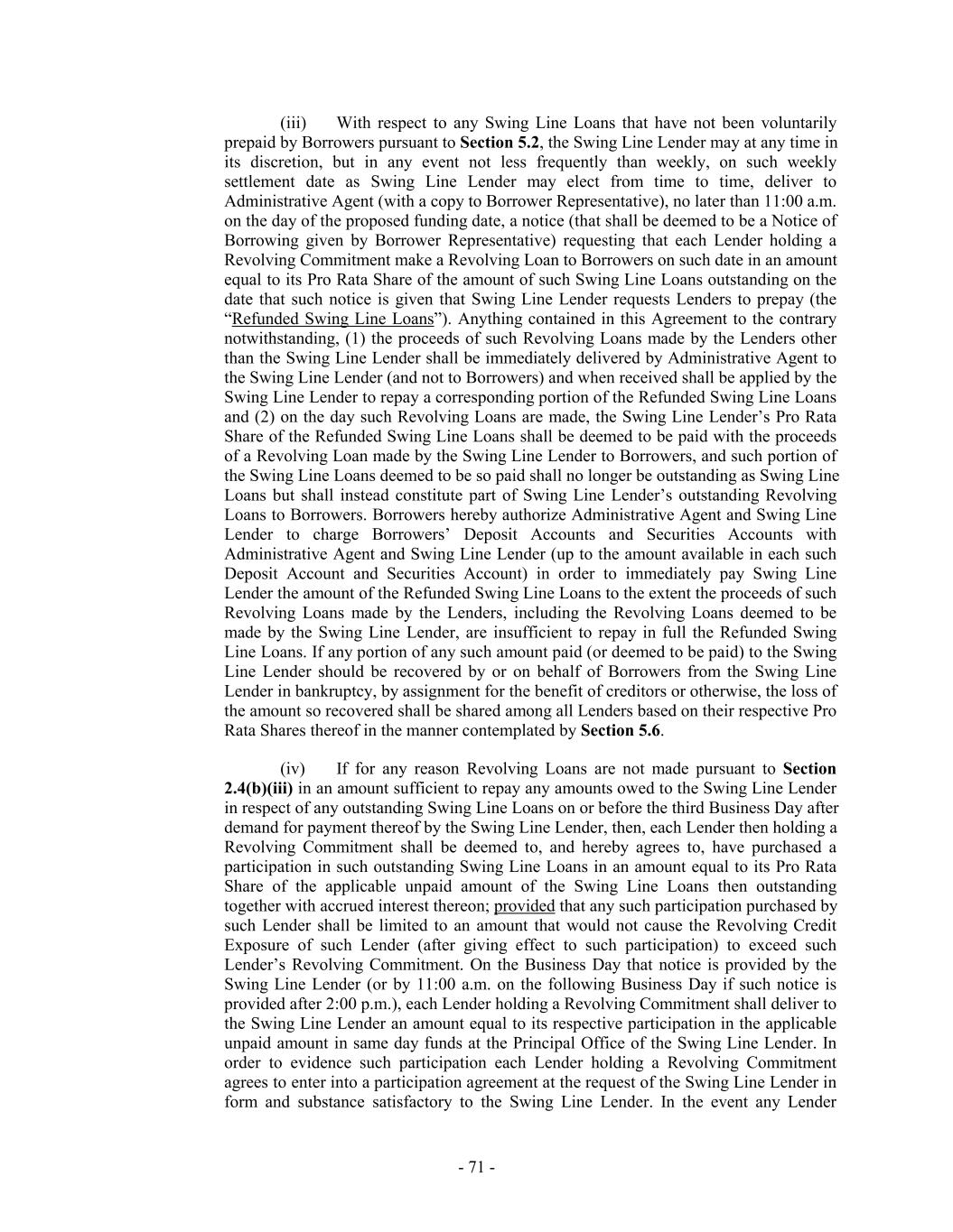 (iii) With respect to any Swing Line Loans that have not been voluntarily prepaid by Borrowers pursuant to Section 5.2, the Swing Line Lender may at any time in its discretion, but in any event not less frequently than weekly, on such weekly settlement date as Swing Line Lender may elect from time to time, deliver to Administrative Agent (with a copy to Borrower Representative), no later than 11:00 a.m. on the day of the proposed funding date, a notice (that shall be deemed to be a Notice of Borrowing given by Borrower Representative) requesting that each Lender holding a Revolving Commitment make a Revolving Loan to Borrowers on such date in an amount equal to its Pro Rata Share of the amount of such Swing Line Loans outstanding on the date that such notice is given that Swing Line Lender requests Lenders to prepay (the “Refunded Swing Line Loans”). Anything contained in this Agreement to the contrary notwithstanding, (1) the proceeds of such Revolving Loans made by the Lenders other than the Swing Line Lender shall be immediately delivered by Administrative Agent to the Swing Line Lender (and not to Borrowers) and when received shall be applied by the Swing Line Lender to repay a corresponding portion of the Refunded Swing Line Loans and (2) on the day such Revolving Loans are made, the Swing Line Lender’s Pro Rata Share of the Refunded Swing Line Loans shall be deemed to be paid with the proceeds of a Revolving Loan made by the Swing Line Lender to Borrowers, and such portion of the Swing Line Loans deemed to be so paid shall no longer be outstanding as Swing Line Loans but shall instead constitute part of Swing Line Lender’s outstanding Revolving Loans to Borrowers. Borrowers hereby authorize Administrative Agent and Swing Line Lender to charge Borrowers’ Deposit Accounts and Securities Accounts with Administrative Agent and Swing Line Lender (up to the amount available in each such Deposit Account and Securities Account) in order to immediately pay Swing Line Lender the amount of the Refunded Swing Line Loans to the extent the proceeds of such Revolving Loans made by the Lenders, including the Revolving Loans deemed to be made by the Swing Line Lender, are insufficient to repay in full the Refunded Swing Line Loans. If any portion of any such amount paid (or deemed to be paid) to the Swing Line Lender should be recovered by or on behalf of Borrowers from the Swing Line Lender in bankruptcy, by assignment for the benefit of creditors or otherwise, the loss of the amount so recovered shall be shared among all Lenders based on their respective Pro Rata Shares thereof in the manner contemplated by Section 5.6. (iv) If for any reason Revolving Loans are not made pursuant to Section 2.4(b)(iii) in an amount sufficient to repay any amounts owed to the Swing Line Lender in respect of any outstanding Swing Line Loans on or before the third Business Day after demand for payment thereof by the Swing Line Lender, then, each Lender then holding a Revolving Commitment shall be deemed to, and hereby agrees to, have purchased a participation in such outstanding Swing Line Loans in an amount equal to its Pro Rata Share of the applicable unpaid amount of the Swing Line Loans then outstanding together with accrued interest thereon; provided that any such participation purchased by such Lender shall be limited to an amount that would not cause the Revolving Credit Exposure of such Lender (after giving effect to such participation) to exceed such Lender’s Revolving Commitment. On the Business Day that notice is provided by the Swing Line Lender (or by 11:00 a.m. on the following Business Day if such notice is provided after 2:00 p.m.), each Lender holding a Revolving Commitment shall deliver to the Swing Line Lender an amount equal to its respective participation in the applicable unpaid amount in same day funds at the Principal Office of the Swing Line Lender. In order to evidence such participation each Lender holding a Revolving Commitment agrees to enter into a participation agreement at the request of the Swing Line Lender in form and substance satisfactory to the Swing Line Lender. In the event any Lender - 71 -