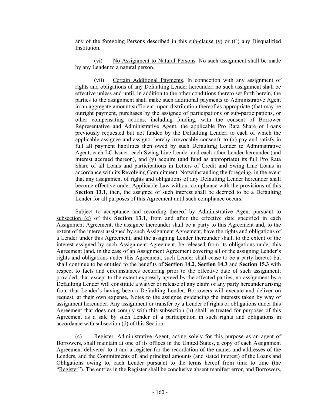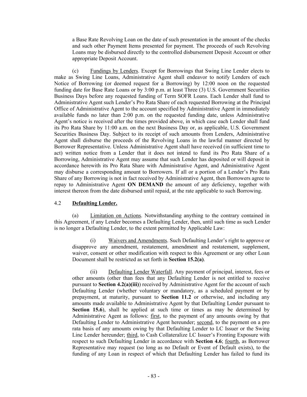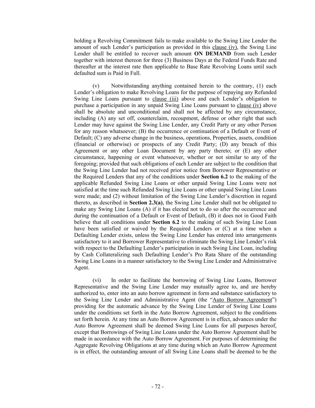 holding a Revolving Commitment fails to make available to the Swing Line Lender the amount of such Lender’s participation as provided in this clause (iv), the Swing Line Lender shall be entitled to recover such amount ON DEMAND from such Lender together with interest thereon for three (3) Business Days at the Federal Funds Rate and thereafter at the interest rate then applicable to Base Rate Revolving Loans until such defaulted sum is Paid in Full. (v) Notwithstanding anything contained herein to the contrary, (1) each Lender’s obligation to make Revolving Loans for the purpose of repaying any Refunded Swing Line Loans pursuant to clause (iii) above and each Lender’s obligation to purchase a participation in any unpaid Swing Line Loans pursuant to clause (iv) above shall be absolute and unconditional and shall not be affected by any circumstance, including (A) any set off, counterclaim, recoupment, defense or other right that such Lender may have against the Swing Line Lender, any Credit Party or any other Person for any reason whatsoever; (B) the occurrence or continuation of a Default or Event of Default; (C) any adverse change in the business, operations, Properties, assets, condition (financial or otherwise) or prospects of any Credit Party; (D) any breach of this Agreement or any other Loan Document by any party thereto; or (E) any other circumstance, happening or event whatsoever, whether or not similar to any of the foregoing; provided that such obligations of each Lender are subject to the condition that the Swing Line Lender had not received prior notice from Borrower Representative or the Required Lenders that any of the conditions under Section 6.2 to the making of the applicable Refunded Swing Line Loans or other unpaid Swing Line Loans were not satisfied at the time such Refunded Swing Line Loans or other unpaid Swing Line Loans were made; and (2) without limitation of the Swing Line Lender’s discretion in regard thereto, as described in Section 2.3(a), the Swing Line Lender shall not be obligated to make any Swing Line Loans (A) if it has elected not to do so after the occurrence and during the continuation of a Default or Event of Default, (B) it does not in Good Faith believe that all conditions under Section 6.2 to the making of such Swing Line Loan have been satisfied or waived by the Required Lenders or (C) at a time when a Defaulting Lender exists, unless the Swing Line Lender has entered into arrangements satisfactory to it and Borrower Representative to eliminate the Swing Line Lender’s risk with respect to the Defaulting Lender’s participation in such Swing Line Loan, including by Cash Collateralizing such Defaulting Lender’s Pro Rata Share of the outstanding Swing Line Loans in a manner satisfactory to the Swing Line Lender and Administrative Agent. (vi) In order to facilitate the borrowing of Swing Line Loans, Borrower Representative and the Swing Line Lender may mutually agree to, and are hereby authorized to, enter into an auto borrow agreement in form and substance satisfactory to the Swing Line Lender and Administrative Agent (the “Auto Borrow Agreement”) providing for the automatic advance by the Swing Line Lender of Swing Line Loans under the conditions set forth in the Auto Borrow Agreement, subject to the conditions set forth herein. At any time an Auto Borrow Agreement is in effect, advances under the Auto Borrow Agreement shall be deemed Swing Line Loans for all purposes hereof, except that Borrowings of Swing Line Loans under the Auto Borrow Agreement shall be made in accordance with the Auto Borrow Agreement. For purposes of determining the Aggregate Revolving Obligations at any time during which an Auto Borrow Agreement is in effect, the outstanding amount of all Swing Line Loans shall be deemed to be the - 72 -