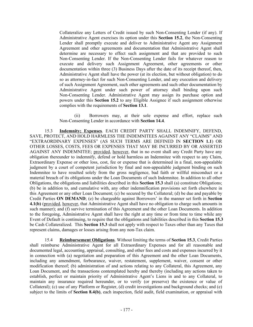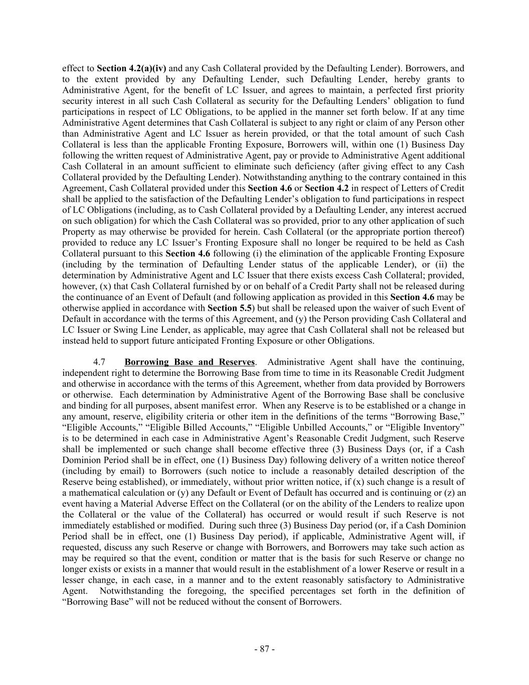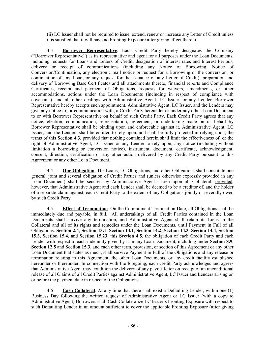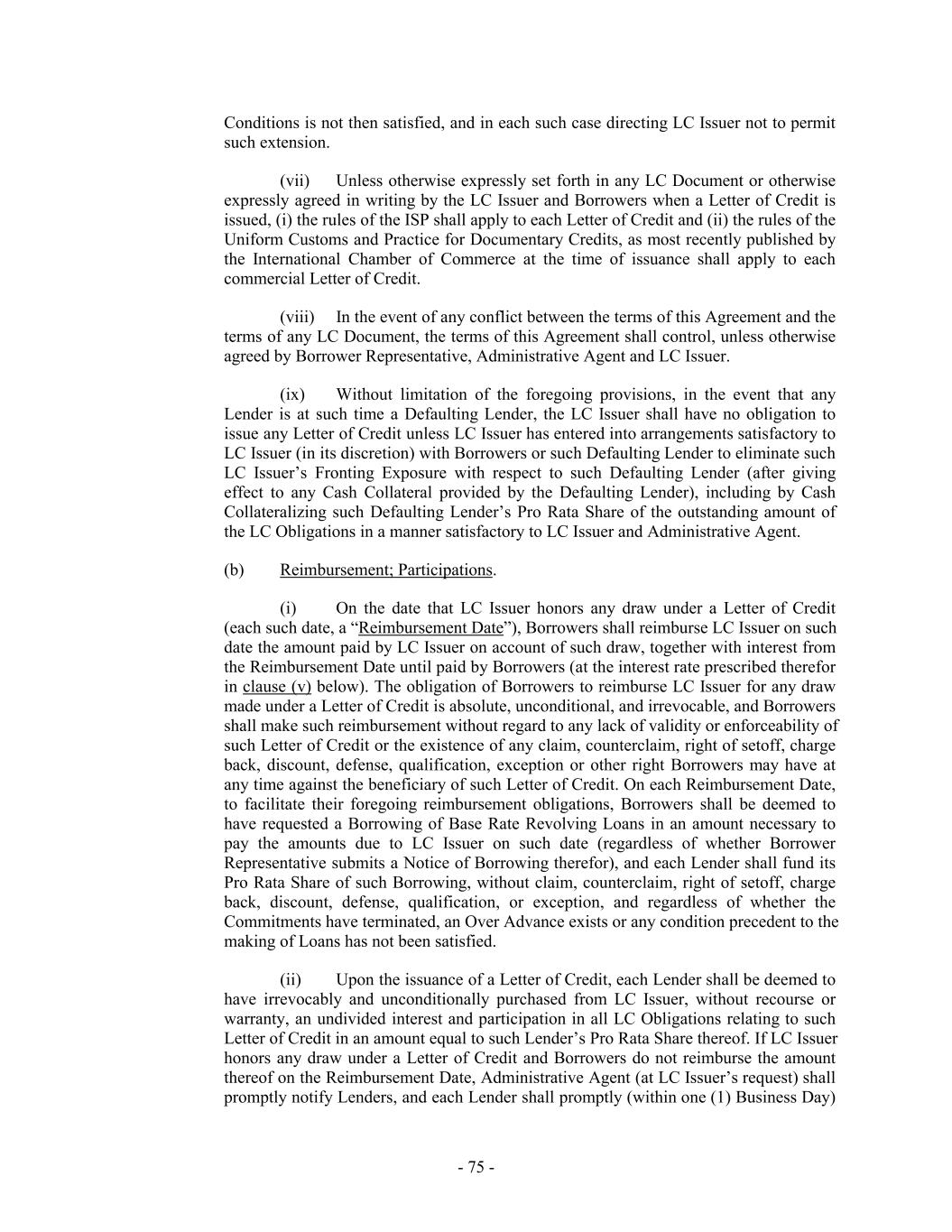 Conditions is not then satisfied, and in each such case directing LC Issuer not to permit such extension. (vii) Unless otherwise expressly set forth in any LC Document or otherwise expressly agreed in writing by the LC Issuer and Borrowers when a Letter of Credit is issued, (i) the rules of the ISP shall apply to each Letter of Credit and (ii) the rules of the Uniform Customs and Practice for Documentary Credits, as most recently published by the International Chamber of Commerce at the time of issuance shall apply to each commercial Letter of Credit. (viii) In the event of any conflict between the terms of this Agreement and the terms of any LC Document, the terms of this Agreement shall control, unless otherwise agreed by Borrower Representative, Administrative Agent and LC Issuer. (ix) Without limitation of the foregoing provisions, in the event that any Lender is at such time a Defaulting Lender, the LC Issuer shall have no obligation to issue any Letter of Credit unless LC Issuer has entered into arrangements satisfactory to LC Issuer (in its discretion) with Borrowers or such Defaulting Lender to eliminate such LC Issuer’s Fronting Exposure with respect to such Defaulting Lender (after giving effect to any Cash Collateral provided by the Defaulting Lender), including by Cash Collateralizing such Defaulting Lender’s Pro Rata Share of the outstanding amount of the LC Obligations in a manner satisfactory to LC Issuer and Administrative Agent. (b) Reimbursement; Participations. (i) On the date that LC Issuer honors any draw under a Letter of Credit (each such date, a “Reimbursement Date”), Borrowers shall reimburse LC Issuer on such date the amount paid by LC Issuer on account of such draw, together with interest from the Reimbursement Date until paid by Borrowers (at the interest rate prescribed therefor in clause (v) below). The obligation of Borrowers to reimburse LC Issuer for any draw made under a Letter of Credit is absolute, unconditional, and irrevocable, and Borrowers shall make such reimbursement without regard to any lack of validity or enforceability of such Letter of Credit or the existence of any claim, counterclaim, right of setoff, charge back, discount, defense, qualification, exception or other right Borrowers may have at any time against the beneficiary of such Letter of Credit. On each Reimbursement Date, to facilitate their foregoing reimbursement obligations, Borrowers shall be deemed to have requested a Borrowing of Base Rate Revolving Loans in an amount necessary to pay the amounts due to LC Issuer on such date (regardless of whether Borrower Representative submits a Notice of Borrowing therefor), and each Lender shall fund its Pro Rata Share of such Borrowing, without claim, counterclaim, right of setoff, charge back, discount, defense, qualification, or exception, and regardless of whether the Commitments have terminated, an Over Advance exists or any condition precedent to the making of Loans has not been satisfied. (ii) Upon the issuance of a Letter of Credit, each Lender shall be deemed to have irrevocably and unconditionally purchased from LC Issuer, without recourse or warranty, an undivided interest and participation in all LC Obligations relating to such Letter of Credit in an amount equal to such Lender’s Pro Rata Share thereof. If LC Issuer honors any draw under a Letter of Credit and Borrowers do not reimburse the amount thereof on the Reimbursement Date, Administrative Agent (at LC Issuer’s request) shall promptly notify Lenders, and each Lender shall promptly (within one (1) Business Day) - 75 -