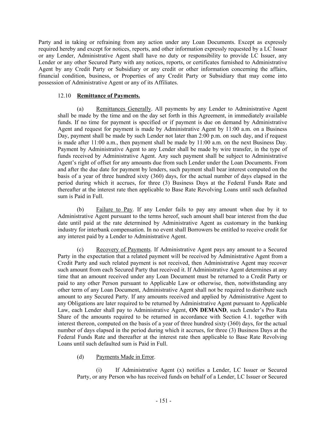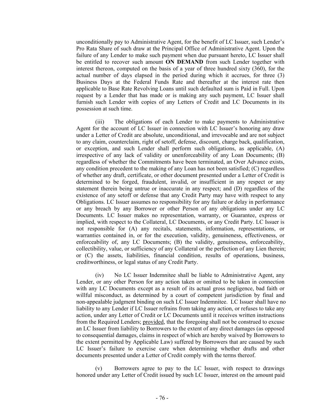 unconditionally pay to Administrative Agent, for the benefit of LC Issuer, such Lender’s Pro Rata Share of such draw at the Principal Office of Administrative Agent. Upon the failure of any Lender to make such payment when due pursuant hereto, LC Issuer shall be entitled to recover such amount ON DEMAND from such Lender together with interest thereon, computed on the basis of a year of three hundred sixty (360), for the actual number of days elapsed in the period during which it accrues, for three (3) Business Days at the Federal Funds Rate and thereafter at the interest rate then applicable to Base Rate Revolving Loans until such defaulted sum is Paid in Full. Upon request by a Lender that has made or is making any such payment, LC Issuer shall furnish such Lender with copies of any Letters of Credit and LC Documents in its possession at such time. (iii) The obligations of each Lender to make payments to Administrative Agent for the account of LC Issuer in connection with LC Issuer’s honoring any draw under a Letter of Credit are absolute, unconditional, and irrevocable and are not subject to any claim, counterclaim, right of setoff, defense, discount, charge back, qualification, or exception, and such Lender shall perform such obligations, as applicable, (A) irrespective of any lack of validity or unenforceability of any Loan Documents; (B) regardless of whether the Commitments have been terminated, an Over Advance exists, any condition precedent to the making of any Loan has not been satisfied; (C) regardless of whether any draft, certificate, or other document presented under a Letter of Credit is determined to be forged, fraudulent, invalid, or insufficient in any respect or any statement therein being untrue or inaccurate in any respect; and (D) regardless of the existence of any setoff or defense that any Credit Party may have with respect to any Obligations. LC Issuer assumes no responsibility for any failure or delay in performance or any breach by any Borrower or other Person of any obligations under any LC Documents. LC Issuer makes no representation, warranty, or Guarantee, express or implied, with respect to the Collateral, LC Documents, or any Credit Party. LC Issuer is not responsible for (A) any recitals, statements, information, representations, or warranties contained in, or for the execution, validity, genuineness, effectiveness, or enforceability of, any LC Documents; (B) the validity, genuineness, enforceability, collectibility, value, or sufficiency of any Collateral or the perfection of any Lien therein; or (C) the assets, liabilities, financial condition, results of operations, business, creditworthiness, or legal status of any Credit Party. (iv) No LC Issuer Indemnitee shall be liable to Administrative Agent, any Lender, or any other Person for any action taken or omitted to be taken in connection with any LC Documents except as a result of its actual gross negligence, bad faith or willful misconduct, as determined by a court of competent jurisdiction by final and non-appealable judgment binding on such LC Issuer Indemnitee. LC Issuer shall have no liability to any Lender if LC Issuer refrains from taking any action, or refuses to take any action, under any Letter of Credit or LC Documents until it receives written instructions from the Required Lenders; provided, that the foregoing shall not be construed to excuse an LC Issuer from liability to Borrowers to the extent of any direct damages (as opposed to consequential damages, claims in respect of which are hereby waived by Borrowers to the extent permitted by Applicable Law) suffered by Borrowers that are caused by such LC Issuer’s failure to exercise care when determining whether drafts and other documents presented under a Letter of Credit comply with the terms thereof. (v) Borrowers agree to pay to the LC Issuer, with respect to drawings honored under any Letter of Credit issued by such LC Issuer, interest on the amount paid - 76 -