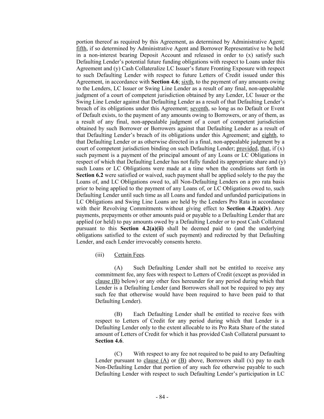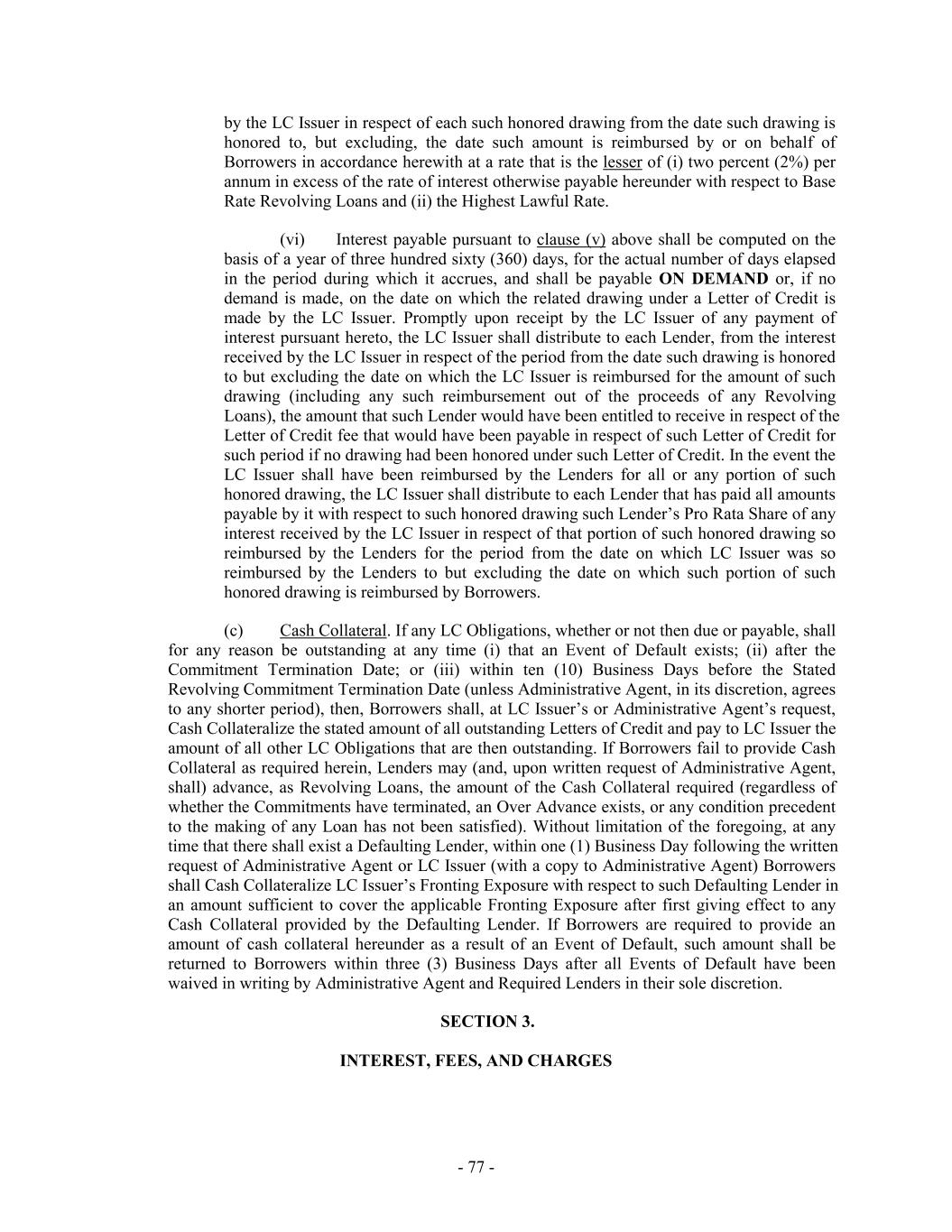 by the LC Issuer in respect of each such honored drawing from the date such drawing is honored to, but excluding, the date such amount is reimbursed by or on behalf of Borrowers in accordance herewith at a rate that is the lesser of (i) two percent (2%) per annum in excess of the rate of interest otherwise payable hereunder with respect to Base Rate Revolving Loans and (ii) the Highest Lawful Rate. (vi) Interest payable pursuant to clause (v) above shall be computed on the basis of a year of three hundred sixty (360) days, for the actual number of days elapsed in the period during which it accrues, and shall be payable ON DEMAND or, if no demand is made, on the date on which the related drawing under a Letter of Credit is made by the LC Issuer. Promptly upon receipt by the LC Issuer of any payment of interest pursuant hereto, the LC Issuer shall distribute to each Lender, from the interest received by the LC Issuer in respect of the period from the date such drawing is honored to but excluding the date on which the LC Issuer is reimbursed for the amount of such drawing (including any such reimbursement out of the proceeds of any Revolving Loans), the amount that such Lender would have been entitled to receive in respect of the Letter of Credit fee that would have been payable in respect of such Letter of Credit for such period if no drawing had been honored under such Letter of Credit. In the event the LC Issuer shall have been reimbursed by the Lenders for all or any portion of such honored drawing, the LC Issuer shall distribute to each Lender that has paid all amounts payable by it with respect to such honored drawing such Lender’s Pro Rata Share of any interest received by the LC Issuer in respect of that portion of such honored drawing so reimbursed by the Lenders for the period from the date on which LC Issuer was so reimbursed by the Lenders to but excluding the date on which such portion of such honored drawing is reimbursed by Borrowers. (c) Cash Collateral. If any LC Obligations, whether or not then due or payable, shall for any reason be outstanding at any time (i) that an Event of Default exists; (ii) after the Commitment Termination Date; or (iii) within ten (10) Business Days before the Stated Revolving Commitment Termination Date (unless Administrative Agent, in its discretion, agrees to any shorter period), then, Borrowers shall, at LC Issuer’s or Administrative Agent’s request, Cash Collateralize the stated amount of all outstanding Letters of Credit and pay to LC Issuer the amount of all other LC Obligations that are then outstanding. If Borrowers fail to provide Cash Collateral as required herein, Lenders may (and, upon written request of Administrative Agent, shall) advance, as Revolving Loans, the amount of the Cash Collateral required (regardless of whether the Commitments have terminated, an Over Advance exists, or any condition precedent to the making of any Loan has not been satisfied). Without limitation of the foregoing, at any time that there shall exist a Defaulting Lender, within one (1) Business Day following the written request of Administrative Agent or LC Issuer (with a copy to Administrative Agent) Borrowers shall Cash Collateralize LC Issuer’s Fronting Exposure with respect to such Defaulting Lender in an amount sufficient to cover the applicable Fronting Exposure after first giving effect to any Cash Collateral provided by the Defaulting Lender. If Borrowers are required to provide an amount of cash collateral hereunder as a result of an Event of Default, such amount shall be returned to Borrowers within three (3) Business Days after all Events of Default have been waived in writing by Administrative Agent and Required Lenders in their sole discretion. SECTION 3. INTEREST, FEES, AND CHARGES - 77 -