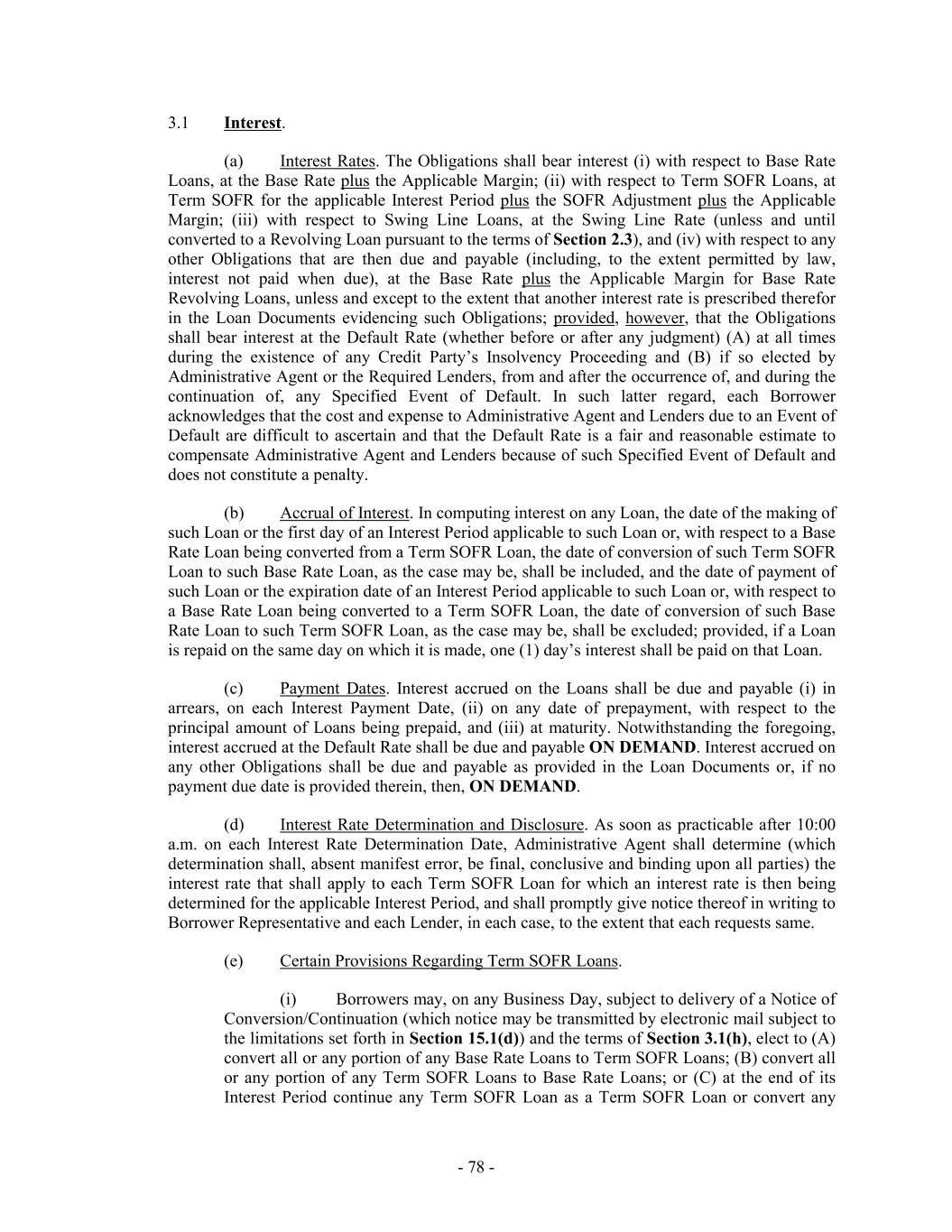 3.1 Interest. (a) Interest Rates. The Obligations shall bear interest (i) with respect to Base Rate Loans, at the Base Rate plus the Applicable Margin; (ii) with respect to Term SOFR Loans, at Term SOFR for the applicable Interest Period plus the SOFR Adjustment plus the Applicable Margin; (iii) with respect to Swing Line Loans, at the Swing Line Rate (unless and until converted to a Revolving Loan pursuant to the terms of Section 2.3), and (iv) with respect to any other Obligations that are then due and payable (including, to the extent permitted by law, interest not paid when due), at the Base Rate plus the Applicable Margin for Base Rate Revolving Loans, unless and except to the extent that another interest rate is prescribed therefor in the Loan Documents evidencing such Obligations; provided, however, that the Obligations shall bear interest at the Default Rate (whether before or after any judgment) (A) at all times during the existence of any Credit Party’s Insolvency Proceeding and (B) if so elected by Administrative Agent or the Required Lenders, from and after the occurrence of, and during the continuation of, any Specified Event of Default. In such latter regard, each Borrower acknowledges that the cost and expense to Administrative Agent and Lenders due to an Event of Default are difficult to ascertain and that the Default Rate is a fair and reasonable estimate to compensate Administrative Agent and Lenders because of such Specified Event of Default and does not constitute a penalty. (b) Accrual of Interest. In computing interest on any Loan, the date of the making of such Loan or the first day of an Interest Period applicable to such Loan or, with respect to a Base Rate Loan being converted from a Term SOFR Loan, the date of conversion of such Term SOFR Loan to such Base Rate Loan, as the case may be, shall be included, and the date of payment of such Loan or the expiration date of an Interest Period applicable to such Loan or, with respect to a Base Rate Loan being converted to a Term SOFR Loan, the date of conversion of such Base Rate Loan to such Term SOFR Loan, as the case may be, shall be excluded; provided, if a Loan is repaid on the same day on which it is made, one (1) day’s interest shall be paid on that Loan. (c) Payment Dates. Interest accrued on the Loans shall be due and payable (i) in arrears, on each Interest Payment Date, (ii) on any date of prepayment, with respect to the principal amount of Loans being prepaid, and (iii) at maturity. Notwithstanding the foregoing, interest accrued at the Default Rate shall be due and payable ON DEMAND. Interest accrued on any other Obligations shall be due and payable as provided in the Loan Documents or, if no payment due date is provided therein, then, ON DEMAND. (d) Interest Rate Determination and Disclosure. As soon as practicable after 10:00 a.m. on each Interest Rate Determination Date, Administrative Agent shall determine (which determination shall, absent manifest error, be final, conclusive and binding upon all parties) the interest rate that shall apply to each Term SOFR Loan for which an interest rate is then being determined for the applicable Interest Period, and shall promptly give notice thereof in writing to Borrower Representative and each Lender, in each case, to the extent that each requests same. (e) Certain Provisions Regarding Term SOFR Loans. (i) Borrowers may, on any Business Day, subject to delivery of a Notice of Conversion/Continuation (which notice may be transmitted by electronic mail subject to the limitations set forth in Section 15.1(d)) and the terms of Section 3.1(h), elect to (A) convert all or any portion of any Base Rate Loans to Term SOFR Loans; (B) convert all or any portion of any Term SOFR Loans to Base Rate Loans; or (C) at the end of its Interest Period continue any Term SOFR Loan as a Term SOFR Loan or convert any - 78 -
