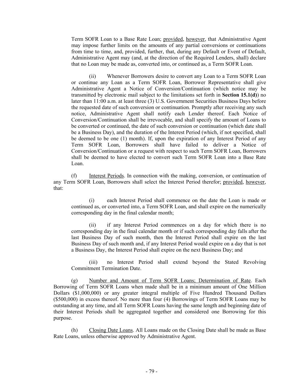 Term SOFR Loan to a Base Rate Loan; provided, however, that Administrative Agent may impose further limits on the amounts of any partial conversions or continuations from time to time, and, provided, further, that, during any Default or Event of Default, Administrative Agent may (and, at the direction of the Required Lenders, shall) declare that no Loan may be made as, converted into, or continued as, a Term SOFR Loan. (ii) Whenever Borrowers desire to convert any Loan to a Term SOFR Loan or continue any Loan as a Term SOFR Loan, Borrower Representative shall give Administrative Agent a Notice of Conversion/Continuation (which notice may be transmitted by electronic mail subject to the limitations set forth in Section 15.1(d)) no later than 11:00 a.m. at least three (3) U.S. Government Securities Business Days before the requested date of such conversion or continuation. Promptly after receiving any such notice, Administrative Agent shall notify each Lender thereof. Each Notice of Conversion/Continuation shall be irrevocable, and shall specify the amount of Loans to be converted or continued, the date of such conversion or continuation (which date shall be a Business Day), and the duration of the Interest Period (which, if not specified, shall be deemed to be one (1) month). If, upon the expiration of any Interest Period of any Term SOFR Loan, Borrowers shall have failed to deliver a Notice of Conversion/Continuation or a request with respect to such Term SOFR Loan, Borrowers shall be deemed to have elected to convert such Term SOFR Loan into a Base Rate Loan. (f) Interest Periods. In connection with the making, conversion, or continuation of any Term SOFR Loan, Borrowers shall select the Interest Period therefor; provided, however, that: (i) each Interest Period shall commence on the date the Loan is made or continued as, or converted into, a Term SOFR Loan, and shall expire on the numerically corresponding day in the final calendar month; (ii) if any Interest Period commences on a day for which there is no corresponding day in the final calendar month or if such corresponding day falls after the last Business Day of such month, then the Interest Period shall expire on the last Business Day of such month and, if any Interest Period would expire on a day that is not a Business Day, the Interest Period shall expire on the next Business Day; and (iii) no Interest Period shall extend beyond the Stated Revolving Commitment Termination Date. (g) Number and Amount of Term SOFR Loans; Determination of Rate. Each Borrowing of Term SOFR Loans when made shall be in a minimum amount of One Million Dollars ($1,000,000) or any greater integral multiple of Five Hundred Thousand Dollars ($500,000) in excess thereof. No more than four (4) Borrowings of Term SOFR Loans may be outstanding at any time, and all Term SOFR Loans having the same length and beginning date of their Interest Periods shall be aggregated together and considered one Borrowing for this purpose. (h) Closing Date Loans. All Loans made on the Closing Date shall be made as Base Rate Loans, unless otherwise approved by Administrative Agent. - 79 -