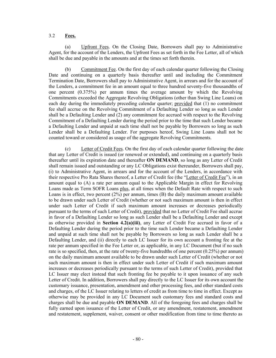 3.2 Fees. (a) Upfront Fees. On the Closing Date, Borrowers shall pay to Administrative Agent, for the account of the Lenders, the Upfront Fees as set forth in the Fee Letter, all of which shall be due and payable in the amounts and at the times set forth therein. (b) Commitment Fee. On the first day of each calendar quarter following the Closing Date and continuing on a quarterly basis thereafter until and including the Commitment Termination Date, Borrowers shall pay to Administrative Agent, in arrears and for the account of the Lenders, a commitment fee in an amount equal to three hundred seventy-five thousandths of one percent (0.375%) per annum times the average amount by which the Revolving Commitments exceeded the Aggregate Revolving Obligations (other than Swing Line Loans) on each day during the immediately preceding calendar quarter; provided that (1) no commitment fee shall accrue on the Revolving Commitment of a Defaulting Lender so long as such Lender shall be a Defaulting Lender and (2) any commitment fee accrued with respect to the Revolving Commitment of a Defaulting Lender during the period prior to the time that such Lender became a Defaulting Lender and unpaid at such time shall not be payable by Borrowers so long as such Lender shall be a Defaulting Lender. For purposes hereof, Swing Line Loans shall not be counted toward or considered as usage of the aggregate Revolving Commitments. (c) Letter of Credit Fees. On the first day of each calendar quarter following the date that any Letter of Credit is issued (or renewed or extended), and continuing on a quarterly basis thereafter until its expiration date and thereafter ON DEMAND, so long as any Letter of Credit shall remain issued and outstanding or any LC Obligations exist thereunder, Borrowers shall pay, (i) to Administrative Agent, in arrears and for the account of the Lenders, in accordance with their respective Pro Rata Shares thereof, a Letter of Credit fee (the “Letter of Credit Fee”), in an amount equal to (A) a rate per annum equal to the Applicable Margin in effect for Revolving Loans made as Term SOFR Loans plus, at all times when the Default Rate with respect to such Loans is in effect, two percent (2%) per annum, times (B) the daily maximum amount available to be drawn under such Letter of Credit (whether or not such maximum amount is then in effect under such Letter of Credit if such maximum amount increases or decreases periodically pursuant to the terms of such Letter of Credit), provided that no Letter of Credit Fee shall accrue in favor of a Defaulting Lender so long as such Lender shall be a Defaulting Lender and except as otherwise provided in Section 4.2(a)(iii), any Letter of Credit Fee accrued in favor of a Defaulting Lender during the period prior to the time such Lender became a Defaulting Lender and unpaid at such time shall not be payable by Borrowers so long as such Lender shall be a Defaulting Lender, and (ii) directly to each LC Issuer for its own account a fronting fee at the rate per annum specified in the Fee Letter or, as applicable, in any LC Document (but if no such rate is so specified, then, at the rate of twenty-five hundredths of one percent (0.25%) per annum) on the daily maximum amount available to be drawn under such Letter of Credit (whether or not such maximum amount is then in effect under such Letter of Credit if such maximum amount increases or decreases periodically pursuant to the terms of such Letter of Credit), provided that LC Issuer may elect instead that such fronting fee be payable to it upon issuance of any such Letter of Credit. In addition, Borrowers shall pay directly to the LC Issuer for its own account the customary issuance, presentation, amendment and other processing fees, and other standard costs and charges, of the LC Issuer relating to letters of credit as from time to time in effect. Except as otherwise may be provided in any LC Document such customary fees and standard costs and charges shall be due and payable ON DEMAND. All of the foregoing fees and charges shall be fully earned upon issuance of the Letter of Credit, or any amendment, restatement, amendment and restatement, supplement, waiver, consent or other modification from time to time thereto as - 80 -