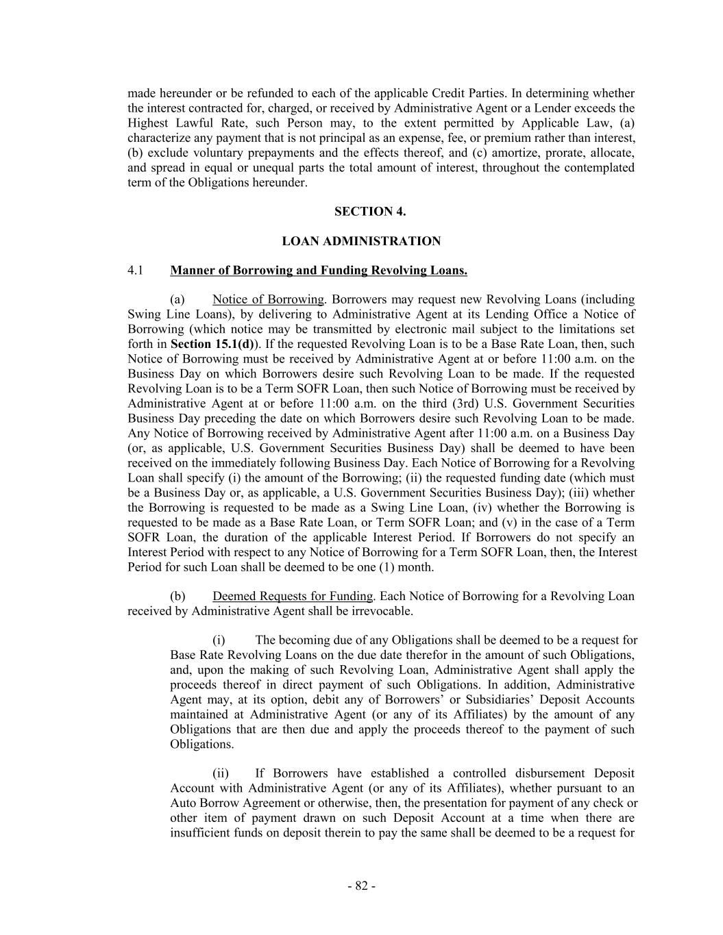 applicable, and none of such fees or charges shall be refundable, in whole or in part, regardless of any cancellation, termination, or drawing upon the Letter of Credit. (d) Administrative Agent Fees. Borrowers shall pay to Administrative Agent, for its own account, the fees payable to Administrative Agent that are described in the Fee Letter, all of which shall be due and payable in the amounts and at the times set forth therein. (e) Other Fees. Borrowers shall pay to each applicable Person the fees payable to such Person that are described in the Fee Letter, all of which shall be due and payable in the amounts and at the times set forth therein. (f) Calculation and Distribution of Interest Fees, Charges, and Other Amounts. Unless otherwise specifically provided herein or in any other Loan Document, interest, fees, charges and other amounts that are calculated on a per annum basis shall be calculated as follows: (i) for interest determined by reference to the Base Rate, a year of three hundred sixty (360) days, and (ii) for all other such computations of interest, fees, charges and other amounts, likewise, a year of three hundred sixty (360) days, in each case, for the actual number of days elapsed in the period during which it accrues. Each determination by Administrative Agent of any interest, fees, charges or interest rate hereunder or under any other Loan Document shall be final, conclusive, and binding for all purposes, absent manifest error. All fees payable under this Section 3.2 are compensation for services and, to the extent of Applicable Law, are not, and shall not be deemed to be, interest or any other charge for the use, forbearance, or detention of money. A certificate as to amounts payable by Borrowers under Section 14 and 15.4, timely submitted to Borrower Representative by Administrative Agent or the Affected Lender, as applicable, shall be final, conclusive, and binding for all purposes, absent manifest error, and Borrowers shall pay such amounts to the applicable Person within ten (10) days following receipt of such certificate. All fees shall be fully earned when due and shall not be subject to rebate, refund, or proration, in whole or in part. All fees paid to Administrative Agent for the account of the Lenders, LC Issuer, or any other Person shall be paid by Administrative Agent to such Persons promptly upon its receipt thereof and, with respect to fees payable for the account of the Lenders, in accordance with each such Lender’s Pro Rata Share thereof. (g) Maximum Interest. Notwithstanding any other provision herein, the aggregate interest rate charged or agreed to be paid with respect to any of the Obligations, including all charges or fees in connection therewith deemed in the nature of interest under Applicable Law shall not exceed the Highest Lawful Rate. If the rate of interest (determined without regard to the preceding sentence) under this Agreement at any time exceeds the Highest Lawful Rate, the aggregate outstanding amount of the Loans made hereunder shall bear interest at the Highest Lawful Rate until the total amount of interest due hereunder equals the amount of interest that would have been due hereunder if the stated rates of interest set forth in this Agreement had at all times been in effect. In addition, if when the Loans made hereunder are Paid in Full the total interest due hereunder (taking into account the increase provided for above) is less than the total amount of interest that would have been due hereunder if the stated rates of interest set forth in this Agreement had at all times been in effect, then to the extent permitted by law, Borrowers shall pay to Administrative Agent an amount equal to the difference between the amount of interest paid and the amount of interest that would have been paid if the Highest Lawful Rate had at all times been in effect. Notwithstanding the foregoing, it is the intention of the Lenders and each of the Credit Parties to conform strictly to any applicable usury laws. Accordingly, if any Lender contracts for, charges, or receives any consideration that constitutes interest in excess of the Highest Lawful Rate, then any such excess shall be cancelled automatically and, if previously paid, shall at such Lender’s option be applied to the aggregate outstanding amount of the Loans - 81 -