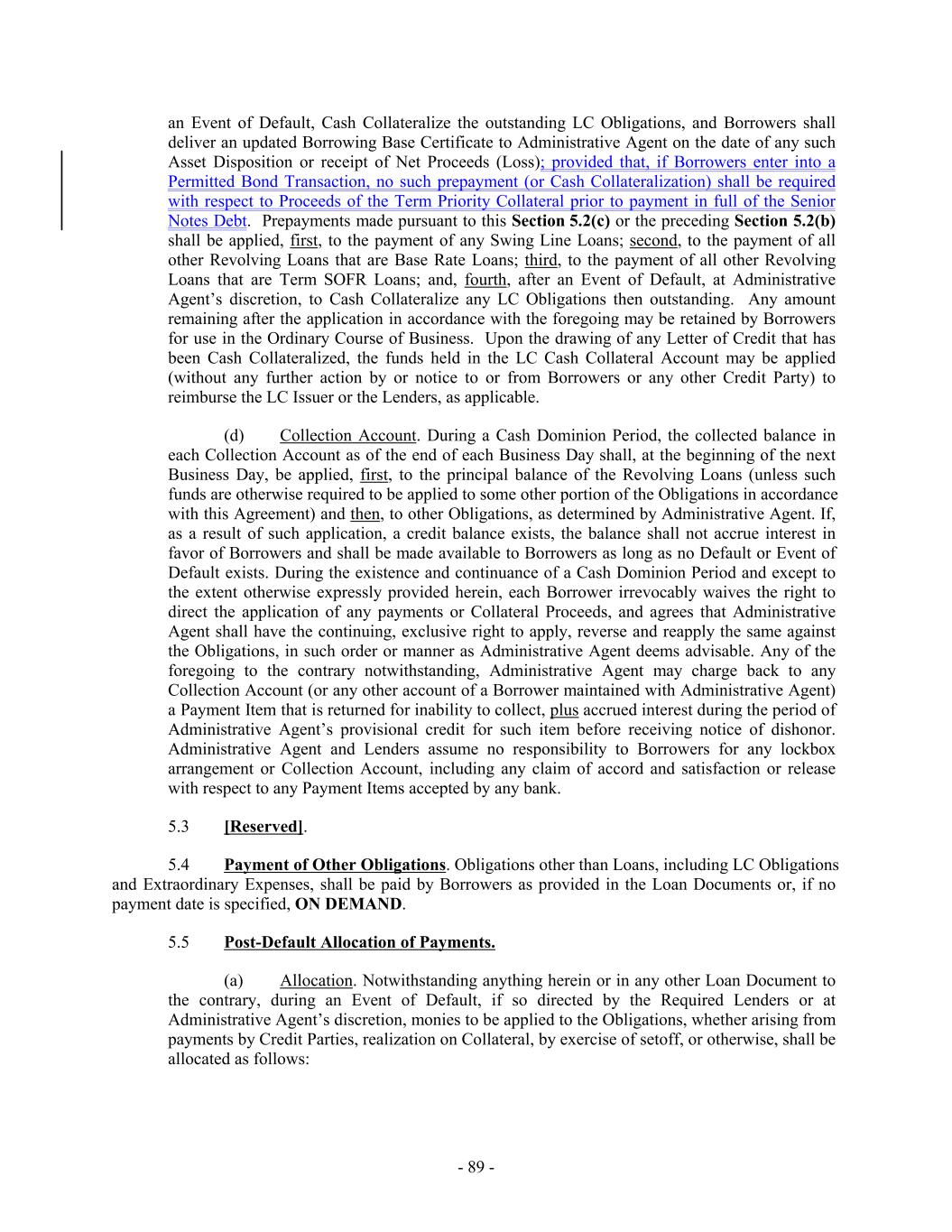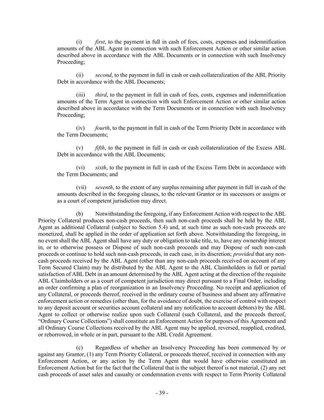 - 39 - (i) first, to the payment in full in cash of fees, costs, expenses and indemnification amounts of the ABL Agent in connection with such Enforcement Action or other similar action described above in accordance with the ABL Documents or in connection with such Insolvency Proceeding; (ii) second, to the payment in full in cash or cash collateralization of the ABL Priority Debt in accordance with the ABL Documents; (iii) third, to the payment in full in cash of fees, costs, expenses and indemnification amounts of the Term Agent in connection with such Enforcement Action or other similar action described above in accordance with the Term Documents or in connection with such Insolvency Proceeding; (iv) fourth, to the payment in full in cash of the Term Priority Debt in accordance with the Term Documents; (v) fifth, to the payment in full in cash or cash collateralization of the Excess ABL Debt in accordance with the ABL Documents; (vi) sixth, to the payment in full in cash of the Excess Term Debt in accordance with the Term Documents; and (vii) seventh, to the extent of any surplus remaining after payment in full in cash of the amounts described in the foregoing clauses, to the relevant Grantor or its successors or assigns or as a court of competent jurisdiction may direct. (b) Notwithstanding the foregoing, if any Enforcement Action with respect to the ABL Priority Collateral produces non-cash proceeds, then such non-cash proceeds shall be held by the ABL Agent as additional Collateral (subject to Section 5.4) and, at such time as such non-cash proceeds are monetized, shall be applied in the order of application set forth above. Notwithstanding the foregoing, in no event shall the ABL Agent shall have any duty or obligation to take title, to, have any ownership interest in, or to otherwise possess or Dispose of such non-cash proceeds and may Dispose of such non-cash proceeds or continue to hold such non-cash proceeds, in each case, in its discretion; provided that any non- cash proceeds received by the ABL Agent (other than any non-cash proceeds received on account of any Term Secured Claim) may be distributed by the ABL Agent to the ABL Claimholders in full or partial satisfaction of ABL Debt in an amount determined by the ABL Agent acting at the direction of the requisite ABL Claimholders or as a court of competent jurisdiction may direct pursuant to a Final Order, including an order confirming a plan of reorganization in an Insolvency Proceeding. No receipt and application of any Collateral, or proceeds thereof, received in the ordinary course of business and absent any affirmative enforcement action or remedies (other than, for the avoidance of doubt, the exercise of control with respect to any deposit account or securities account collateral and any notification to account debtors) by the ABL Agent to collect or otherwise realize upon such Collateral (such Collateral, and the proceeds thereof, “Ordinary Course Collections”) shall constitute an Enforcement Action for purposes of this Agreement and all Ordinary Course Collections received by the ABL Agent may be applied, reversed, reapplied, credited, or reborrowed, in whole or in part, pursuant to the ABL Credit Agreement. (c) Regardless of whether an Insolvency Proceeding has been commenced by or against any Grantor, (1) any Term Priority Collateral, or proceeds thereof, received in connection with any Enforcement Action, or any action by the Term Agent that would have otherwise constituted an Enforcement Action but for the fact that the Collateral that is the subject thereof is not material, (2) any net cash proceeds of asset sales and casualty or condemnation events with respect to Term Priority Collateral