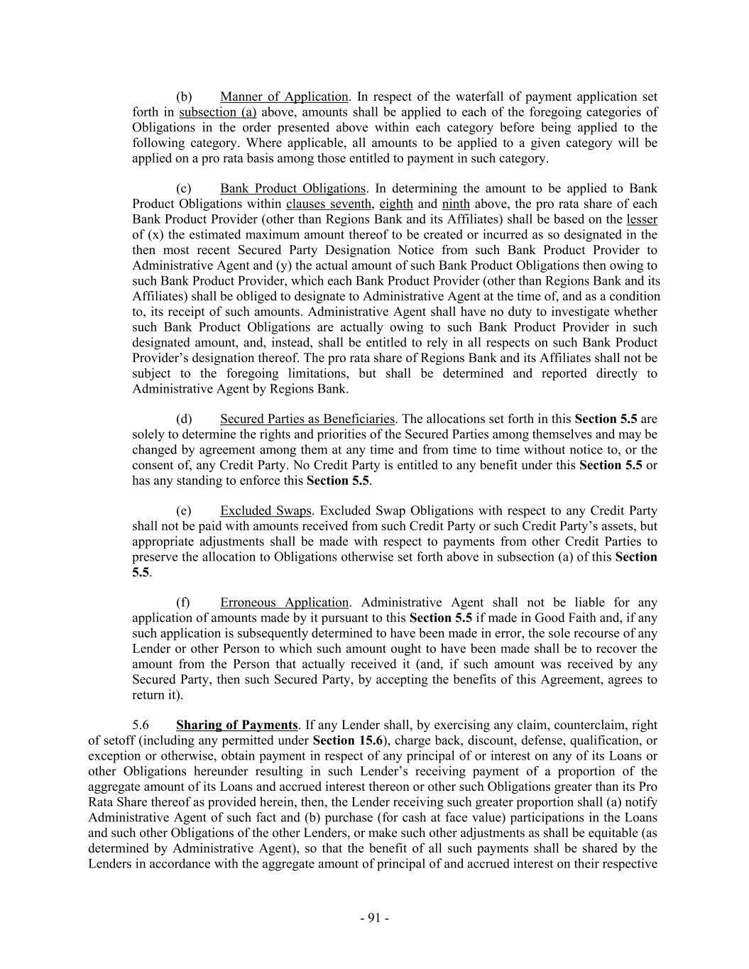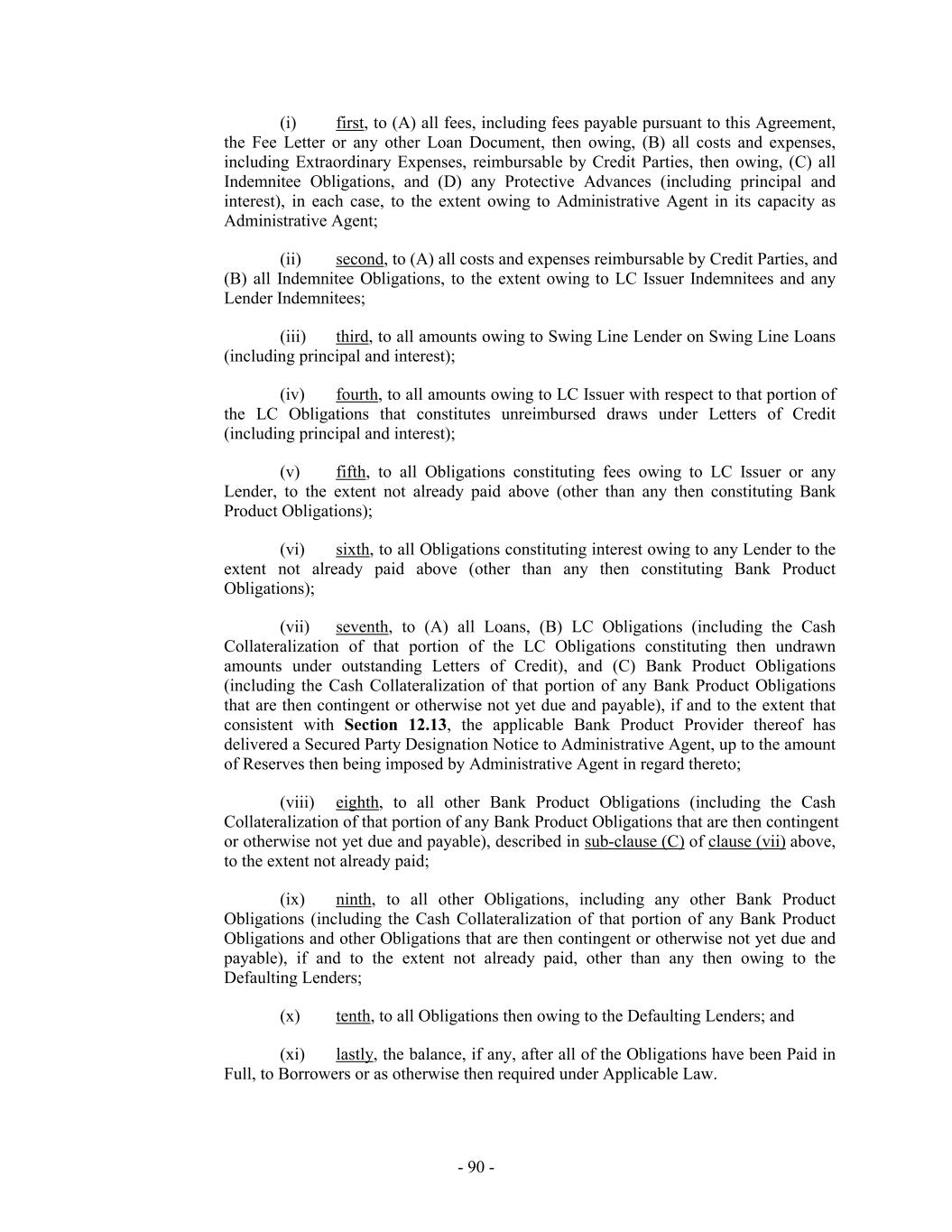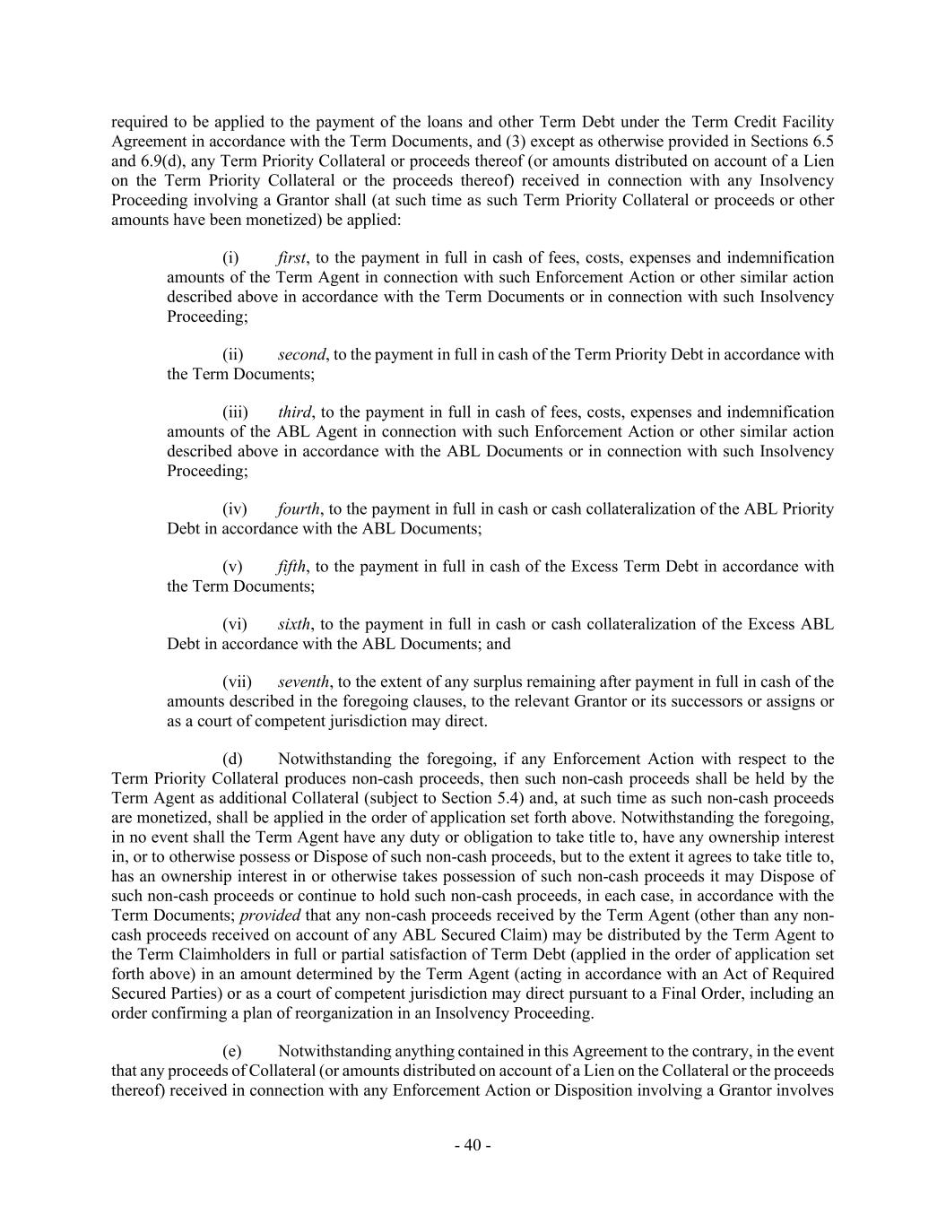 - 40 - required to be applied to the payment of the loans and other Term Debt under the Term Credit Facility Agreement in accordance with the Term Documents, and (3) except as otherwise provided in Sections 6.5 and 6.9(d), any Term Priority Collateral or proceeds thereof (or amounts distributed on account of a Lien on the Term Priority Collateral or the proceeds thereof) received in connection with any Insolvency Proceeding involving a Grantor shall (at such time as such Term Priority Collateral or proceeds or other amounts have been monetized) be applied: (i) first, to the payment in full in cash of fees, costs, expenses and indemnification amounts of the Term Agent in connection with such Enforcement Action or other similar action described above in accordance with the Term Documents or in connection with such Insolvency Proceeding; (ii) second, to the payment in full in cash of the Term Priority Debt in accordance with the Term Documents; (iii) third, to the payment in full in cash of fees, costs, expenses and indemnification amounts of the ABL Agent in connection with such Enforcement Action or other similar action described above in accordance with the ABL Documents or in connection with such Insolvency Proceeding; (iv) fourth, to the payment in full in cash or cash collateralization of the ABL Priority Debt in accordance with the ABL Documents; (v) fifth, to the payment in full in cash of the Excess Term Debt in accordance with the Term Documents; (vi) sixth, to the payment in full in cash or cash collateralization of the Excess ABL Debt in accordance with the ABL Documents; and (vii) seventh, to the extent of any surplus remaining after payment in full in cash of the amounts described in the foregoing clauses, to the relevant Grantor or its successors or assigns or as a court of competent jurisdiction may direct. (d) Notwithstanding the foregoing, if any Enforcement Action with respect to the Term Priority Collateral produces non-cash proceeds, then such non-cash proceeds shall be held by the Term Agent as additional Collateral (subject to Section 5.4) and, at such time as such non-cash proceeds are monetized, shall be applied in the order of application set forth above. Notwithstanding the foregoing, in no event shall the Term Agent have any duty or obligation to take title to, have any ownership interest in, or to otherwise possess or Dispose of such non-cash proceeds, but to the extent it agrees to take title to, has an ownership interest in or otherwise takes possession of such non-cash proceeds it may Dispose of such non-cash proceeds or continue to hold such non-cash proceeds, in each case, in accordance with the Term Documents; provided that any non-cash proceeds received by the Term Agent (other than any non- cash proceeds received on account of any ABL Secured Claim) may be distributed by the Term Agent to the Term Claimholders in full or partial satisfaction of Term Debt (applied in the order of application set forth above) in an amount determined by the Term Agent (acting in accordance with an Act of Required Secured Parties) or as a court of competent jurisdiction may direct pursuant to a Final Order, including an order confirming a plan of reorganization in an Insolvency Proceeding. (e) Notwithstanding anything contained in this Agreement to the contrary, in the event that any proceeds of Collateral (or amounts distributed on account of a Lien on the Collateral or the proceeds thereof) received in connection with any Enforcement Action or Disposition involving a Grantor involves