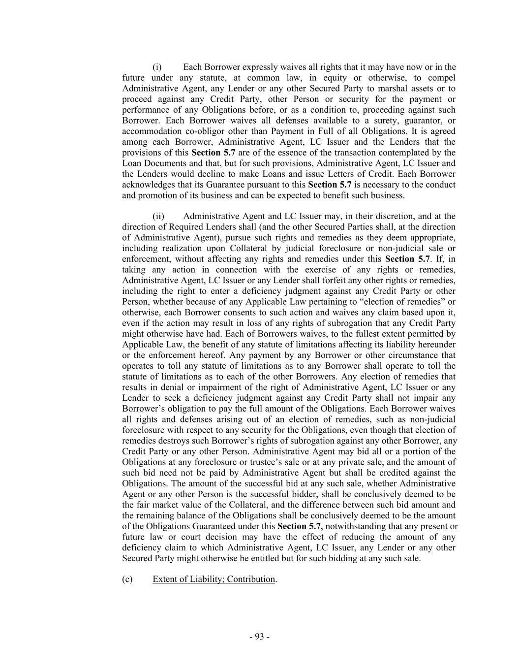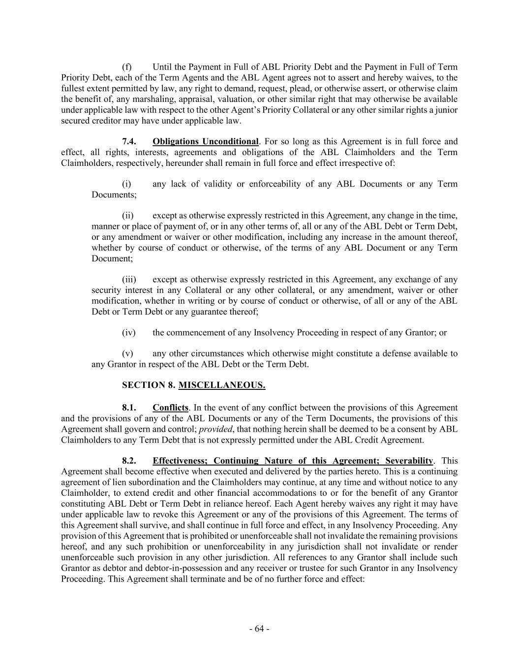 - 64 - (f) Until the Payment in Full of ABL Priority Debt and the Payment in Full of Term Priority Debt, each of the Term Agents and the ABL Agent agrees not to assert and hereby waives, to the fullest extent permitted by law, any right to demand, request, plead, or otherwise assert, or otherwise claim the benefit of, any marshaling, appraisal, valuation, or other similar right that may otherwise be available under applicable law with respect to the other Agent’s Priority Collateral or any other similar rights a junior secured creditor may have under applicable law. 7.4. Obligations Unconditional. For so long as this Agreement is in full force and effect, all rights, interests, agreements and obligations of the ABL Claimholders and the Term Claimholders, respectively, hereunder shall remain in full force and effect irrespective of: (i) any lack of validity or enforceability of any ABL Documents or any Term Documents; (ii) except as otherwise expressly restricted in this Agreement, any change in the time, manner or place of payment of, or in any other terms of, all or any of the ABL Debt or Term Debt, or any amendment or waiver or other modification, including any increase in the amount thereof, whether by course of conduct or otherwise, of the terms of any ABL Document or any Term Document; (iii) except as otherwise expressly restricted in this Agreement, any exchange of any security interest in any Collateral or any other collateral, or any amendment, waiver or other modification, whether in writing or by course of conduct or otherwise, of all or any of the ABL Debt or Term Debt or any guarantee thereof; (iv) the commencement of any Insolvency Proceeding in respect of any Grantor; or (v) any other circumstances which otherwise might constitute a defense available to any Grantor in respect of the ABL Debt or the Term Debt. SECTION 8. MISCELLANEOUS. 8.1. Conflicts. In the event of any conflict between the provisions of this Agreement and the provisions of any of the ABL Documents or any of the Term Documents, the provisions of this Agreement shall govern and control; provided, that nothing herein shall be deemed to be a consent by ABL Claimholders to any Term Debt that is not expressly permitted under the ABL Credit Agreement. 8.2. Effectiveness; Continuing Nature of this Agreement; Severability. This Agreement shall become effective when executed and delivered by the parties hereto. This is a continuing agreement of lien subordination and the Claimholders may continue, at any time and without notice to any Claimholder, to extend credit and other financial accommodations to or for the benefit of any Grantor constituting ABL Debt or Term Debt in reliance hereof. Each Agent hereby waives any right it may have under applicable law to revoke this Agreement or any of the provisions of this Agreement. The terms of this Agreement shall survive, and shall continue in full force and effect, in any Insolvency Proceeding. Any provision of this Agreement that is prohibited or unenforceable shall not invalidate the remaining provisions hereof, and any such prohibition or unenforceability in any jurisdiction shall not invalidate or render unenforceable such provision in any other jurisdiction. All references to any Grantor shall include such Grantor as debtor and debtor-in-possession and any receiver or trustee for such Grantor in any Insolvency Proceeding. This Agreement shall terminate and be of no further force and effect: