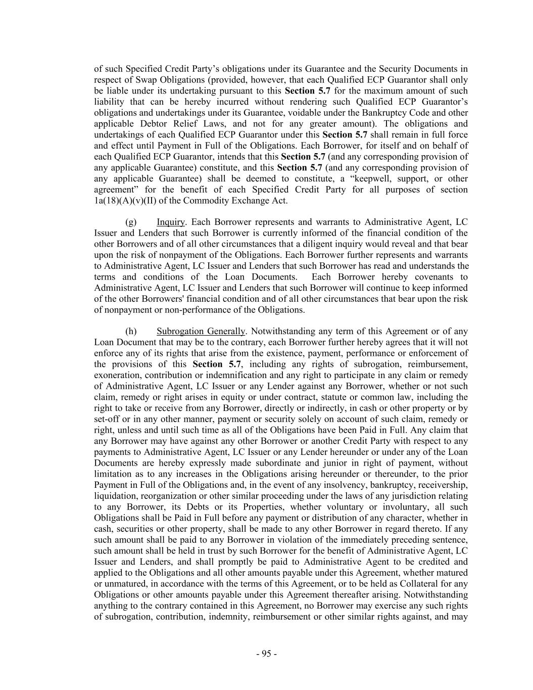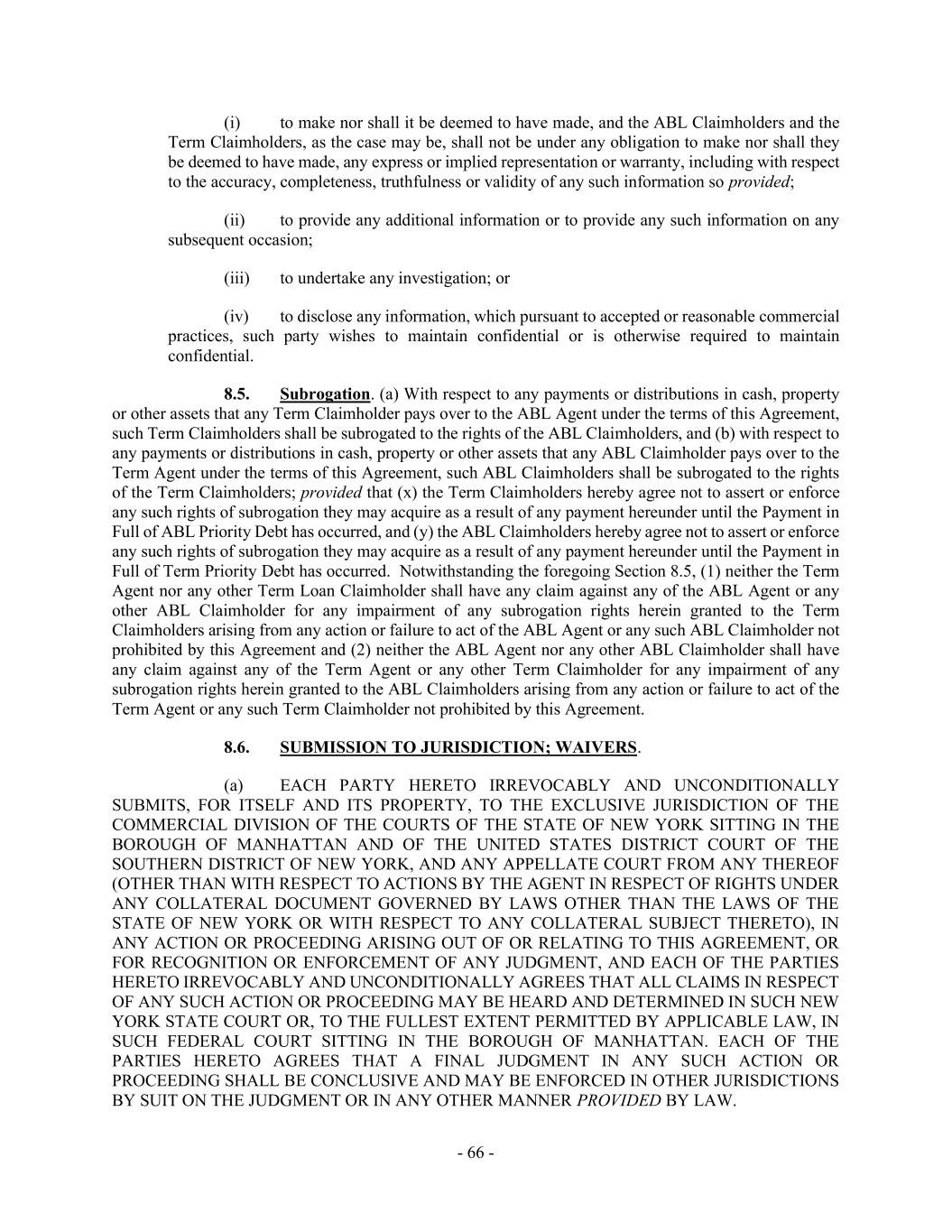 - 66 - (i) to make nor shall it be deemed to have made, and the ABL Claimholders and the Term Claimholders, as the case may be, shall not be under any obligation to make nor shall they be deemed to have made, any express or implied representation or warranty, including with respect to the accuracy, completeness, truthfulness or validity of any such information so provided; (ii) to provide any additional information or to provide any such information on any subsequent occasion; (iii) to undertake any investigation; or (iv) to disclose any information, which pursuant to accepted or reasonable commercial practices, such party wishes to maintain confidential or is otherwise required to maintain confidential. 8.5. Subrogation. (a) With respect to any payments or distributions in cash, property or other assets that any Term Claimholder pays over to the ABL Agent under the terms of this Agreement, such Term Claimholders shall be subrogated to the rights of the ABL Claimholders, and (b) with respect to any payments or distributions in cash, property or other assets that any ABL Claimholder pays over to the Term Agent under the terms of this Agreement, such ABL Claimholders shall be subrogated to the rights of the Term Claimholders; provided that (x) the Term Claimholders hereby agree not to assert or enforce any such rights of subrogation they may acquire as a result of any payment hereunder until the Payment in Full of ABL Priority Debt has occurred, and (y) the ABL Claimholders hereby agree not to assert or enforce any such rights of subrogation they may acquire as a result of any payment hereunder until the Payment in Full of Term Priority Debt has occurred. Notwithstanding the foregoing Section 8.5, (1) neither the Term Agent nor any other Term Loan Claimholder shall have any claim against any of the ABL Agent or any other ABL Claimholder for any impairment of any subrogation rights herein granted to the Term Claimholders arising from any action or failure to act of the ABL Agent or any such ABL Claimholder not prohibited by this Agreement and (2) neither the ABL Agent nor any other ABL Claimholder shall have any claim against any of the Term Agent or any other Term Claimholder for any impairment of any subrogation rights herein granted to the ABL Claimholders arising from any action or failure to act of the Term Agent or any such Term Claimholder not prohibited by this Agreement. 8.6. SUBMISSION TO JURISDICTION; WAIVERS. (a) EACH PARTY HERETO IRREVOCABLY AND UNCONDITIONALLY SUBMITS, FOR ITSELF AND ITS PROPERTY, TO THE EXCLUSIVE JURISDICTION OF THE COMMERCIAL DIVISION OF THE COURTS OF THE STATE OF NEW YORK SITTING IN THE BOROUGH OF MANHATTAN AND OF THE UNITED STATES DISTRICT COURT OF THE SOUTHERN DISTRICT OF NEW YORK, AND ANY APPELLATE COURT FROM ANY THEREOF (OTHER THAN WITH RESPECT TO ACTIONS BY THE AGENT IN RESPECT OF RIGHTS UNDER ANY COLLATERAL DOCUMENT GOVERNED BY LAWS OTHER THAN THE LAWS OF THE STATE OF NEW YORK OR WITH RESPECT TO ANY COLLATERAL SUBJECT THERETO), IN ANY ACTION OR PROCEEDING ARISING OUT OF OR RELATING TO THIS AGREEMENT, OR FOR RECOGNITION OR ENFORCEMENT OF ANY JUDGMENT, AND EACH OF THE PARTIES HERETO IRREVOCABLY AND UNCONDITIONALLY AGREES THAT ALL CLAIMS IN RESPECT OF ANY SUCH ACTION OR PROCEEDING MAY BE HEARD AND DETERMINED IN SUCH NEW YORK STATE COURT OR, TO THE FULLEST EXTENT PERMITTED BY APPLICABLE LAW, IN SUCH FEDERAL COURT SITTING IN THE BOROUGH OF MANHATTAN. EACH OF THE PARTIES HERETO AGREES THAT A FINAL JUDGMENT IN ANY SUCH ACTION OR PROCEEDING SHALL BE CONCLUSIVE AND MAY BE ENFORCED IN OTHER JURISDICTIONS BY SUIT ON THE JUDGMENT OR IN ANY OTHER MANNER PROVIDED BY LAW.