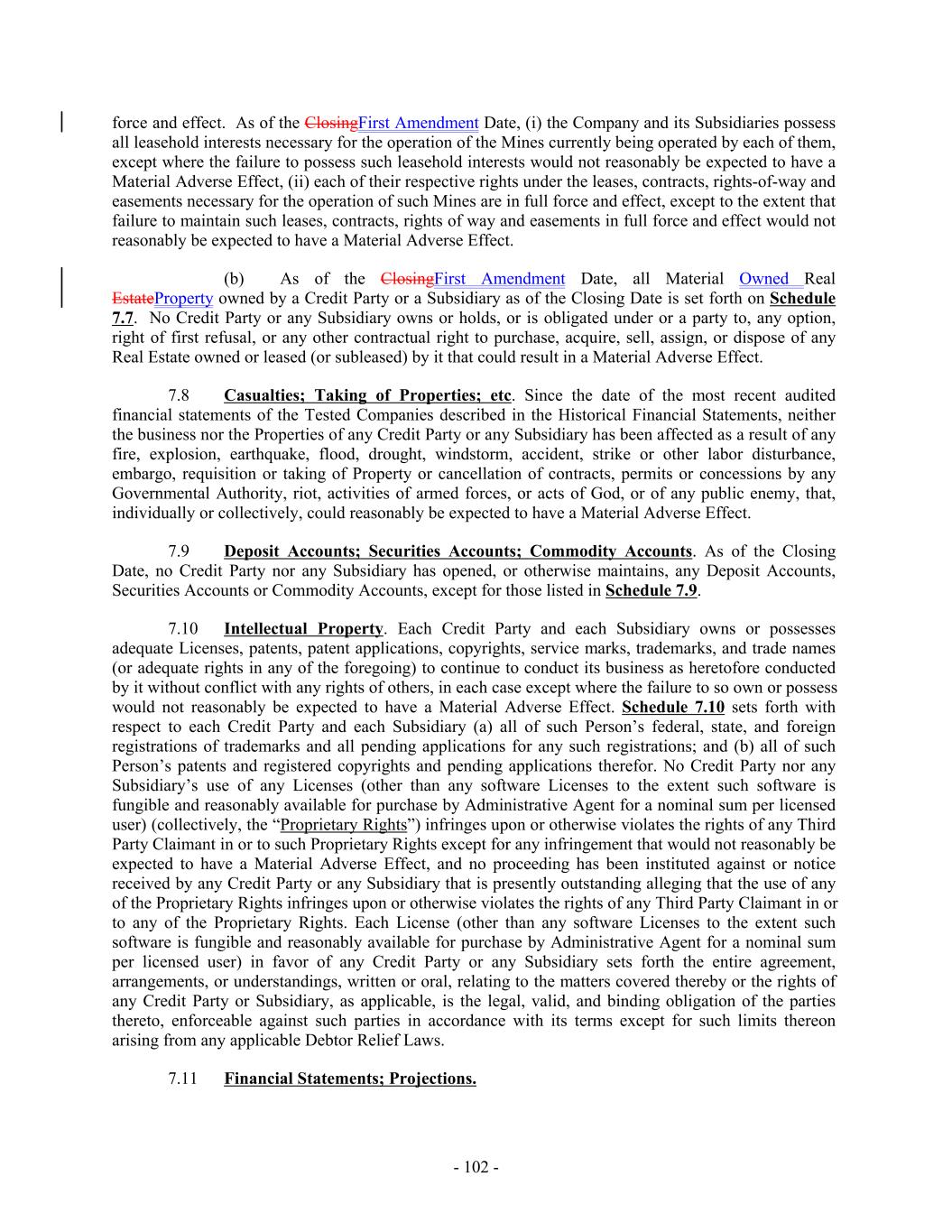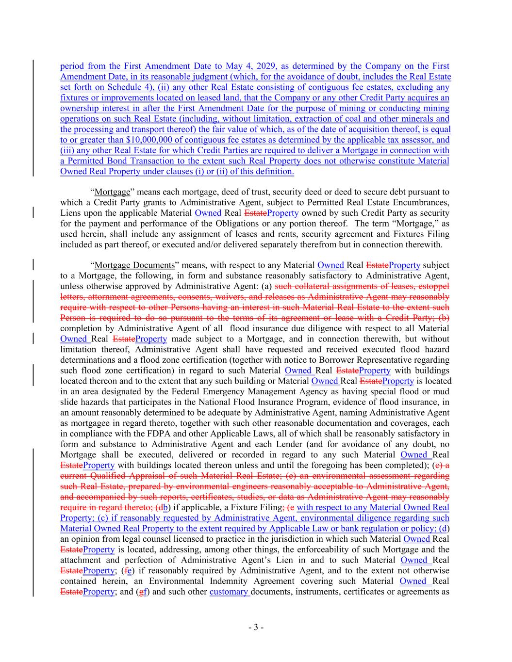 period from the First Amendment Date to May 4, 2029, as determined by the Company on the First Amendment Date, in its reasonable judgment (which, for the avoidance of doubt, includes the Real Estate set forth on Schedule 4), (ii) any other Real Estate consisting of contiguous fee estates, excluding any fixtures or improvements located on leased land, that the Company or any other Credit Party acquires an ownership interest in after the First Amendment Date for the purpose of mining or conducting mining operations on such Real Estate (including, without limitation, extraction of coal and other minerals and the processing and transport thereof) the fair value of which, as of the date of acquisition thereof, is equal to or greater than $10,000,000 of contiguous fee estates as determined by the applicable tax assessor, and (iii) any other Real Estate for which Credit Parties are required to deliver a Mortgage in connection with a Permitted Bond Transaction to the extent such Real Property does not otherwise constitute Material Owned Real Property under clauses (i) or (ii) of this definition. “Mortgage” means each mortgage, deed of trust, security deed or deed to secure debt pursuant to which a Credit Party grants to Administrative Agent, subject to Permitted Real Estate Encumbrances, Liens upon the applicable Material Owned Real EstateProperty owned by such Credit Party as security for the payment and performance of the Obligations or any portion thereof. The term “Mortgage,” as used herein, shall include any assignment of leases and rents, security agreement and Fixtures Filing included as part thereof, or executed and/or delivered separately therefrom but in connection therewith. “Mortgage Documents” means, with respect to any Material Owned Real EstateProperty subject to a Mortgage, the following, in form and substance reasonably satisfactory to Administrative Agent, unless otherwise approved by Administrative Agent: (a) such collateral assignments of leases, estoppel letters, attornment agreements, consents, waivers, and releases as Administrative Agent may reasonably require with respect to other Persons having an interest in such Material Real Estate to the extent such Person is required to do so pursuant to the terms of its agreement or lease with a Credit Party; (b) completion by Administrative Agent of all flood insurance due diligence with respect to all Material Owned Real EstateProperty made subject to a Mortgage, and in connection therewith, but without limitation thereof, Administrative Agent shall have requested and received executed flood hazard determinations and a flood zone certification (together with notice to Borrower Representative regarding such flood zone certification) in regard to such Material Owned Real EstateProperty with buildings located thereon and to the extent that any such building or Material Owned Real EstateProperty is located in an area designated by the Federal Emergency Management Agency as having special flood or mud slide hazards that participates in the National Flood Insurance Program, evidence of flood insurance, in an amount reasonably determined to be adequate by Administrative Agent, naming Administrative Agent as mortgagee in regard thereto, together with such other reasonable documentation and coverages, each in compliance with the FDPA and other Applicable Laws, all of which shall be reasonably satisfactory in form and substance to Administrative Agent and each Lender (and for avoidance of any doubt, no Mortgage shall be executed, delivered or recorded in regard to any such Material Owned Real EstateProperty with buildings located thereon unless and until the foregoing has been completed); (c) a current Qualified Appraisal of such Material Real Estate; (e) an environmental assessment regarding such Real Estate, prepared by environmental engineers reasonably acceptable to Administrative Agent, and accompanied by such reports, certificates, studies, or data as Administrative Agent may reasonably require in regard thereto; (db) if applicable, a Fixture Filing; (e with respect to any Material Owned Real Property; (c) if reasonably requested by Administrative Agent, environmental diligence regarding such Material Owned Real Property to the extent required by Applicable Law or bank regulation or policy; (d) an opinion from legal counsel licensed to practice in the jurisdiction in which such Material Owned Real EstateProperty is located, addressing, among other things, the enforceability of such Mortgage and the attachment and perfection of Administrative Agent’s Lien in and to such Material Owned Real EstateProperty; (fe) if reasonably required by Administrative Agent, and to the extent not otherwise contained herein, an Environmental Indemnity Agreement covering such Material Owned Real EstateProperty; and (gf) and such other customary documents, instruments, certificates or agreements as - 3 -