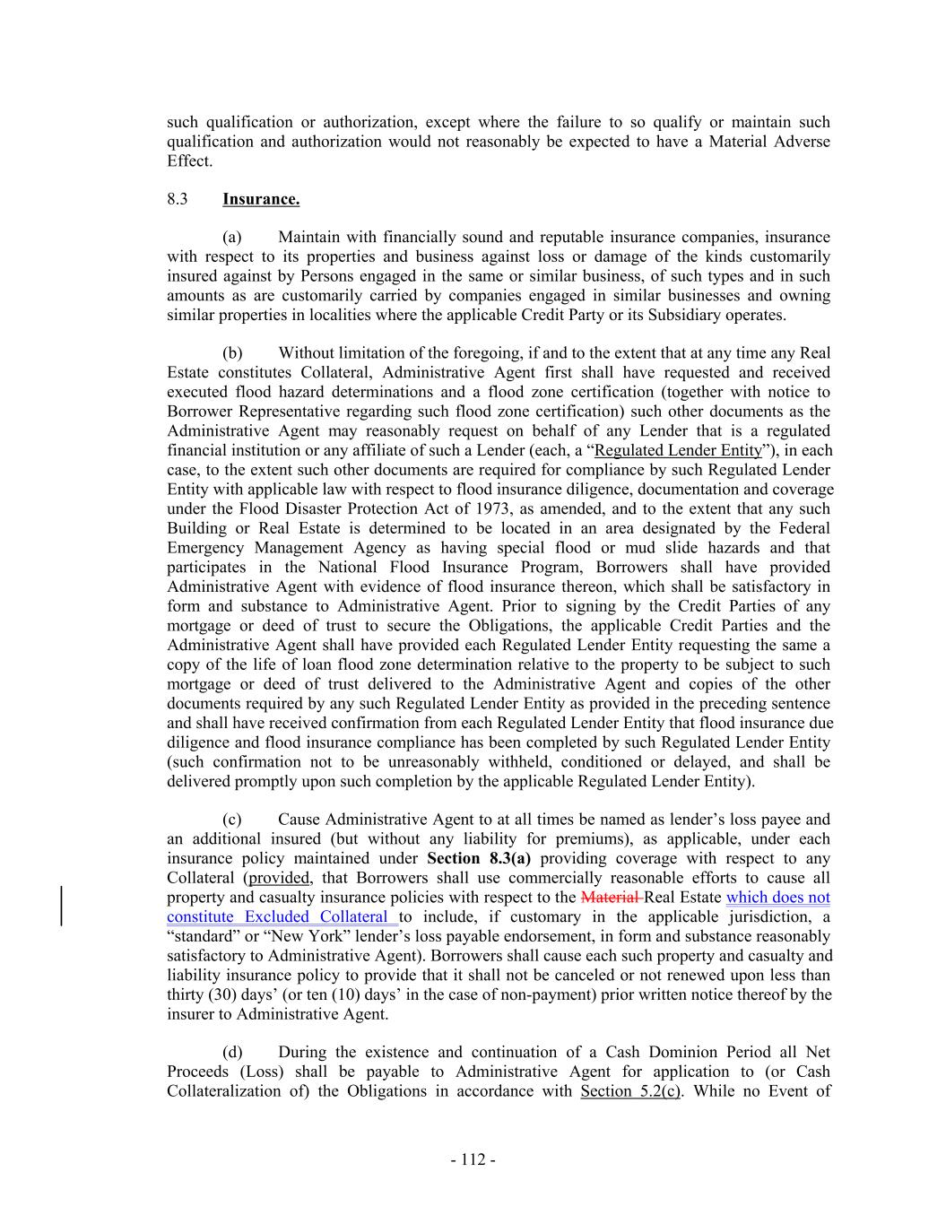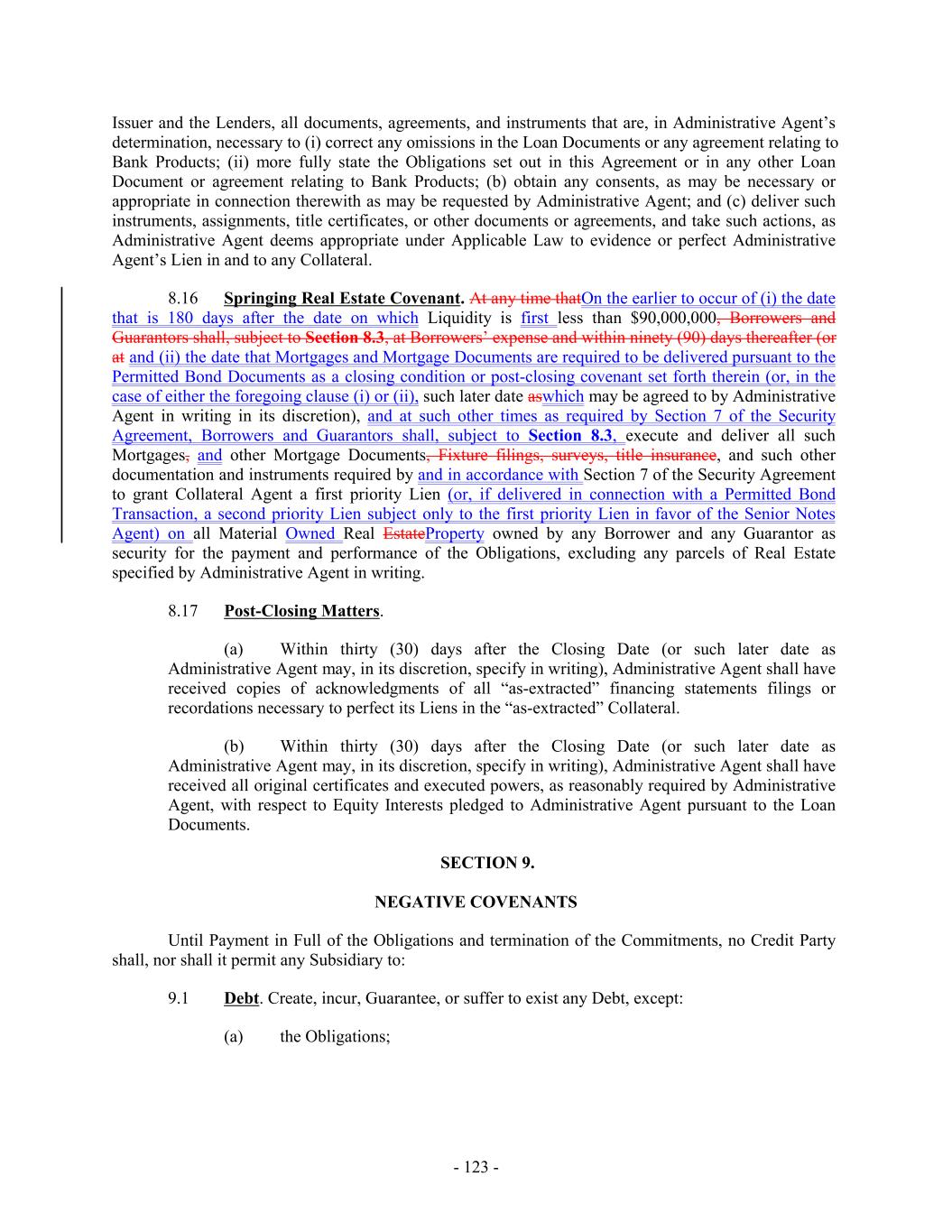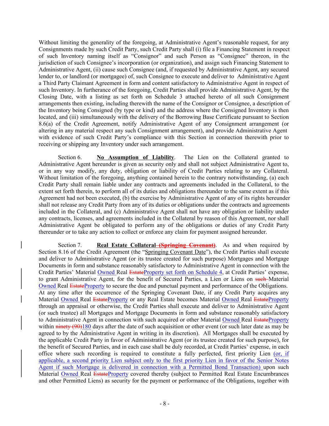 Without limiting the generality of the foregoing, at Administrative Agent’s reasonable request, for any Consignments made by such Credit Party, such Credit Party shall (i) file a Financing Statement in respect of such Inventory naming itself as “Consignor” and such Person as “Consignee” thereon, in the jurisdiction of such Consignee’s incorporation (or organization), and assign such Financing Statement to Administrative Agent, (ii) cause such Consignee (and, if requested by Administrative Agent, any secured lender to, or landlord (or mortgagee) of, such Consignee to execute and deliver to Administrative Agent a Third Party Claimant Agreement in form and content satisfactory to Administrative Agent in respect of such Inventory. In furtherance of the foregoing, Credit Parties shall provide Administrative Agent, by the Closing Date, with a listing as set forth on Schedule 3 attached hereto of all such Consignment arrangements then existing, including therewith the name of the Consignor or Consignee, a description of the Inventory being Consigned (by type or kind) and the address where the Consigned Inventory is then located, and (iii) simultaneously with the delivery of the Borrowing Base Certificate pursuant to Section 8.6(a) of the Credit Agreement, notify Administrative Agent of any Consignment arrangement (or altering in any material respect any such Consignment arrangement), and provide Administrative Agent with evidence of such Credit Party’s compliance with this Section in connection therewith prior to receiving or shipping any Inventory under such arrangement. Section 6. No Assumption of Liability. The Lien on the Collateral granted to Administrative Agent hereunder is given as security only and shall not subject Administrative Agent to, or in any way modify, any duty, obligation or liability of Credit Parties relating to any Collateral. Without limitation of the foregoing, anything contained herein to the contrary notwithstanding, (a) each Credit Party shall remain liable under any contracts and agreements included in the Collateral, to the extent set forth therein, to perform all of its duties and obligations thereunder to the same extent as if this Agreement had not been executed, (b) the exercise by Administrative Agent of any of its rights hereunder shall not release any Credit Party from any of its duties or obligations under the contracts and agreements included in the Collateral, and (c) Administrative Agent shall not have any obligation or liability under any contracts, licenses, and agreements included in the Collateral by reason of this Agreement, nor shall Administrative Agent be obligated to perform any of the obligations or duties of any Credit Party thereunder or to take any action to collect or enforce any claim for payment assigned hereunder. Section 7. Real Estate Collateral (Springing Covenant). As and when required by Section 8.16 of the Credit Agreement (the “Springing Covenant Date”), the Credit Parties shall execute and deliver to Administrative Agent (or its trustee created for such purpose) Mortgages and Mortgage Documents in form and substance reasonably satisfactory to Administrative Agent in connection with the Credit Parties’ Material Owned Real EstateProperty set forth on Schedule 4, at Credit Parties’ expense, to grant Administrative Agent, for the benefit of Secured Parties, a Lien or Liens on such Material Owned Real EstateProperty to secure the due and punctual payment and performance of the Obligations. At any time after the occurrence of the Springing Covenant Date, if any Credit Party acquires any Material Owned Real EstateProperty or any Real Estate becomes Material Owned Real EstateProperty through an appraisal or otherwise, the Credit Parties shall execute and deliver to Administrative Agent (or such trustee) all Mortgages and Mortgage Documents in form and substance reasonably satisfactory to Administrative Agent in connection with such acquired or other Material Owned Real EstateProperty within ninety (90)180 days after the date of such acquisition or other event (or such later date as may be agreed to by the Administrative Agent in writing in its discretion). All Mortgages shall be executed by the applicable Credit Party in favor of Administrative Agent (or its trustee created for such purpose), for the benefit of Secured Parties, and in each case shall be duly recorded, at Credit Parties’ expense, in each office where such recording is required to constitute a fully perfected, first priority Lien (or, if applicable, a second priority Lien subject only to the first priority Lien in favor of the Senior Notes Agent if such Mortgage is delivered in connection with a Permitted Bond Transaction) upon such Material Owned Real EstateProperty covered thereby (subject to Permitted Real Estate Encumbrances and other Permitted Liens) as security for the payment or performance of the Obligations, together with - 8 -