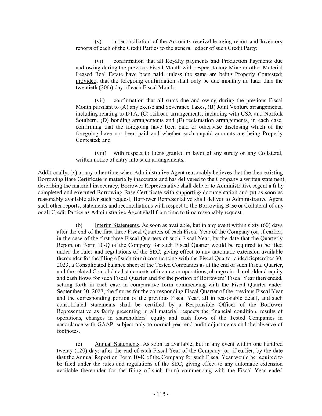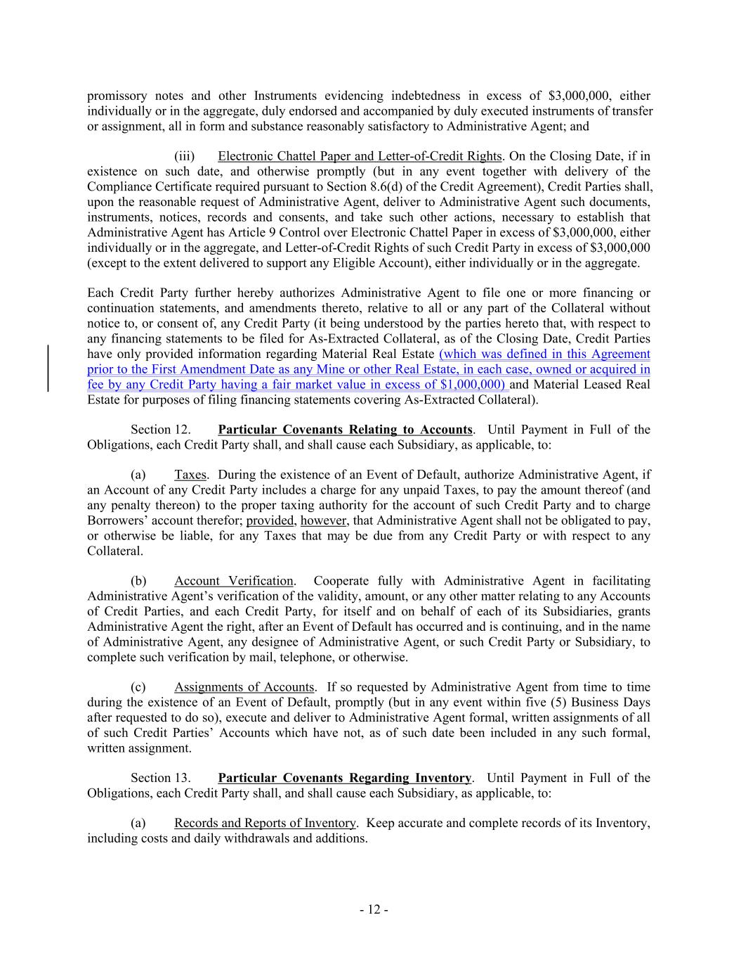 promissory notes and other Instruments evidencing indebtedness in excess of $3,000,000, either individually or in the aggregate, duly endorsed and accompanied by duly executed instruments of transfer or assignment, all in form and substance reasonably satisfactory to Administrative Agent; and (iii) Electronic Chattel Paper and Letter-of-Credit Rights. On the Closing Date, if in existence on such date, and otherwise promptly (but in any event together with delivery of the Compliance Certificate required pursuant to Section 8.6(d) of the Credit Agreement), Credit Parties shall, upon the reasonable request of Administrative Agent, deliver to Administrative Agent such documents, instruments, notices, records and consents, and take such other actions, necessary to establish that Administrative Agent has Article 9 Control over Electronic Chattel Paper in excess of $3,000,000, either individually or in the aggregate, and Letter-of-Credit Rights of such Credit Party in excess of $3,000,000 (except to the extent delivered to support any Eligible Account), either individually or in the aggregate. Each Credit Party further hereby authorizes Administrative Agent to file one or more financing or continuation statements, and amendments thereto, relative to all or any part of the Collateral without notice to, or consent of, any Credit Party (it being understood by the parties hereto that, with respect to any financing statements to be filed for As-Extracted Collateral, as of the Closing Date, Credit Parties have only provided information regarding Material Real Estate (which was defined in this Agreement prior to the First Amendment Date as any Mine or other Real Estate, in each case, owned or acquired in fee by any Credit Party having a fair market value in excess of $1,000,000) and Material Leased Real Estate for purposes of filing financing statements covering As-Extracted Collateral). Section 12. Particular Covenants Relating to Accounts. Until Payment in Full of the Obligations, each Credit Party shall, and shall cause each Subsidiary, as applicable, to: (a) Taxes. During the existence of an Event of Default, authorize Administrative Agent, if an Account of any Credit Party includes a charge for any unpaid Taxes, to pay the amount thereof (and any penalty thereon) to the proper taxing authority for the account of such Credit Party and to charge Borrowers’ account therefor; provided, however, that Administrative Agent shall not be obligated to pay, or otherwise be liable, for any Taxes that may be due from any Credit Party or with respect to any Collateral. (b) Account Verification. Cooperate fully with Administrative Agent in facilitating Administrative Agent’s verification of the validity, amount, or any other matter relating to any Accounts of Credit Parties, and each Credit Party, for itself and on behalf of each of its Subsidiaries, grants Administrative Agent the right, after an Event of Default has occurred and is continuing, and in the name of Administrative Agent, any designee of Administrative Agent, or such Credit Party or Subsidiary, to complete such verification by mail, telephone, or otherwise. (c) Assignments of Accounts. If so requested by Administrative Agent from time to time during the existence of an Event of Default, promptly (but in any event within five (5) Business Days after requested to do so), execute and deliver to Administrative Agent formal, written assignments of all of such Credit Parties’ Accounts which have not, as of such date been included in any such formal, written assignment. Section 13. Particular Covenants Regarding Inventory. Until Payment in Full of the Obligations, each Credit Party shall, and shall cause each Subsidiary, as applicable, to: (a) Records and Reports of Inventory. Keep accurate and complete records of its Inventory, including costs and daily withdrawals and additions. - 12 -