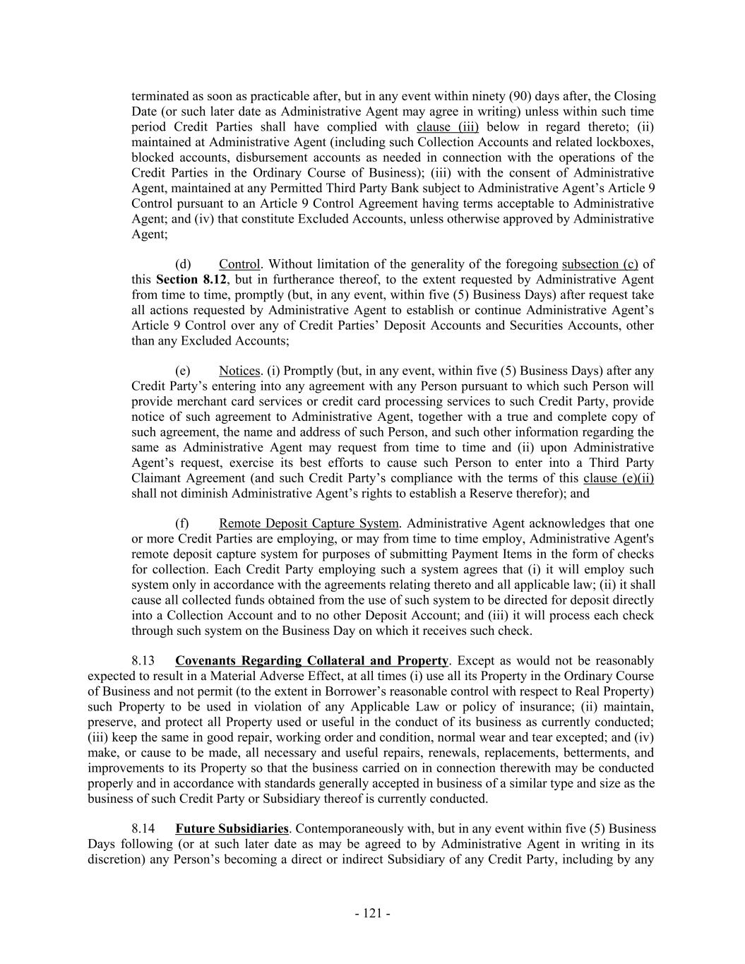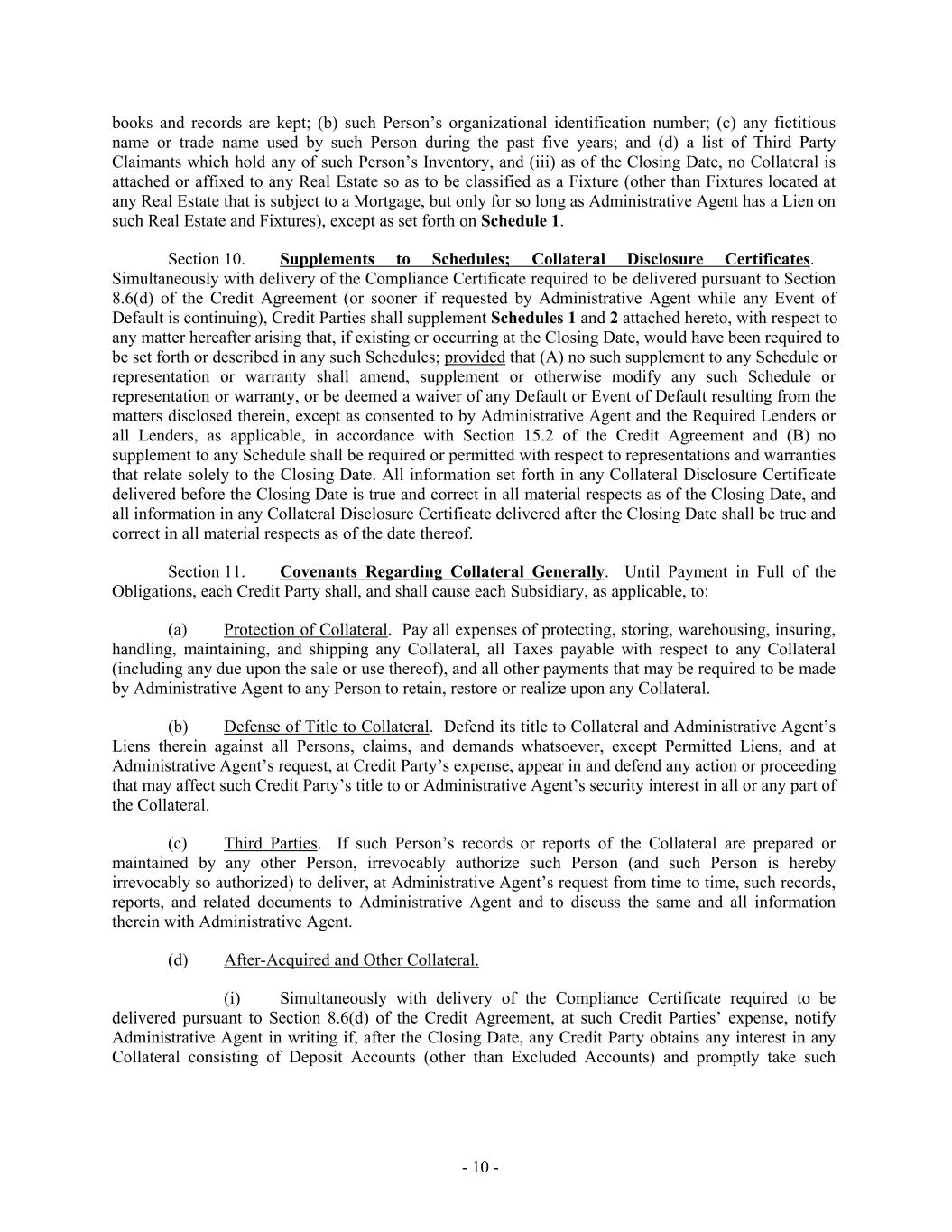 books and records are kept; (b) such Person’s organizational identification number; (c) any fictitious name or trade name used by such Person during the past five years; and (d) a list of Third Party Claimants which hold any of such Person’s Inventory, and (iii) as of the Closing Date, no Collateral is attached or affixed to any Real Estate so as to be classified as a Fixture (other than Fixtures located at any Real Estate that is subject to a Mortgage, but only for so long as Administrative Agent has a Lien on such Real Estate and Fixtures), except as set forth on Schedule 1. Section 10. Supplements to Schedules; Collateral Disclosure Certificates. Simultaneously with delivery of the Compliance Certificate required to be delivered pursuant to Section 8.6(d) of the Credit Agreement (or sooner if requested by Administrative Agent while any Event of Default is continuing), Credit Parties shall supplement Schedules 1 and 2 attached hereto, with respect to any matter hereafter arising that, if existing or occurring at the Closing Date, would have been required to be set forth or described in any such Schedules; provided that (A) no such supplement to any Schedule or representation or warranty shall amend, supplement or otherwise modify any such Schedule or representation or warranty, or be deemed a waiver of any Default or Event of Default resulting from the matters disclosed therein, except as consented to by Administrative Agent and the Required Lenders or all Lenders, as applicable, in accordance with Section 15.2 of the Credit Agreement and (B) no supplement to any Schedule shall be required or permitted with respect to representations and warranties that relate solely to the Closing Date. All information set forth in any Collateral Disclosure Certificate delivered before the Closing Date is true and correct in all material respects as of the Closing Date, and all information in any Collateral Disclosure Certificate delivered after the Closing Date shall be true and correct in all material respects as of the date thereof. Section 11. Covenants Regarding Collateral Generally. Until Payment in Full of the Obligations, each Credit Party shall, and shall cause each Subsidiary, as applicable, to: (a) Protection of Collateral. Pay all expenses of protecting, storing, warehousing, insuring, handling, maintaining, and shipping any Collateral, all Taxes payable with respect to any Collateral (including any due upon the sale or use thereof), and all other payments that may be required to be made by Administrative Agent to any Person to retain, restore or realize upon any Collateral. (b) Defense of Title to Collateral. Defend its title to Collateral and Administrative Agent’s Liens therein against all Persons, claims, and demands whatsoever, except Permitted Liens, and at Administrative Agent’s request, at Credit Party’s expense, appear in and defend any action or proceeding that may affect such Credit Party’s title to or Administrative Agent’s security interest in all or any part of the Collateral. (c) Third Parties. If such Person’s records or reports of the Collateral are prepared or maintained by any other Person, irrevocably authorize such Person (and such Person is hereby irrevocably so authorized) to deliver, at Administrative Agent’s request from time to time, such records, reports, and related documents to Administrative Agent and to discuss the same and all information therein with Administrative Agent. (d) After-Acquired and Other Collateral. (i) Simultaneously with delivery of the Compliance Certificate required to be delivered pursuant to Section 8.6(d) of the Credit Agreement, at such Credit Parties’ expense, notify Administrative Agent in writing if, after the Closing Date, any Credit Party obtains any interest in any Collateral consisting of Deposit Accounts (other than Excluded Accounts) and promptly take such - 10 -