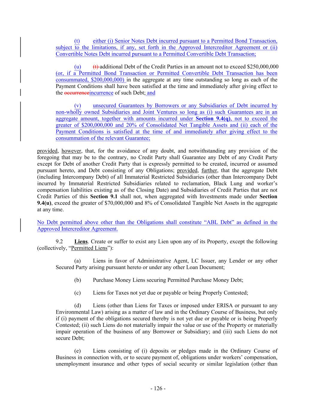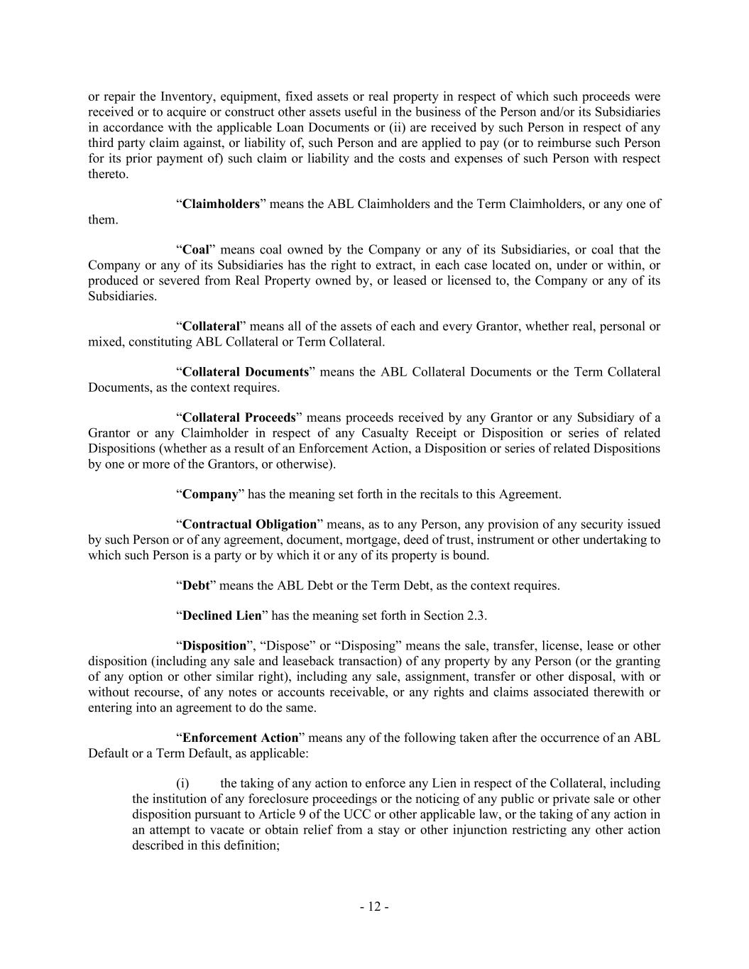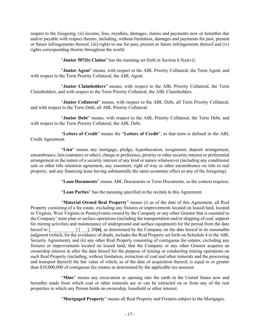 - 17 - respect to the foregoing, (ii) income, fees, royalties, damages, claims and payments now or hereafter due and/or payable with respect thereto, including, without limitation, damages and payments for past, present or future infringements thereof, (iii) rights to sue for past, present or future infringements thereof and (iv) rights corresponding thereto throughout the world. “Junior 507(b) Claims” has the meaning set forth in Section 6.5(a)(vi). “Junior Agent” means, with respect to the ABL Priority Collateral, the Term Agent, and with respect to the Term Priority Collateral, the ABL Agent. “Junior Claimholders” means, with respect to the ABL Priority Collateral, the Term Claimholders, and with respect to the Term Priority Collateral, the ABL Claimholders. “Junior Collateral” means, with respect to the ABL Debt, all Term Priority Collateral, and with respect to the Term Debt, all ABL Priority Collateral. “Junior Debt” means, with respect to the ABL Priority Collateral, the Term Debt, and with respect to the Term Priority Collateral, the ABL Debt. “Letters of Credit” means the “Letters of Credit”, as that term is defined in the ABL Credit Agreement. “Lien” means any mortgage, pledge, hypothecation, assignment, deposit arrangement, encumbrance, lien (statutory or other), charge or preference, priority or other security interest or preferential arrangement in the nature of a security interest of any kind or nature whatsoever (including any conditional sale or other title retention agreement, any easement, right of way or other encumbrance on title to real property, and any financing lease having substantially the same economic effect as any of the foregoing). “Loan Documents” means ABL Documents or Term Documents, as the context requires. “Loan Parties” has the meaning specified in the recitals to this Agreement. “Material Owned Real Property” means (i) as of the date of this Agreement, all Real Property consisting of a fee estate, excluding any fixtures or improvements located on leased land, located in Virginia, West Virginia or Pennsylvania owned by the Company or any other Grantor that is essential to the Company’ mine plan or surface operations (including the transportation and/or shipping of coal, support for mining activities and maintenance of underground and surface equipment) for the period from the date hereof to [___________] [___], 20[], as determined by the Company on the date hereof in its reasonable judgment (which, for the avoidance of doubt, includes the Real Property set forth on Schedule 4 to the ABL Security Agreement), and (ii) any other Real Property consisting of contiguous fee estates, excluding any fixtures or improvements located on leased land, that the Company or any other Grantor acquires an ownership interest in after the date hereof for the purpose of mining or conducting mining operations on such Real Property (including, without limitation, extraction of coal and other minerals and the processing and transport thereof) the fair value of which, as of the date of acquisition thereof, is equal to or greater than $10,000,000 of contiguous fee estates as determined by the applicable tax assessor. “Mine” means any excavation or opening into the earth in the United States now and hereafter made from which coal or other minerals are or can be extracted on or from any of the real properties in which any Person holds an ownership, leasehold or other interest. “Mortgaged Property” means all Real Property and Fixtures subject to the Mortgages.