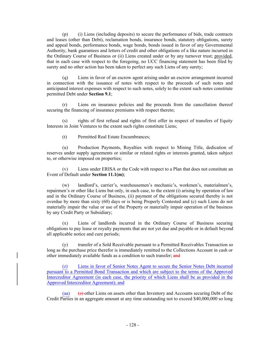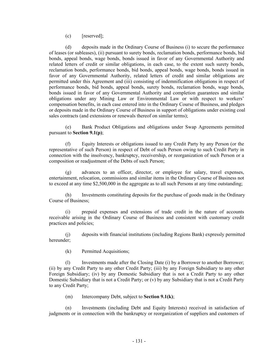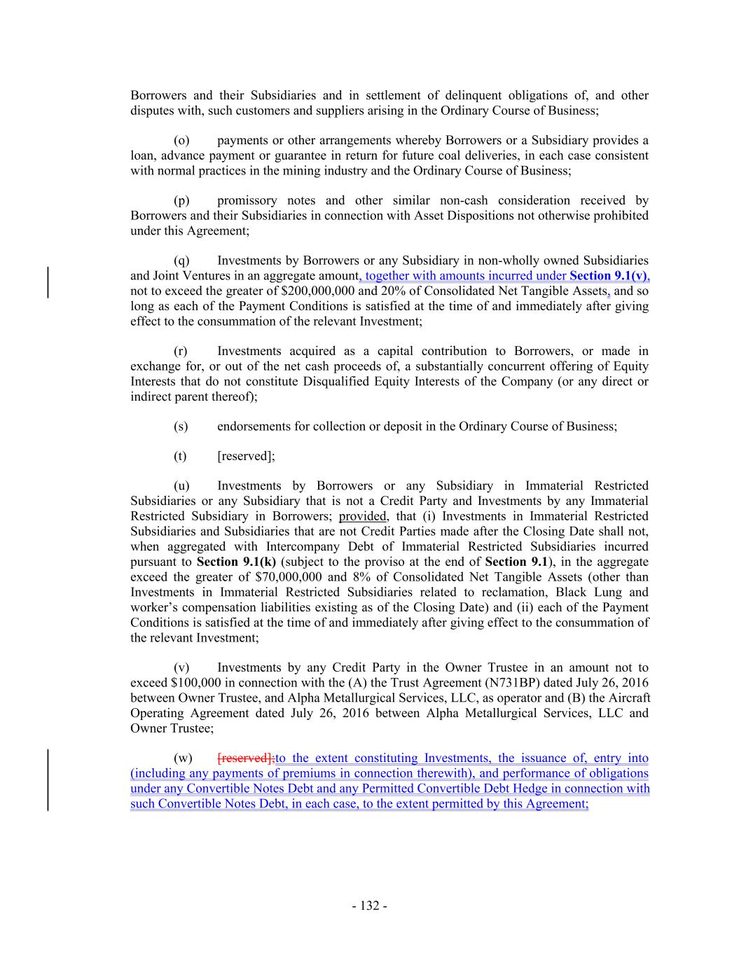 aggregate fair market value of such Designated Non-Cash Consideration, as reasonably determined by the applicable Borrower in good faith, taken together with the fair market value at the time of receipt of all other Designated Non-Cash Consideration received pursuant to this clause (m) during the term of this Agreement shall not exceed $10,000,000; (n) any Investment permitted pursuant to Sections 9.4(q) or 9.4(x) which constitutes an Asset Disposition; (o) to the extent allowable under Section 1031 of the Code, or any comparable or successor provision, any like kind exchange of property for use in a line of business that is not violative of Section 9.7(j); (p) (i) any surrender or waiver of contractual rights or the settlement, release, or surrender of contractual rights or other litigation claims in the Ordinary Course of Business or (ii) any settlement, discount, write off, forgiveness, or cancellation of any Debt owing by any present or former directors, officers, or employees of any Borrower or any Subsidiary or any of their successors or assigns; (q) other than Material Real Estate which does not constitute Excluded Collateral, the sale of Real Estate by Borrowers and their Subsidiaries solely to the extent that such Real Estate is not necessary for the normal conduct of operations of Borrowers and their Subsidiaries and so long as no Inventory is located at such Real Estate; (r) so long as no Cash Dominion Period exists at the time of such Asset Disposition (or would commence if Borrowers were required to deliver a Borrowing Base Certificate immediately after consummation of such Asset Disposition), the sale of Material Real Estate which does not constitute Excluded Collateral; (s) Permitted Asset Swaps; (t) Asset Dispositions of Sold Receivables pursuant to any Permitted Receivables Transaction; and (u) the assignment of a lease, in whole or in part, of Property that is subject to a Contract Mining and Reclamation Agreement by and between any Credit Party or Subsidiary and Lexington Coal Company, LLC, as part of which such Credit Party or Subsidiary may pay to the assignee cash or non-cash consideration that, in the reasonable judgment of such Credit Party or Subsidiary, is fair and reasonable in the circumstances and provided that each of the Payment Conditions shall have been satisfied at the time of and immediately after giving effect to payment thereof. “Permitted Asset Swap” means the substantially concurrent purchase and sale, trade-in or exchange of Equipment or Real Estate or a combination of such Equipment or Real Estate and cash or Cash Equivalents between any Borrower or any Guarantor and another Person; provided, that the fair market value of the Equipment or Real Estate received is at least as great as the fair market value of the Equipment or Real Estate being traded-in or exchanged as determined by the Borrower Representative reasonably and in good faith; provided, that any shortfall may be treated as an Investment and shall constitute an Investment for purposes of calculation compliance with Section 9.4. “Permitted Receivables Transaction” means that certain receivables transaction between one or more Borrowers and , and pursuant to which certain Accounts - 46 -